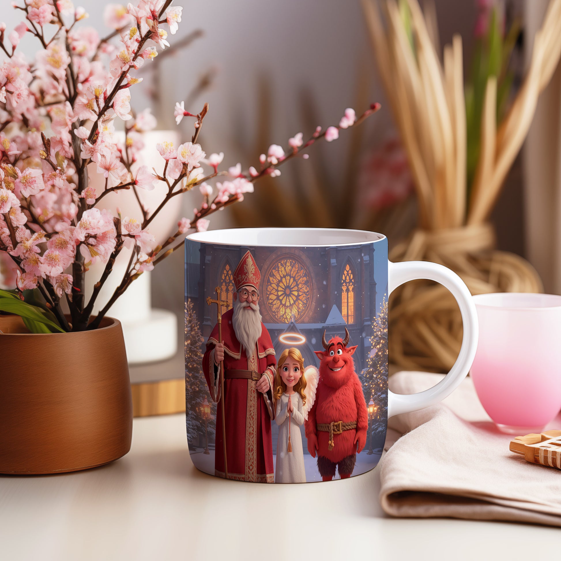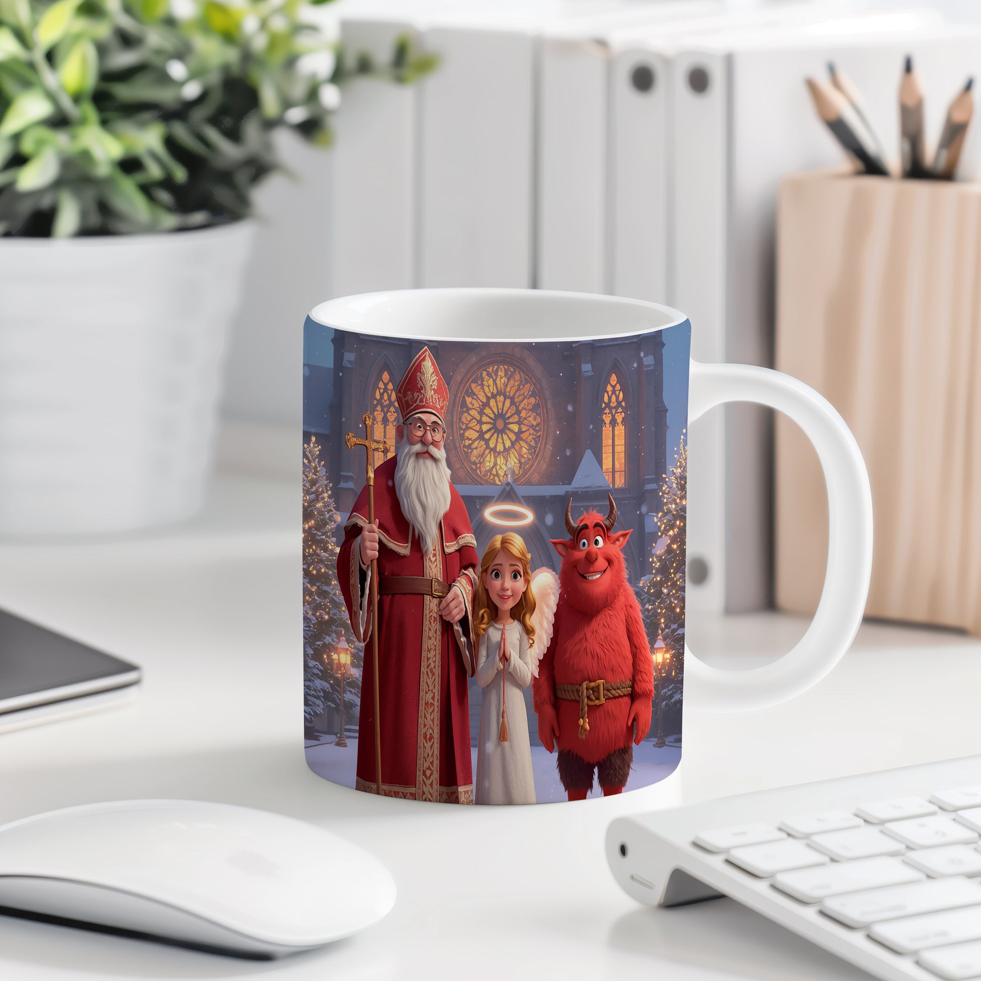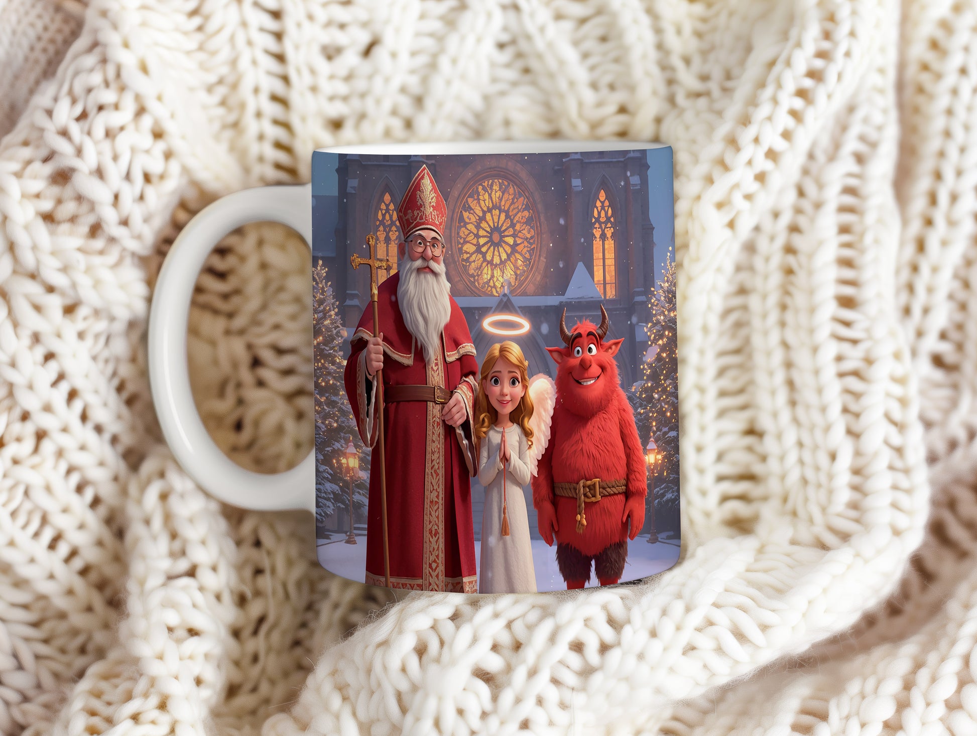 Hrnek s motivem Mikuláše, čerta a anděla – zimní pohádková katedrála