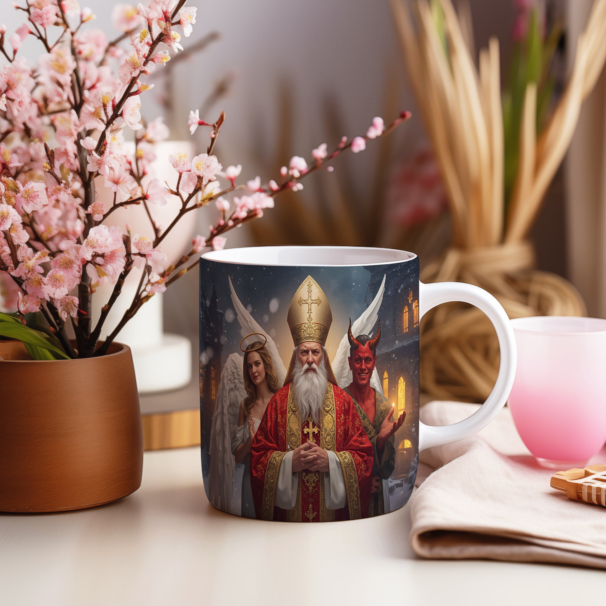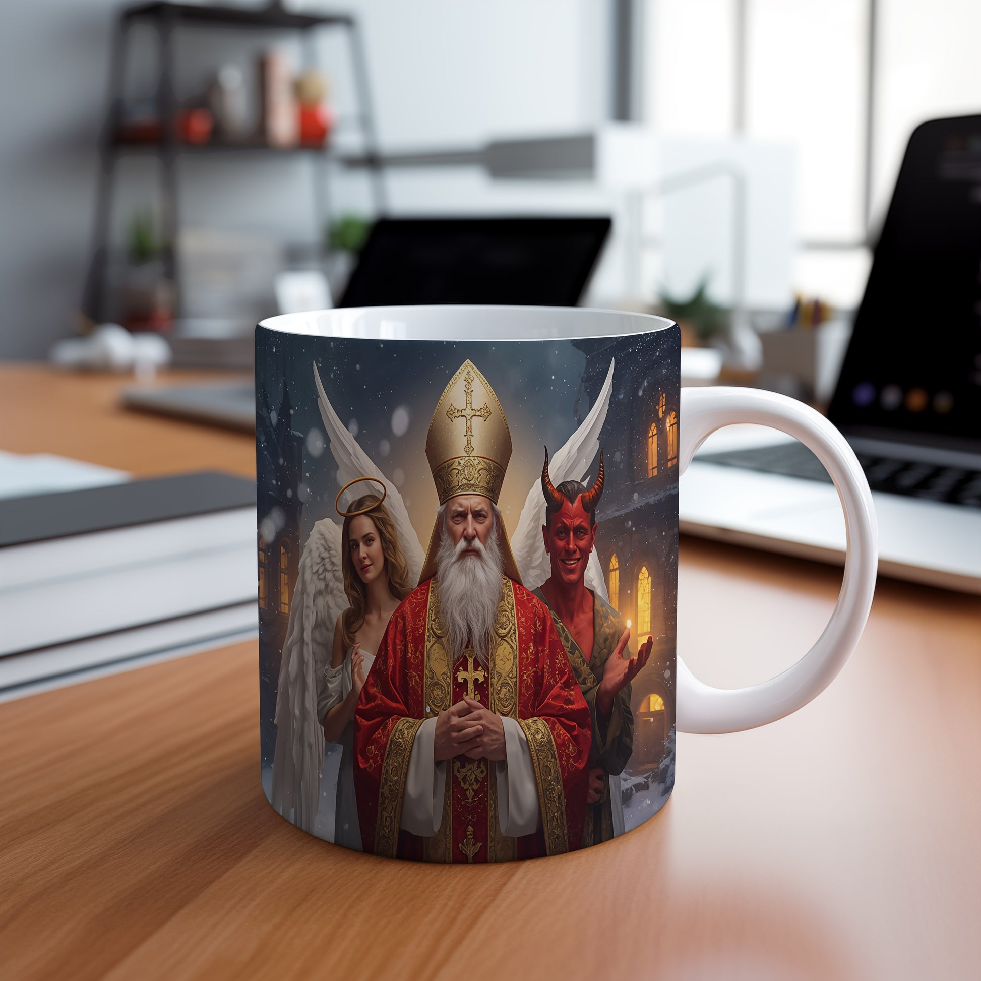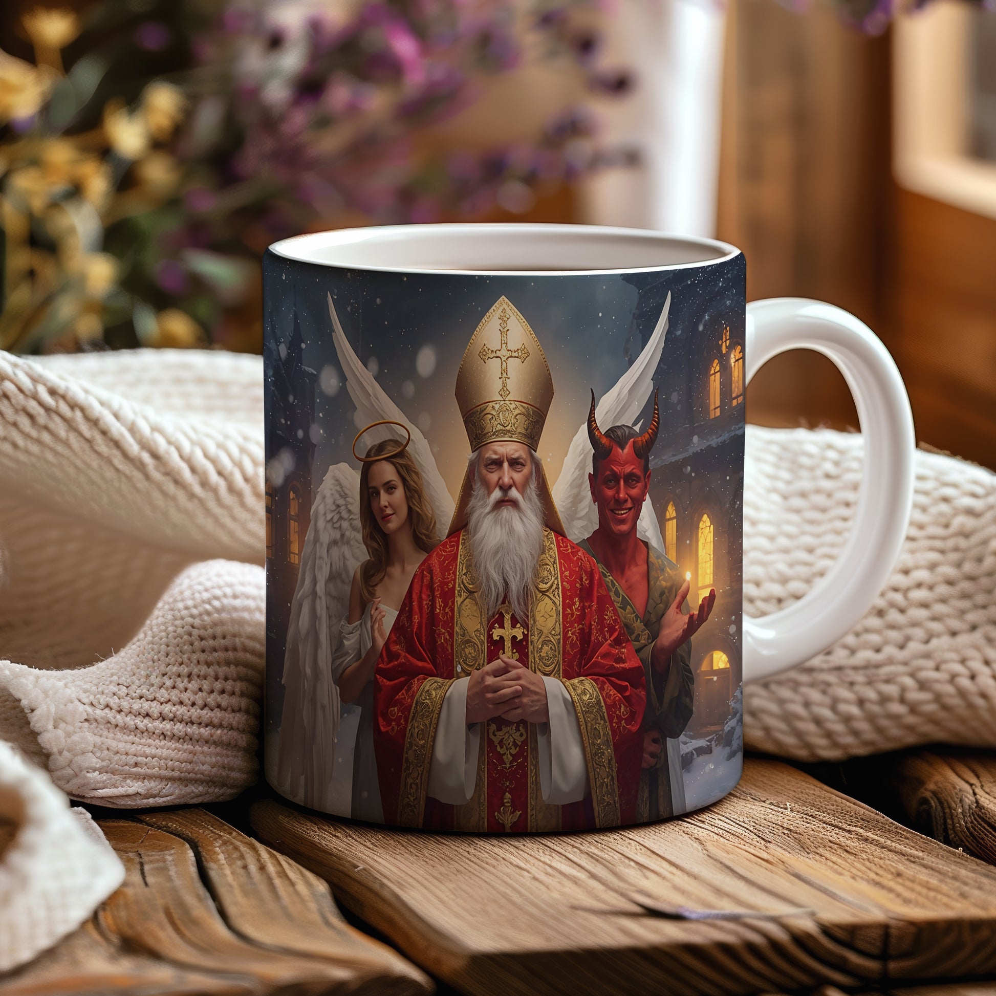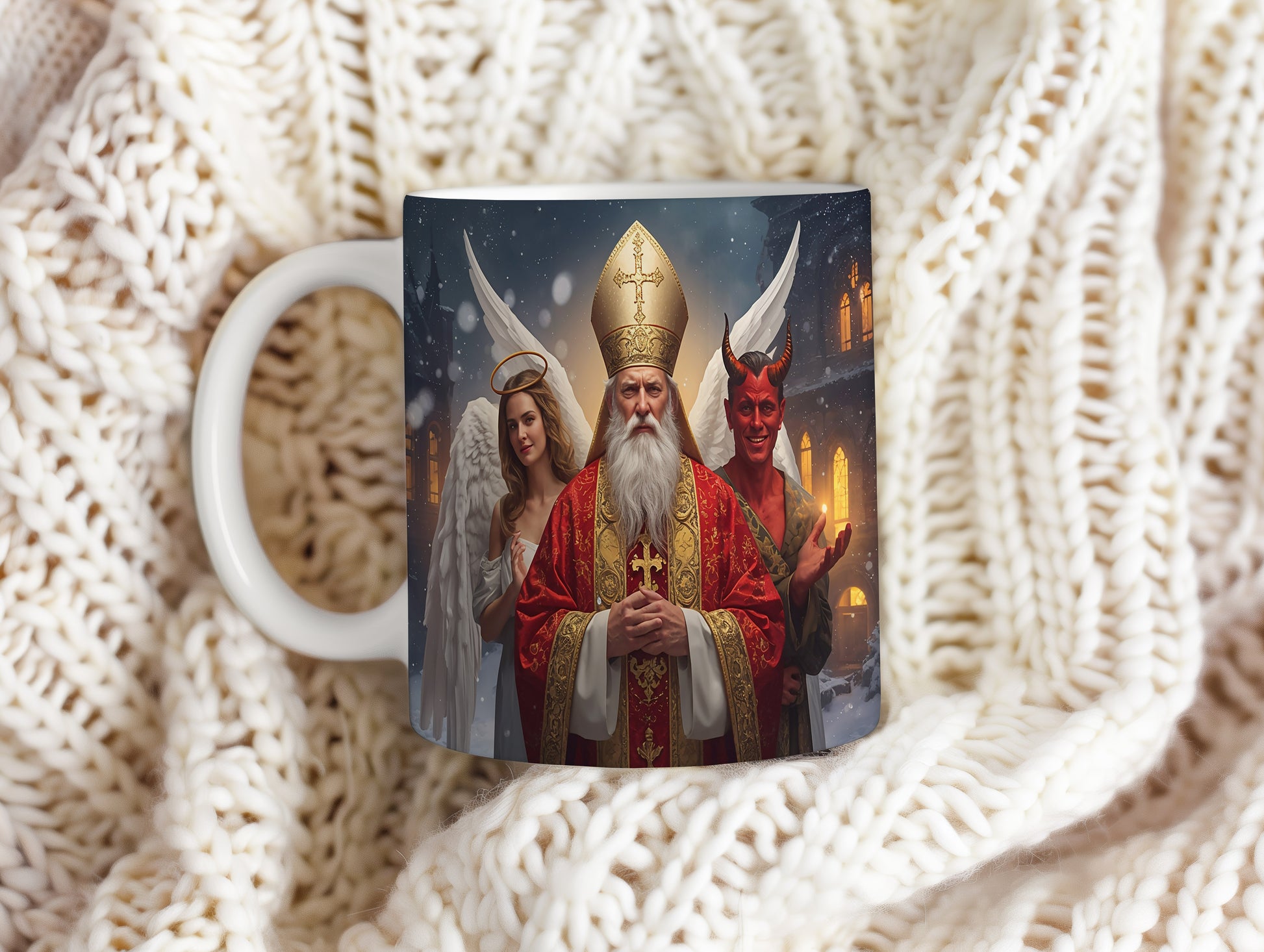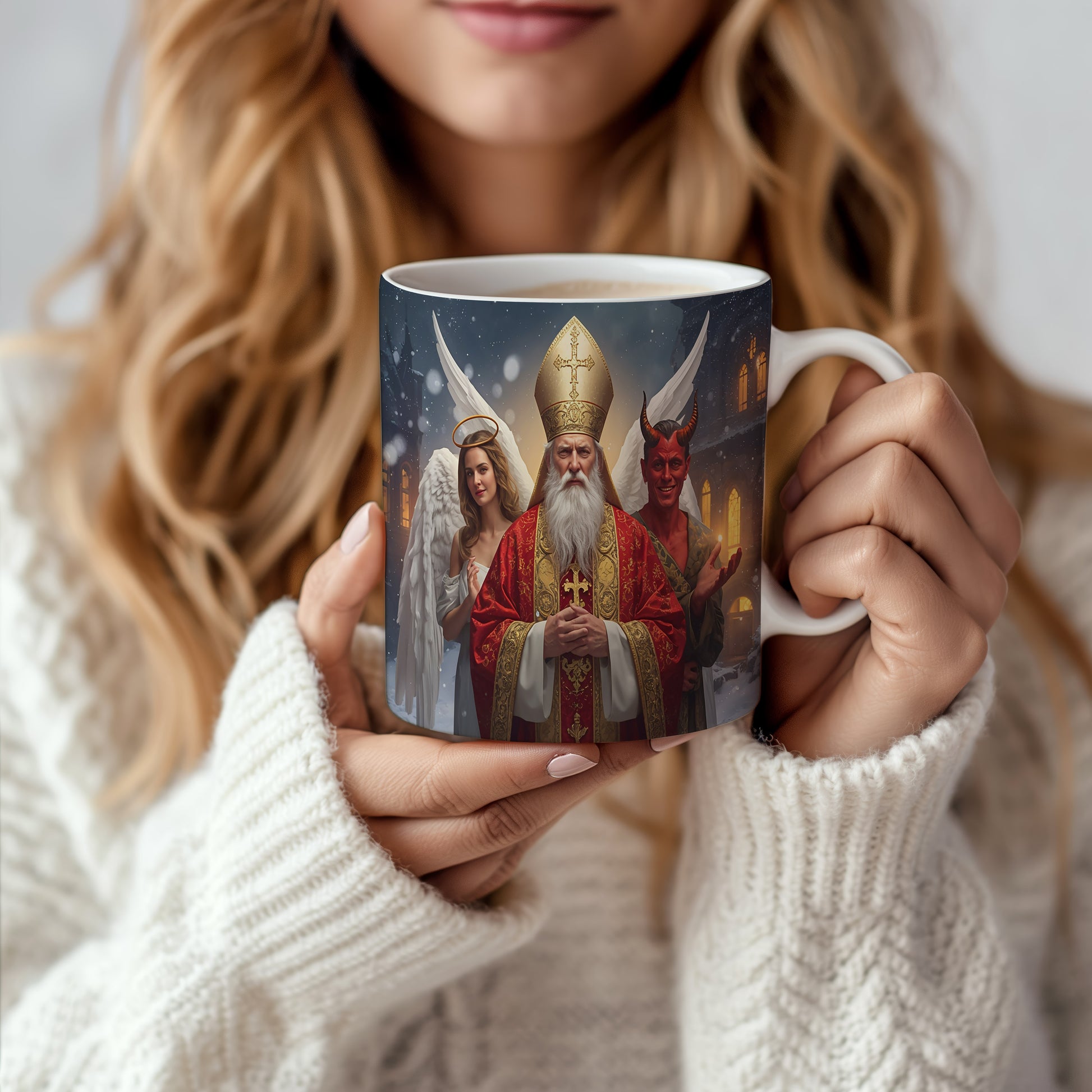 Hrnek s motivem Mikuláše, čerta a anděla – zimní pohádková noc