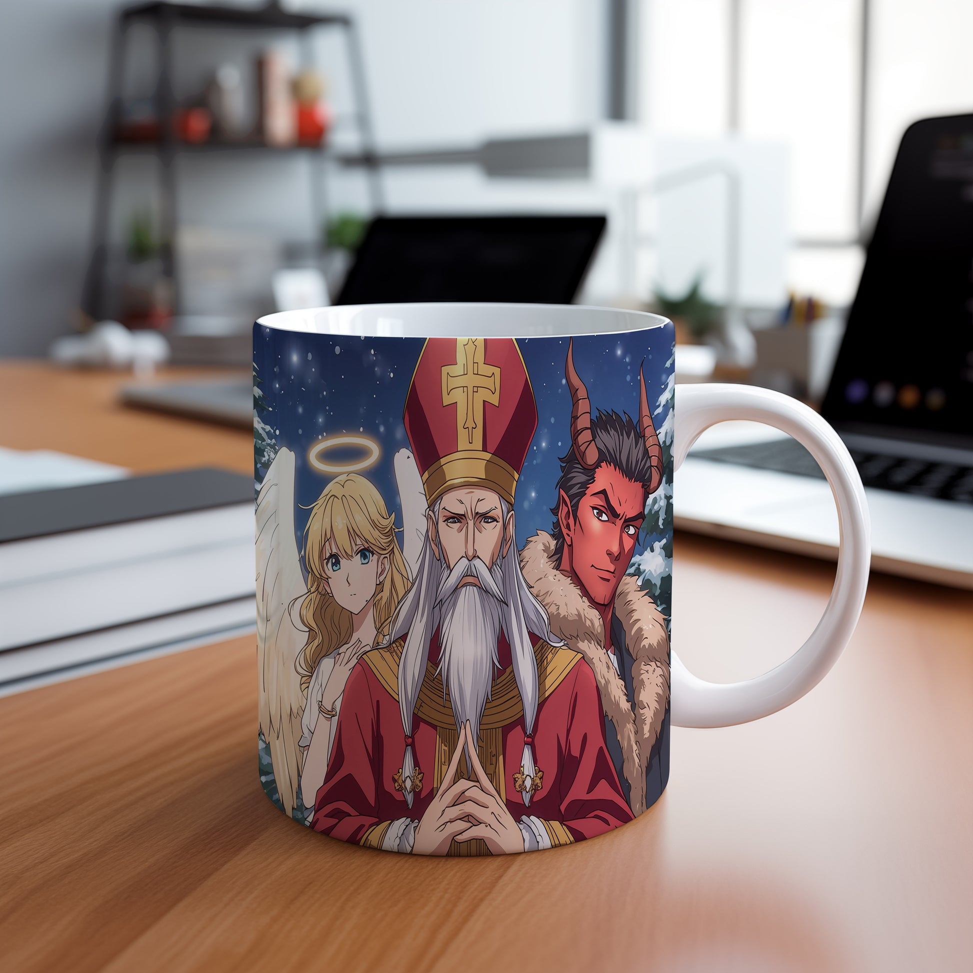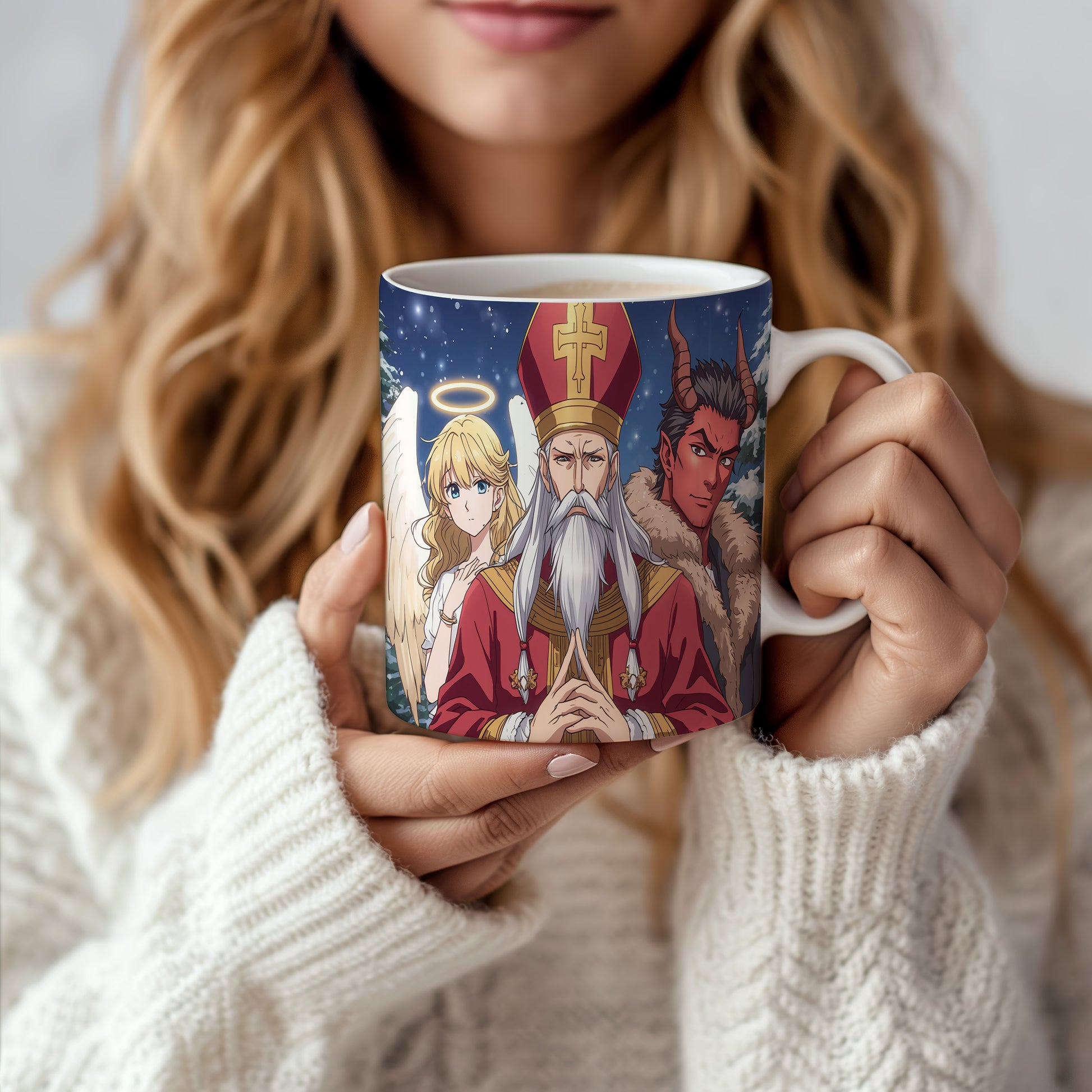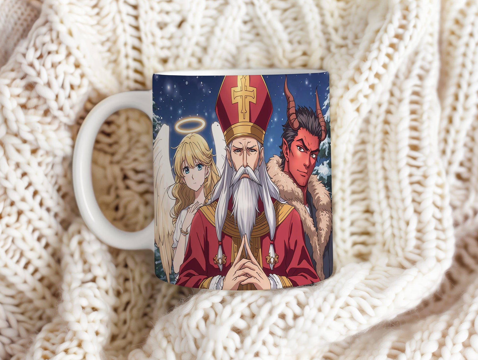 Hrnek s motivem Mikuláše, čerta a anděla – zimní pohádková obloha