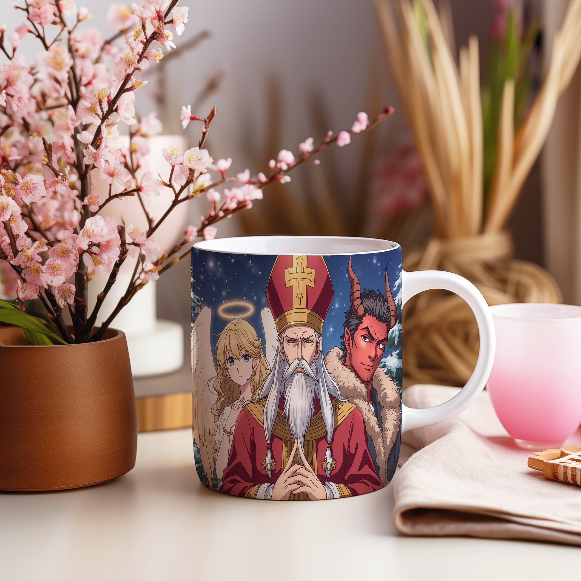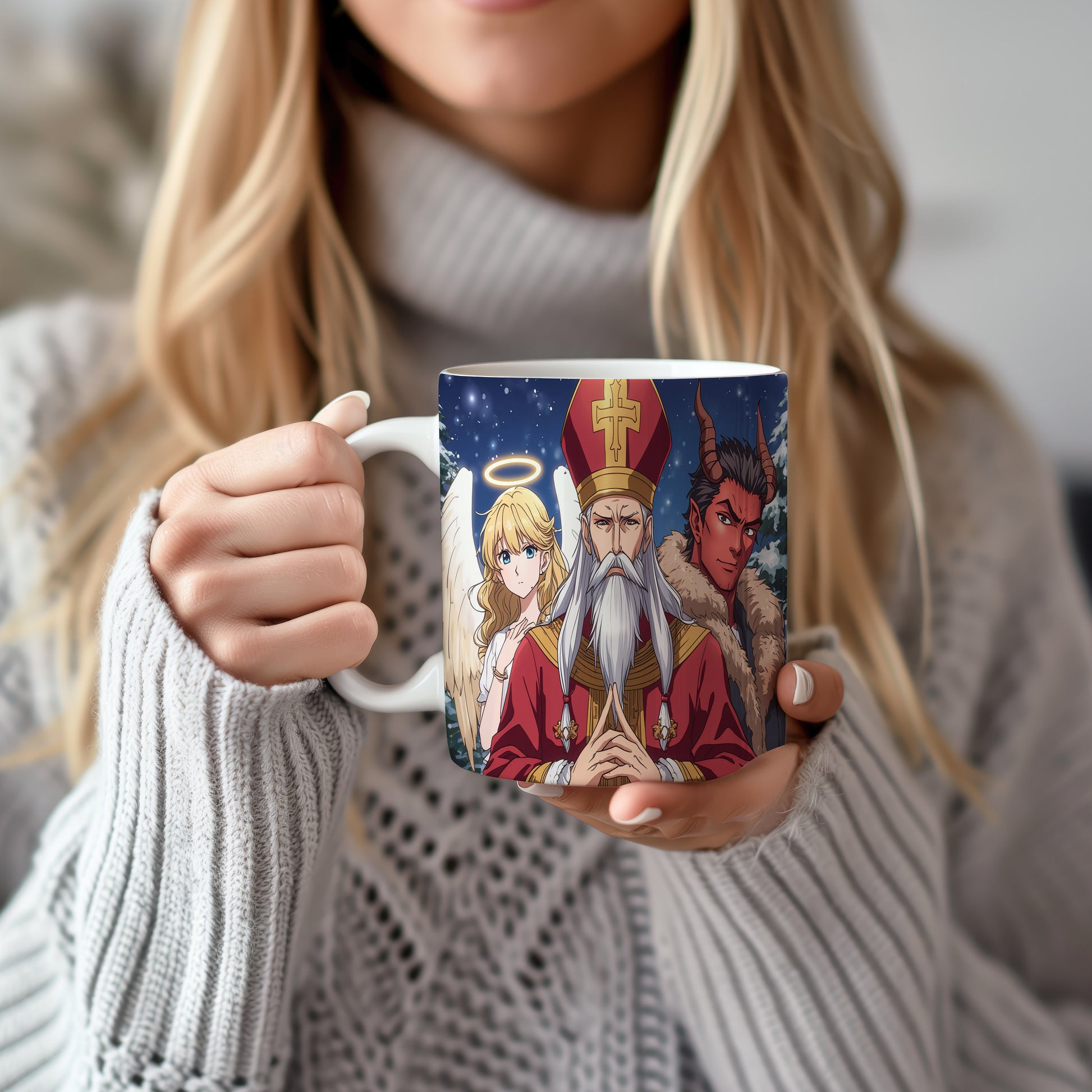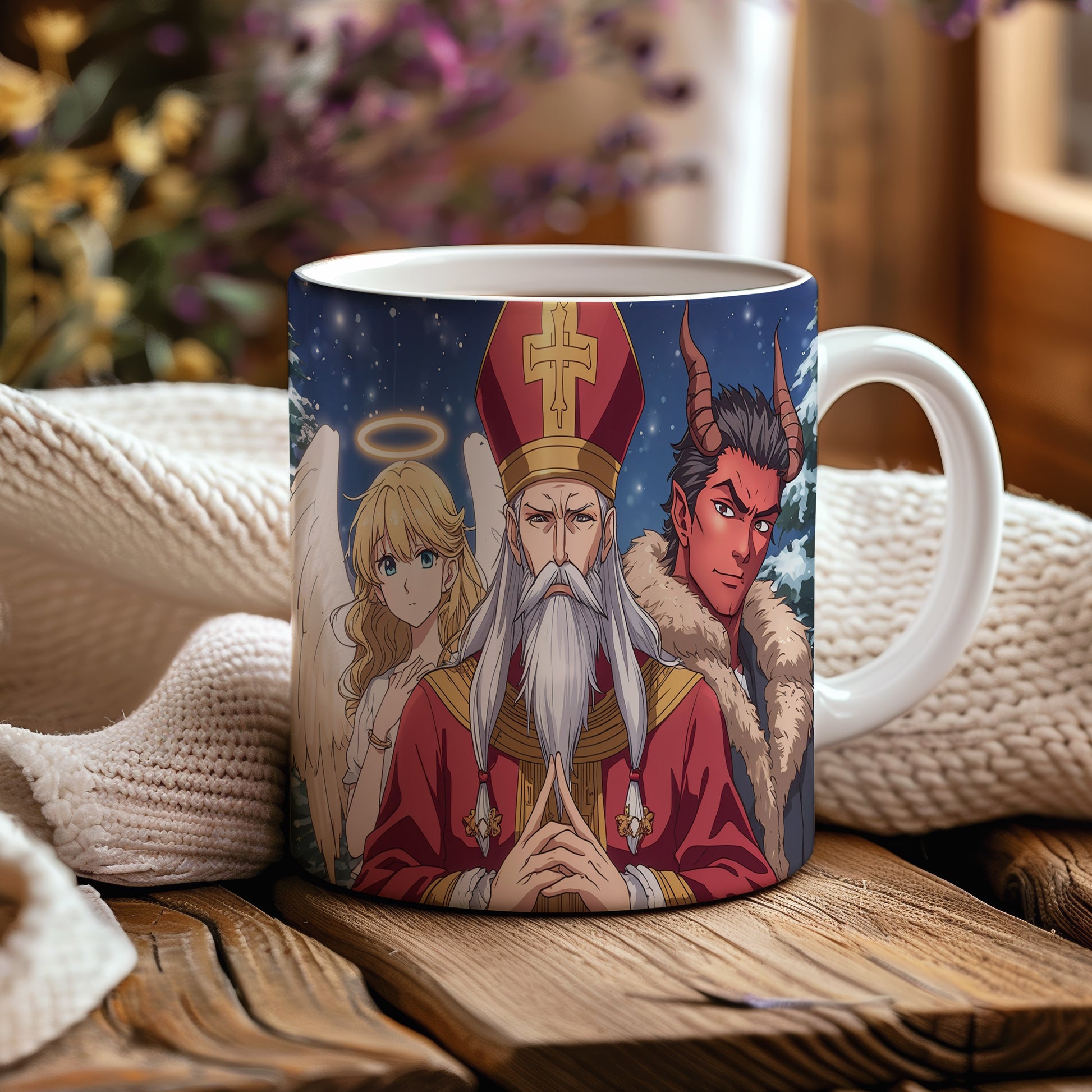 Hrnek s motivem Mikuláše, čerta a anděla – zimní pohádková obloha