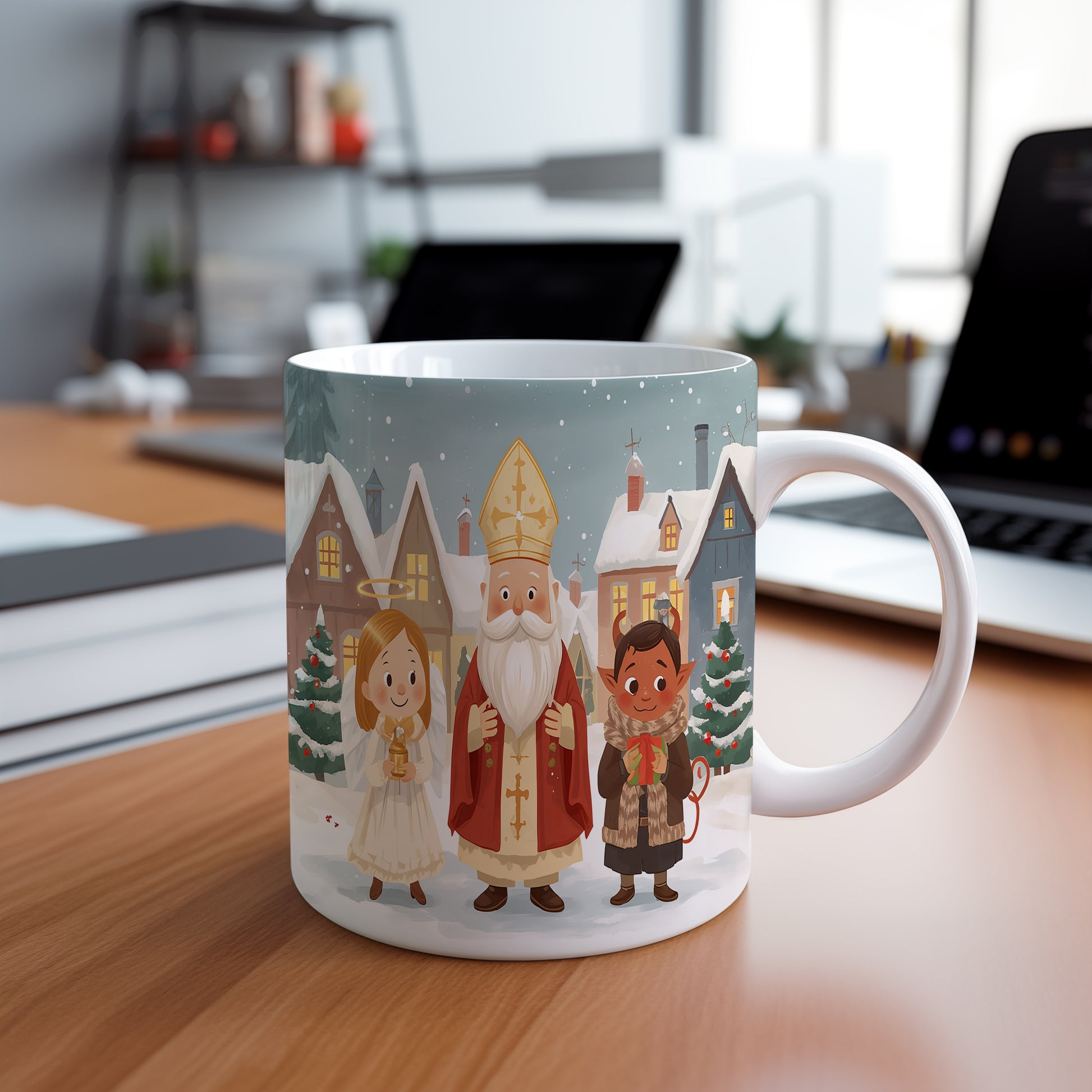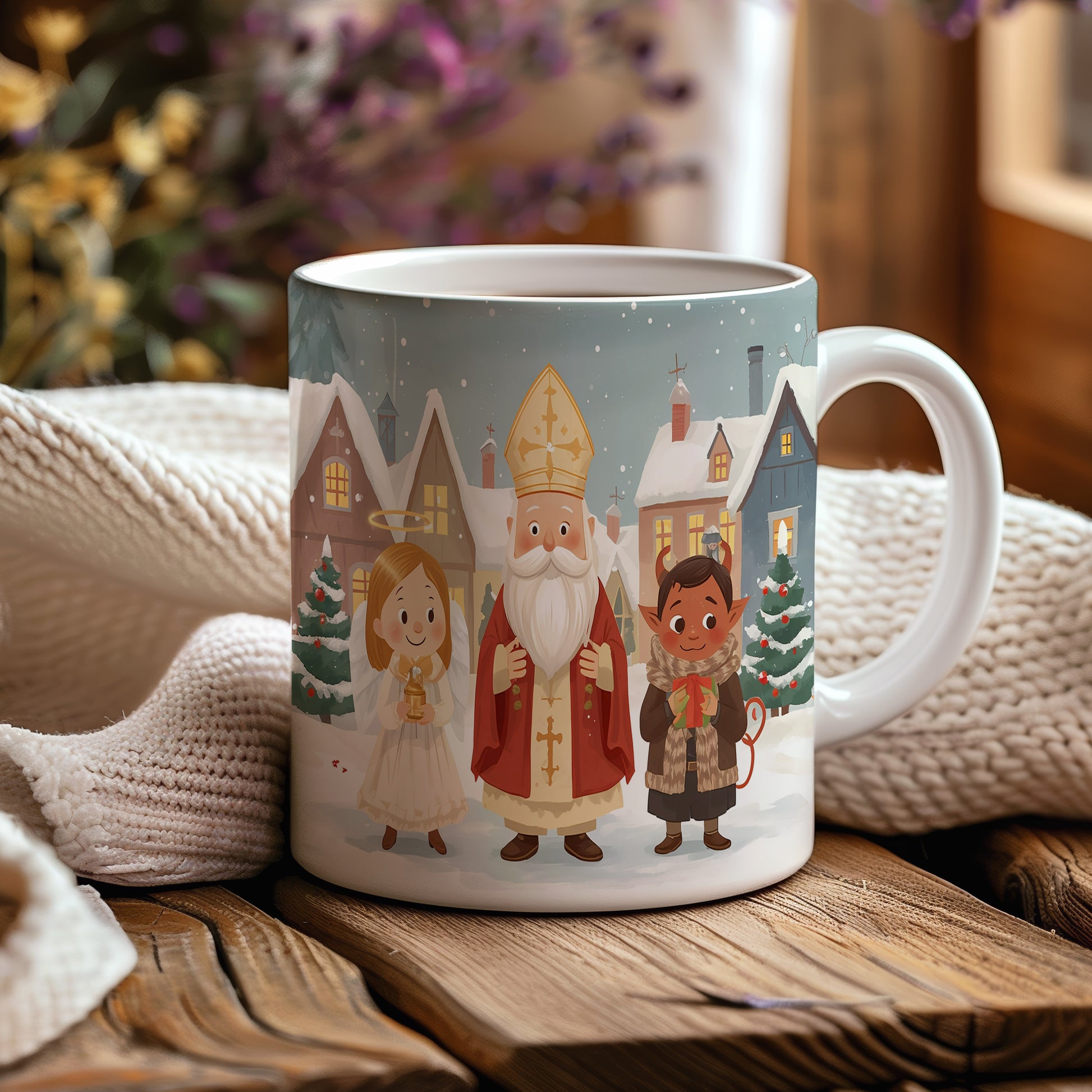 Hrnek s motivem Mikuláše, čerta a anděla – zimní pohádková ulička