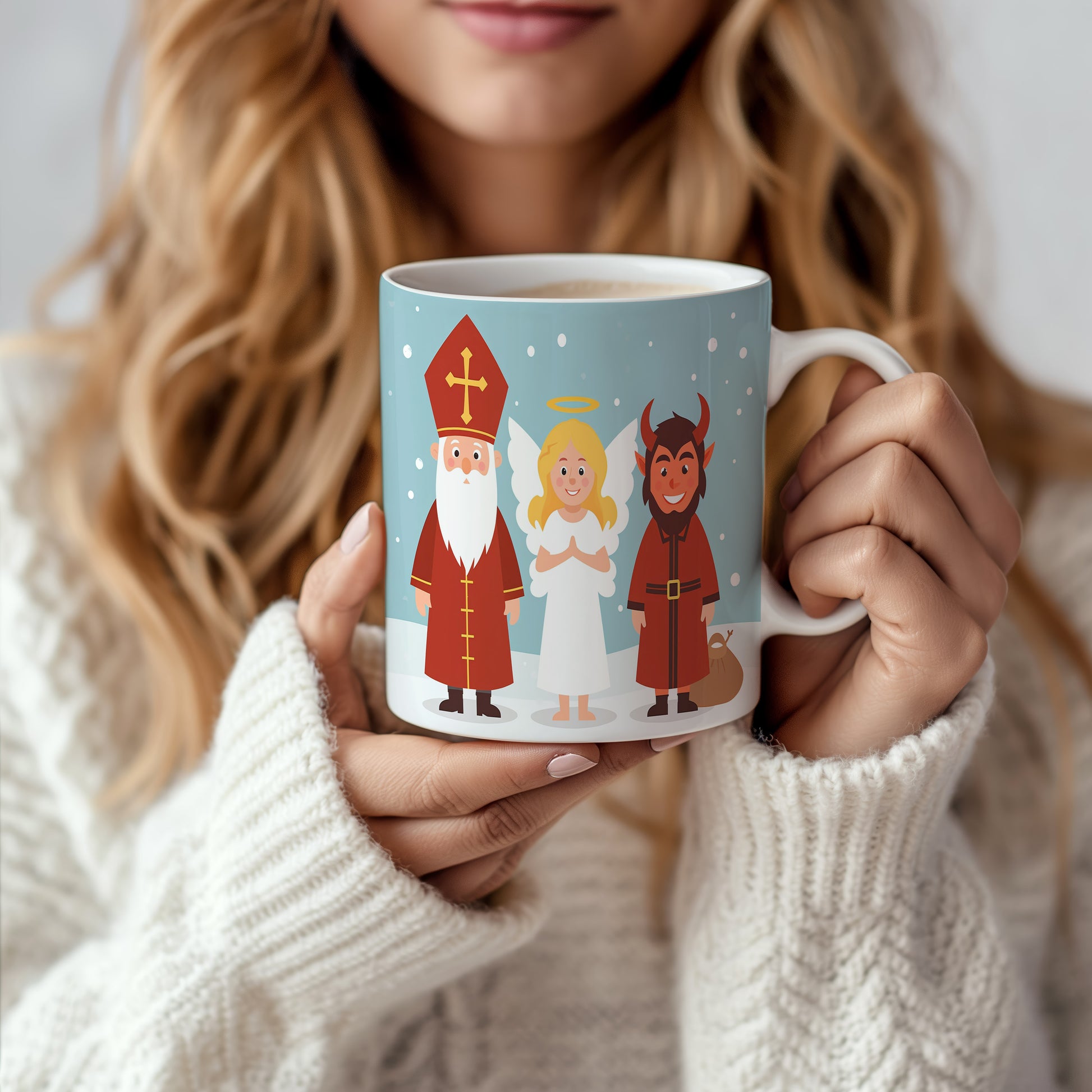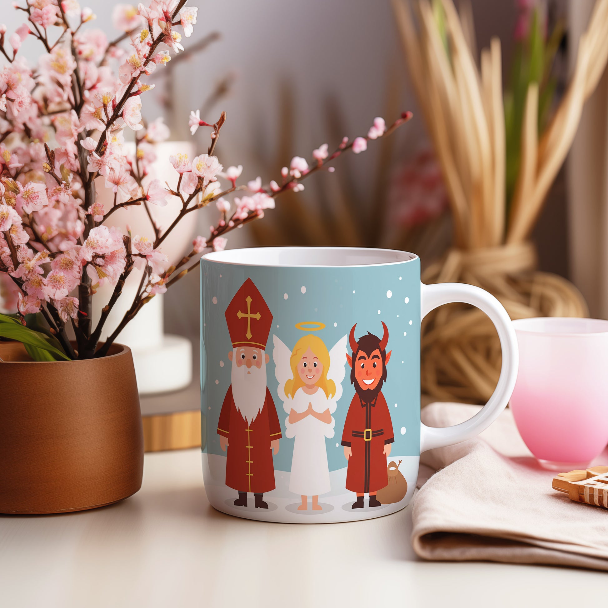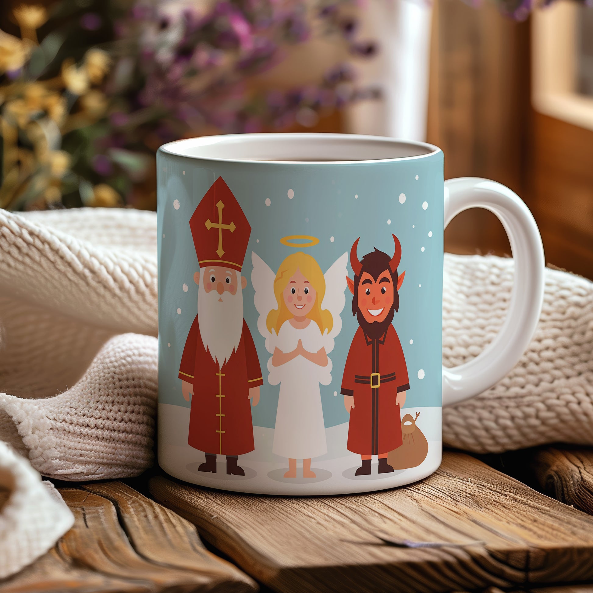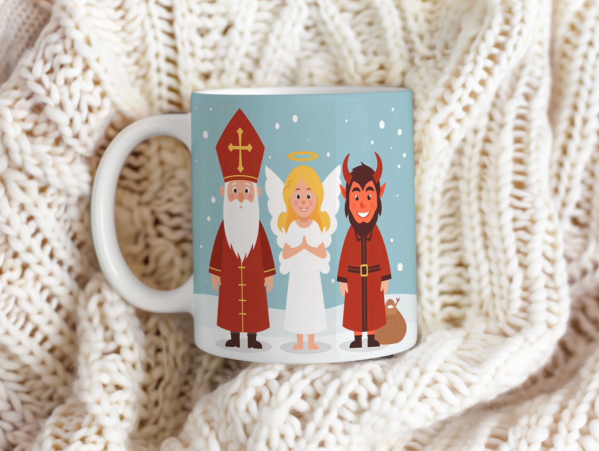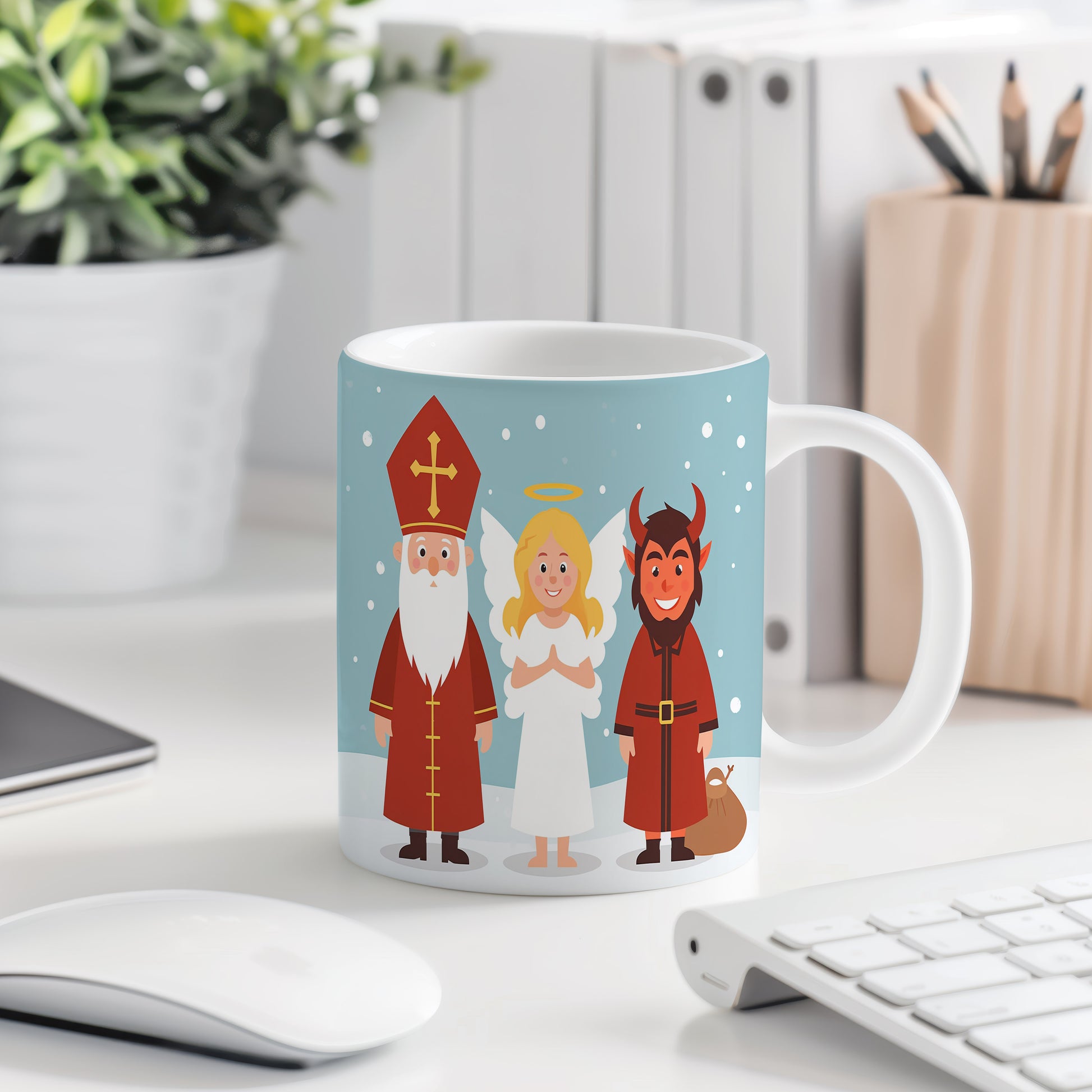 Hrnek s motivem Mikuláše, čerta a anděla – zimní radost