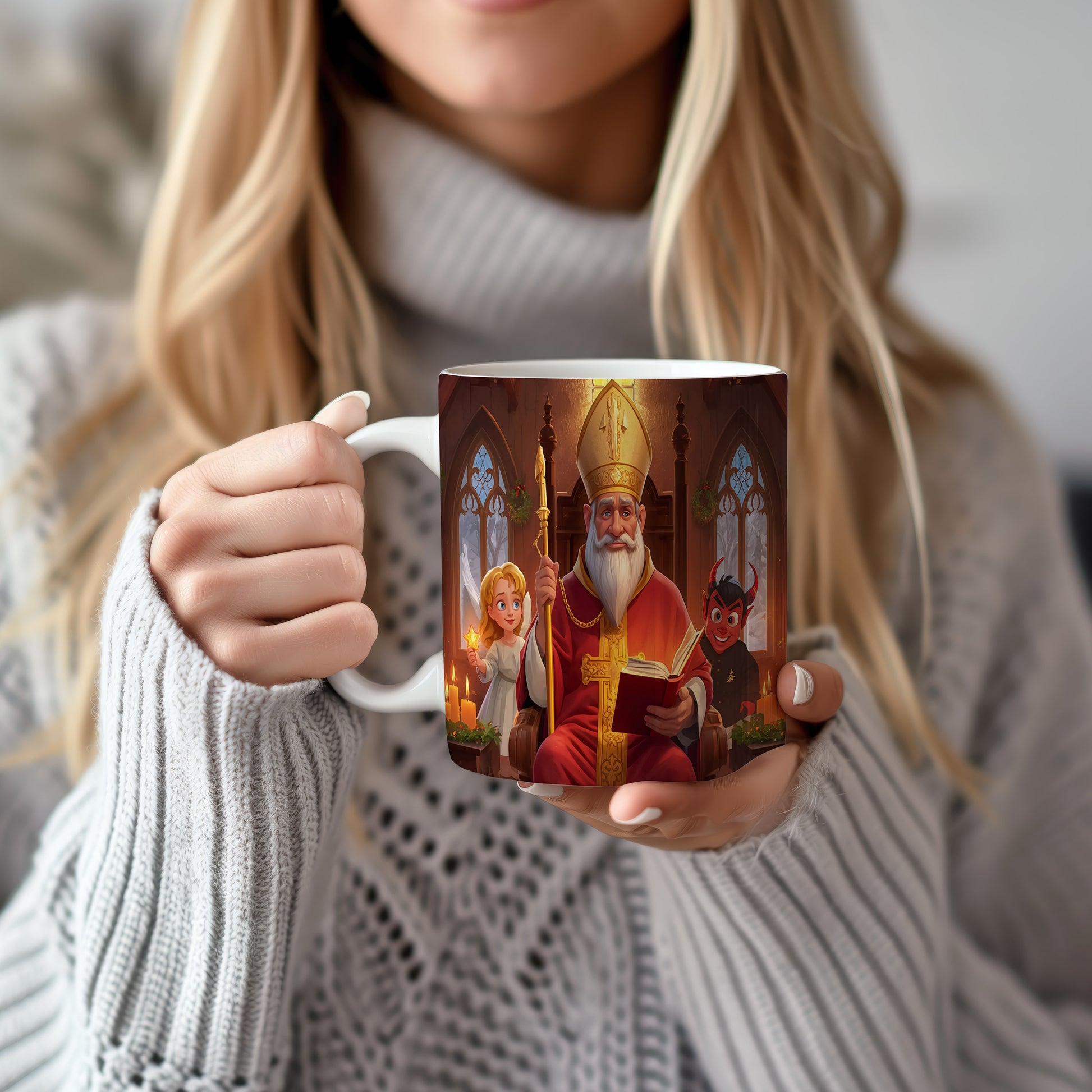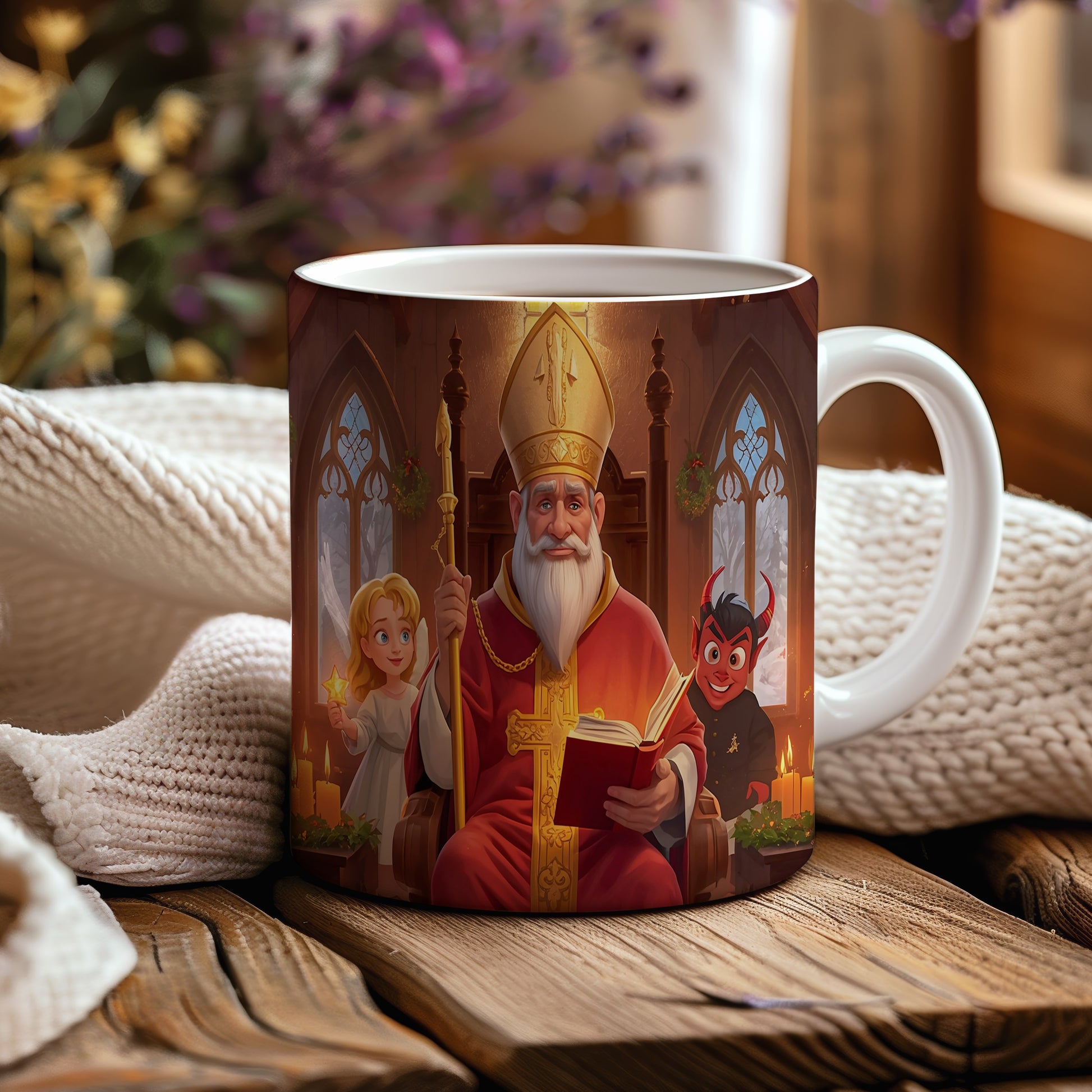 Veselý Mikuláš v červeném rouchu, anděl v bílém a čert v tmavých barvách přinášejí kouzlo zimního svátečního chrámu. Hrnek 330ml – vhodný do myčky i mikrovlnky.
