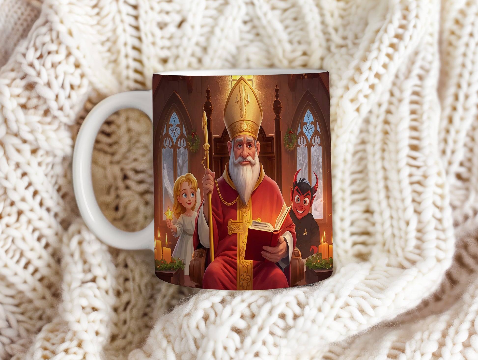 Hrnek s motivem Mikuláše, čerta a anděla – zimní sváteční chrám