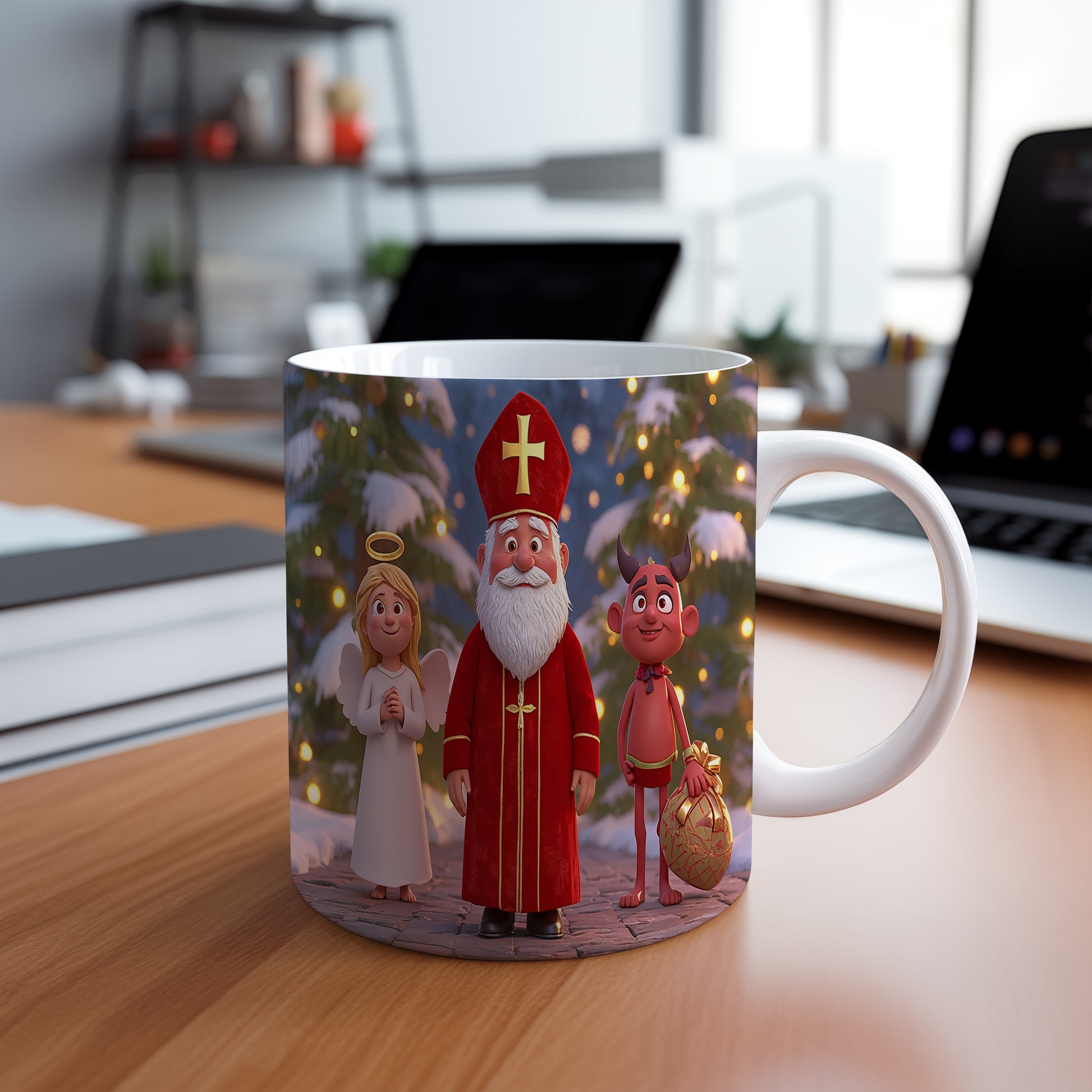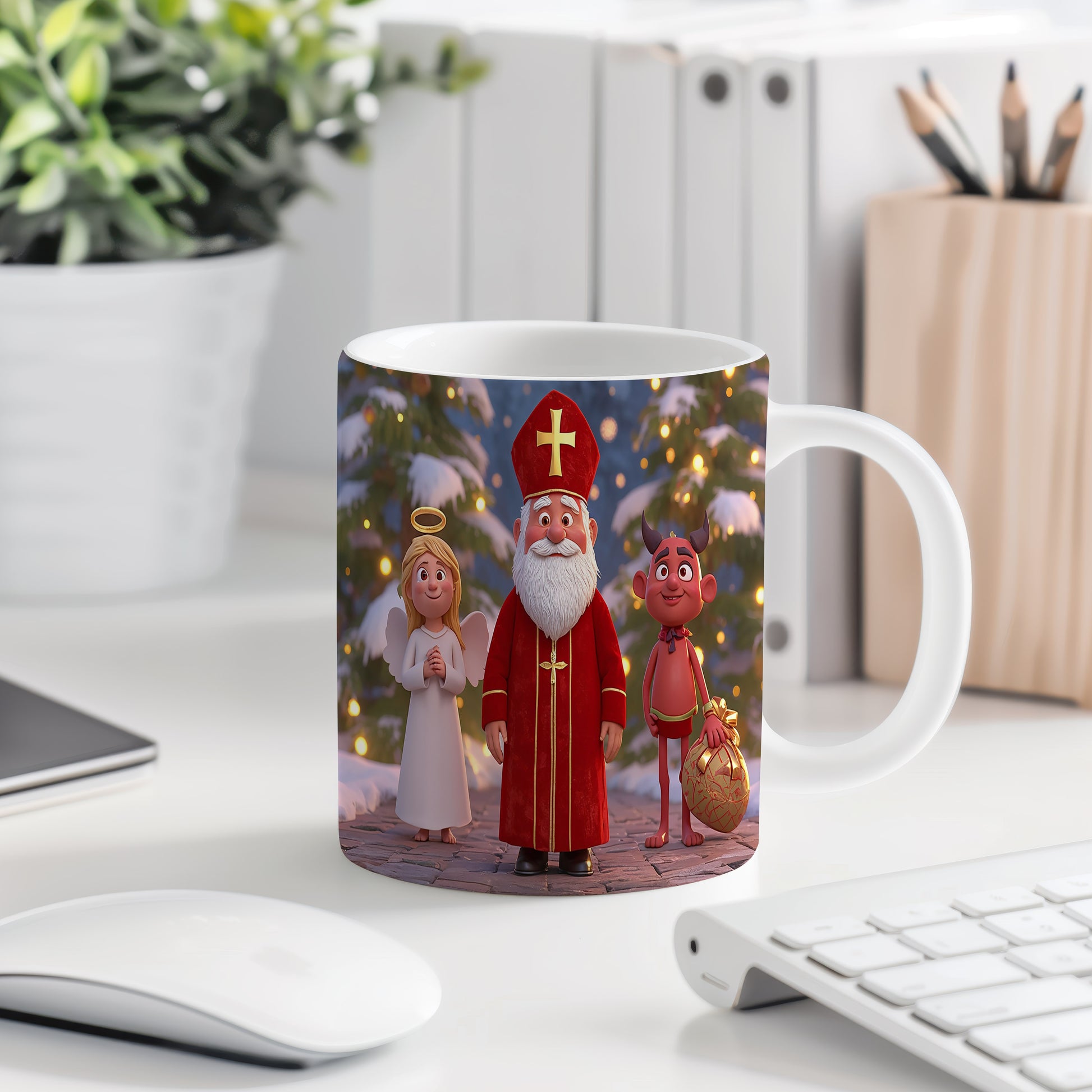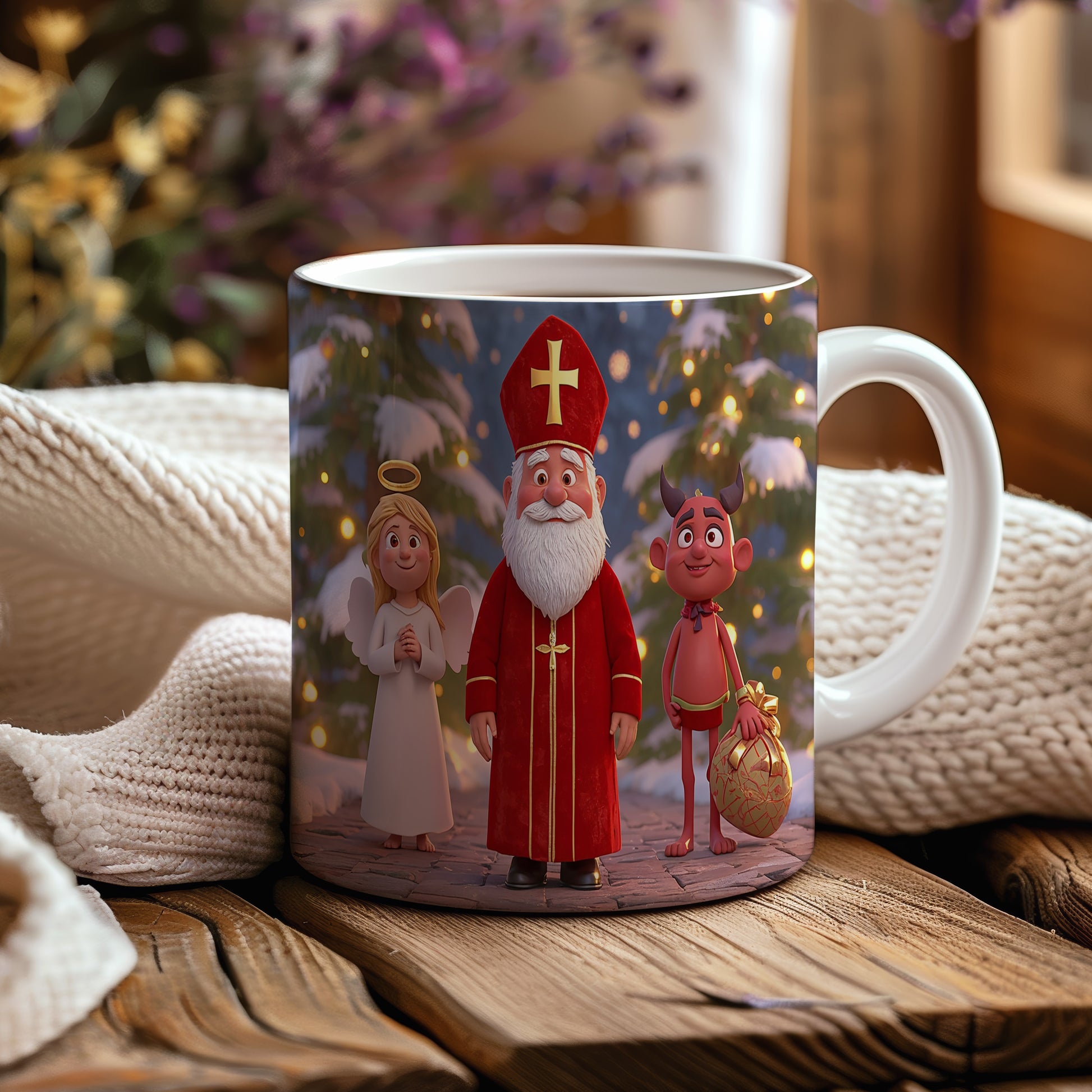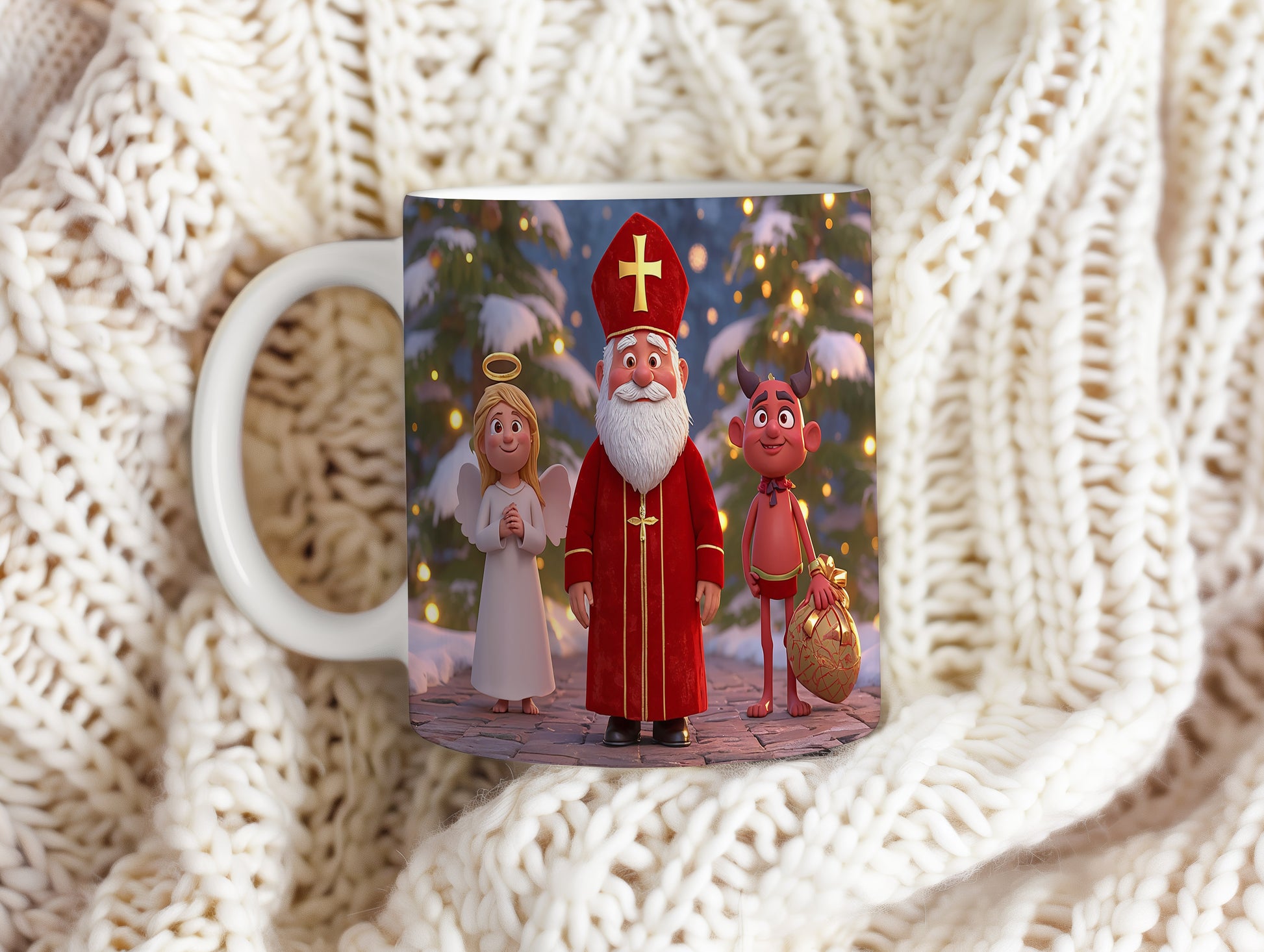 Hrnek s motivem Mikuláše, čerta a anděla – zimní vesnička