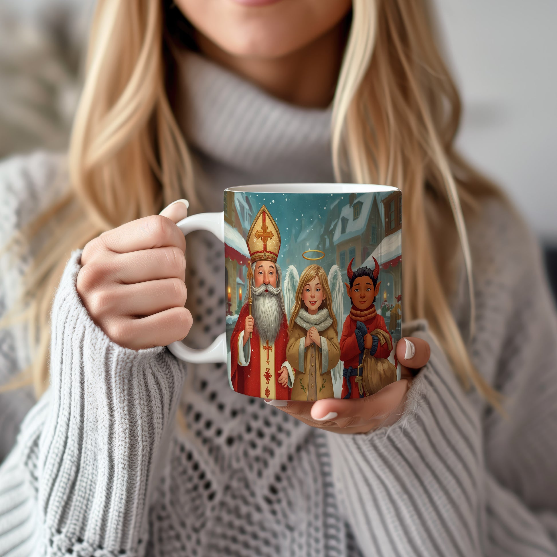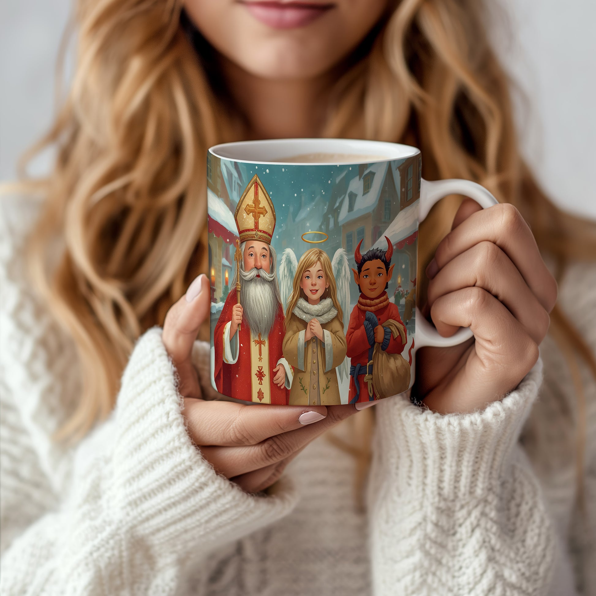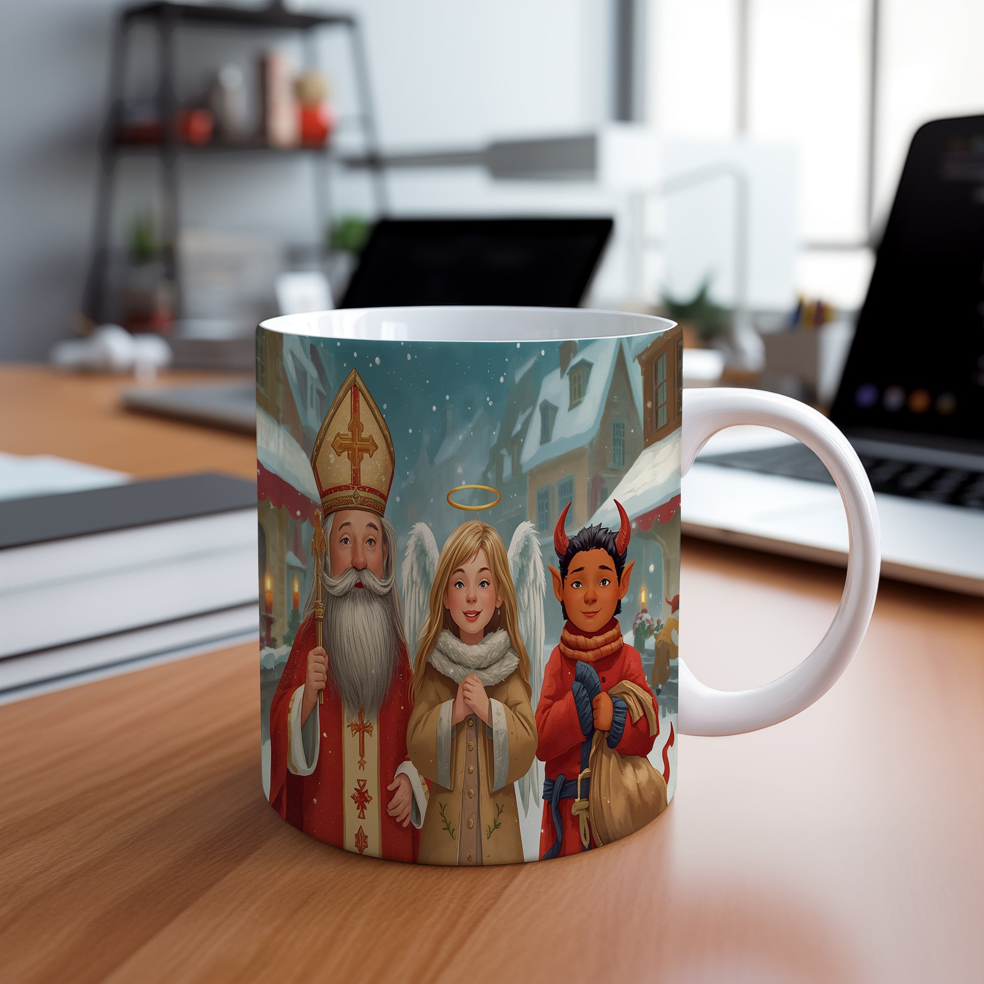 Hrnek s motivem Mikuláše, čerta a anděla – zimní vesnická idyla