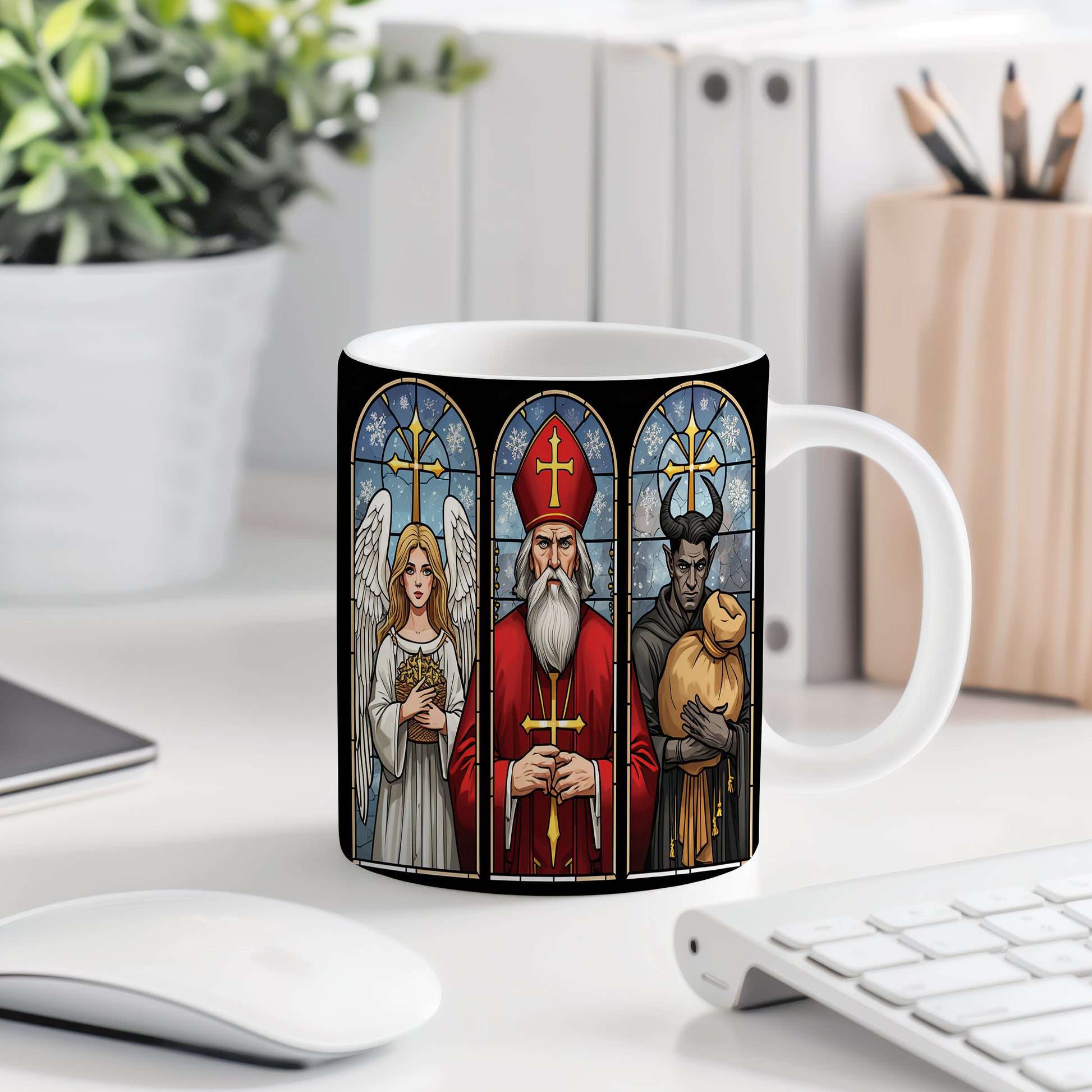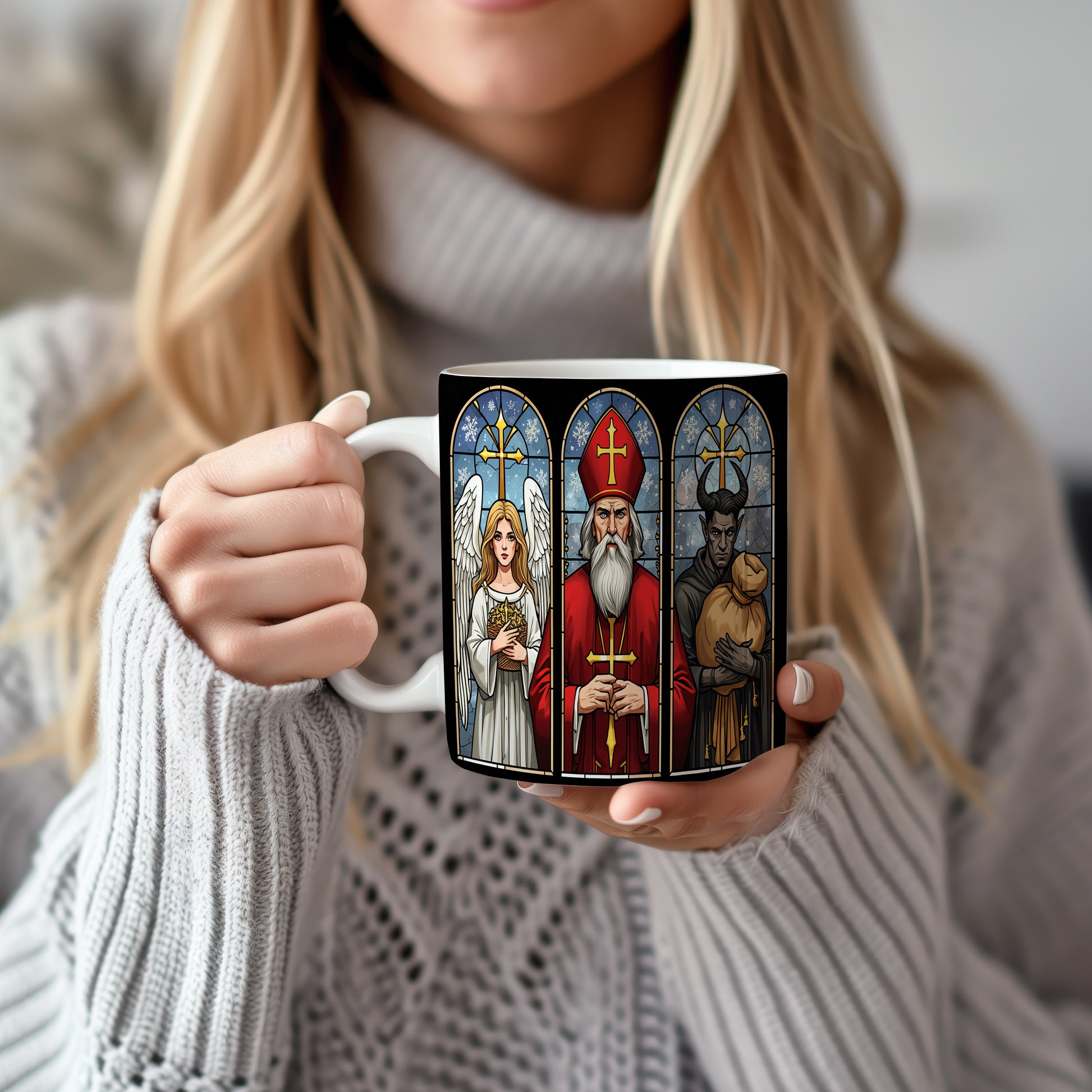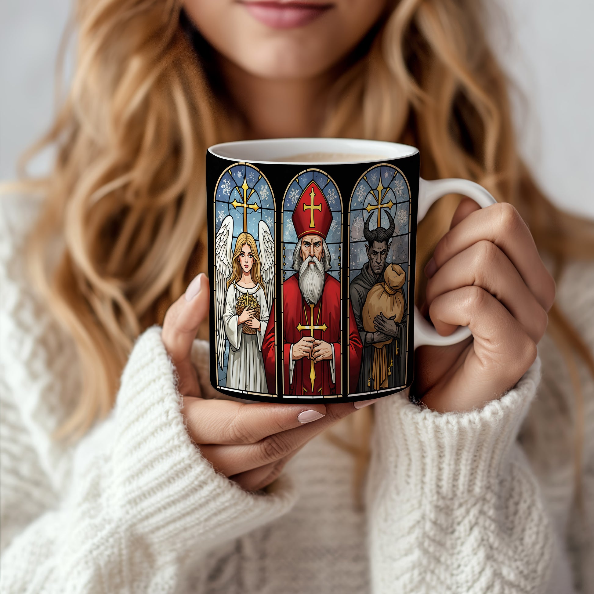 Hrnek s motivem Mikuláše, čerta a anděla – zimní vitráž