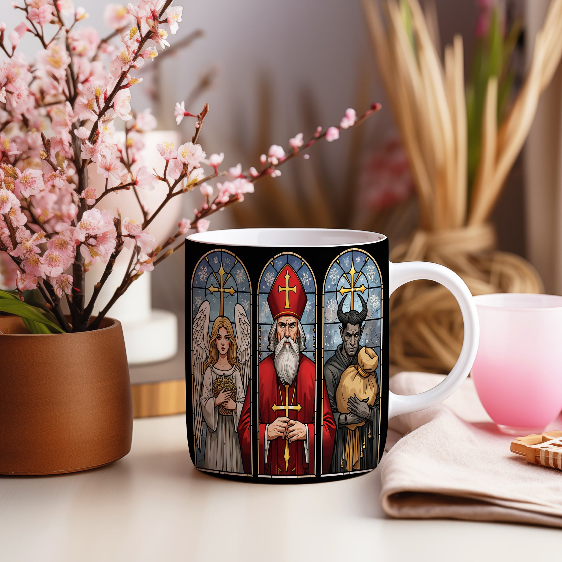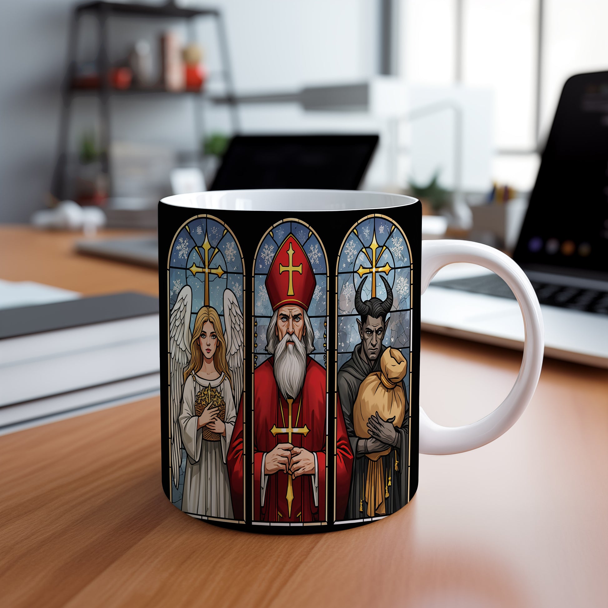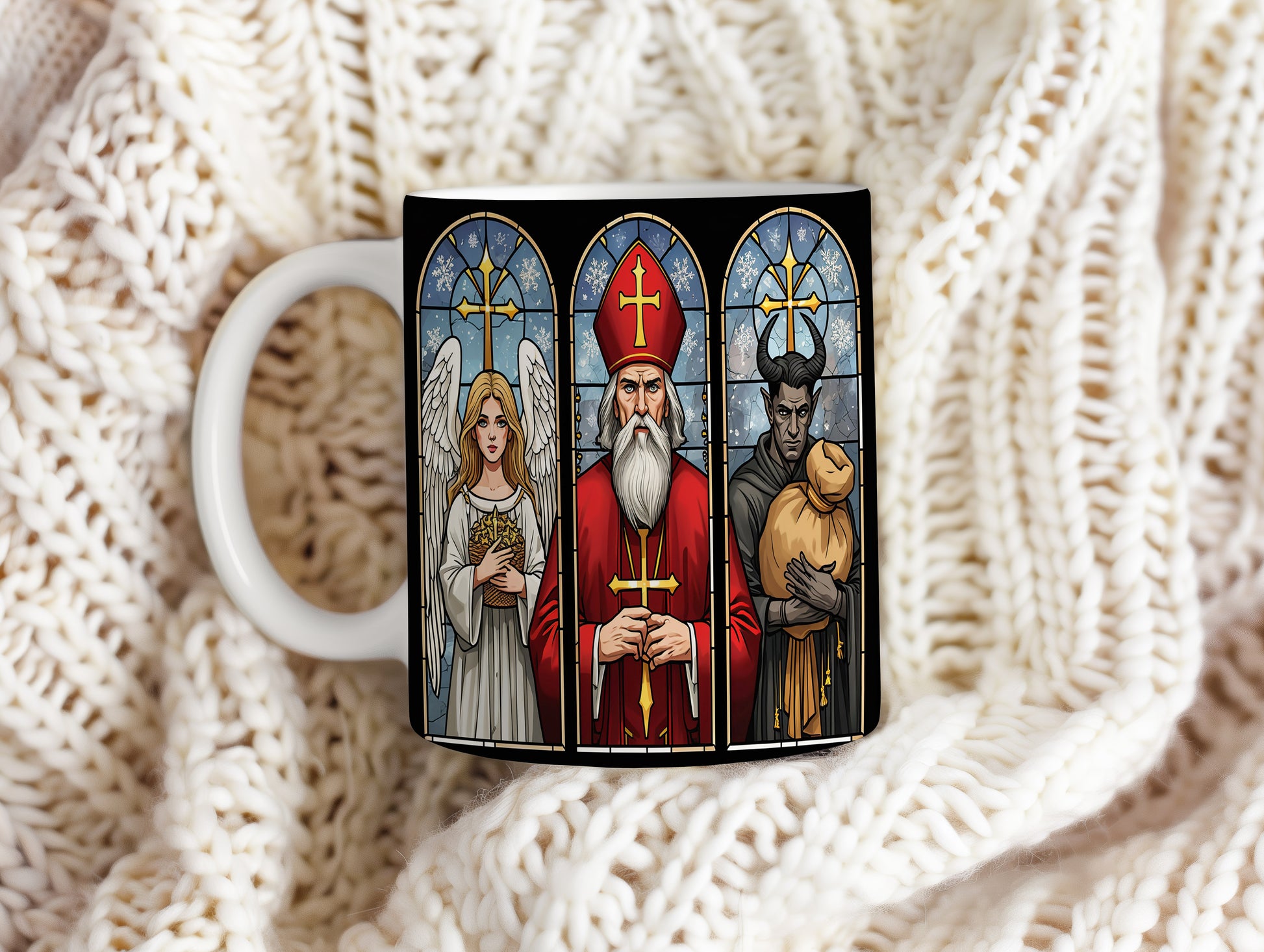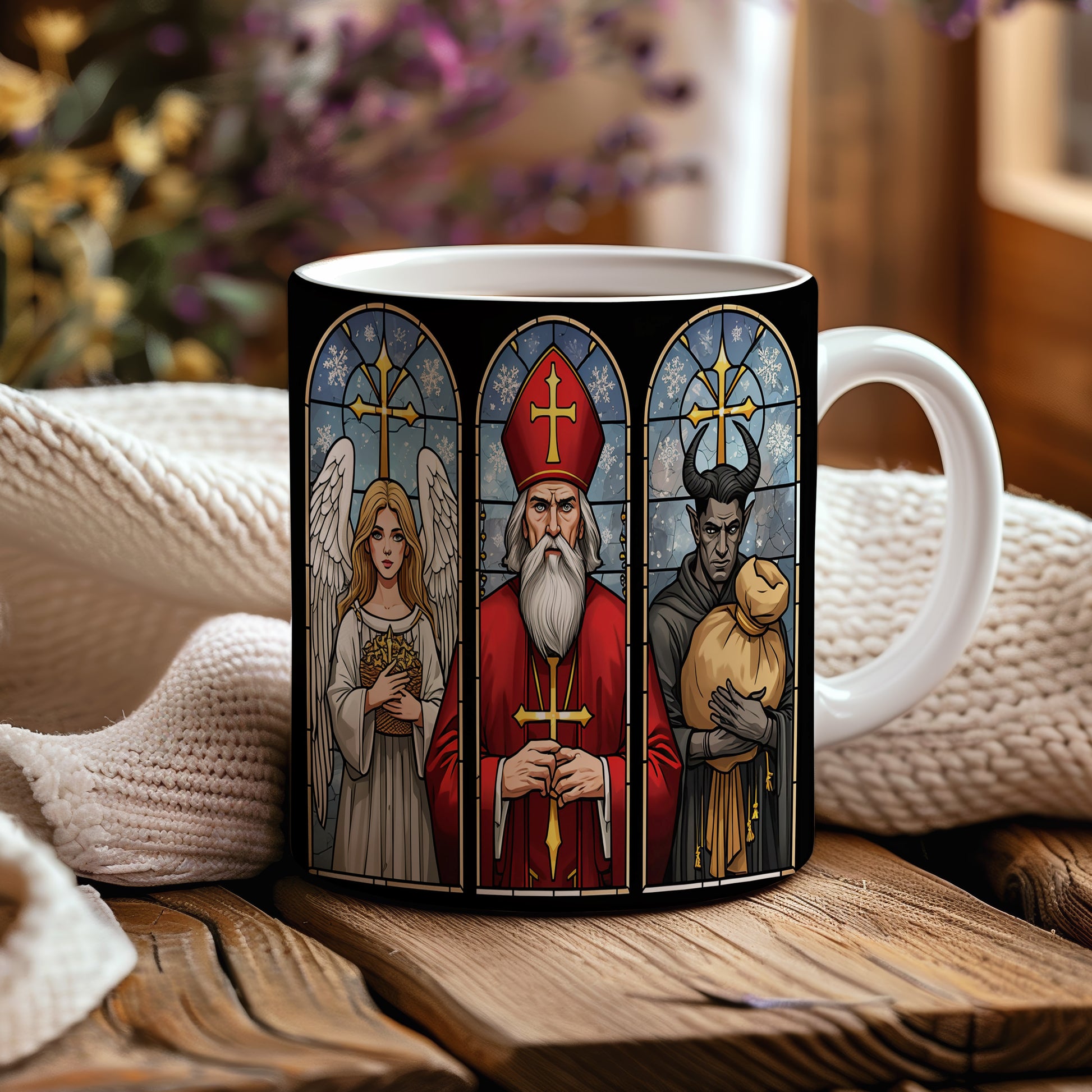 Hrnek s motivem Mikuláše, čerta a anděla – zimní vitráž
