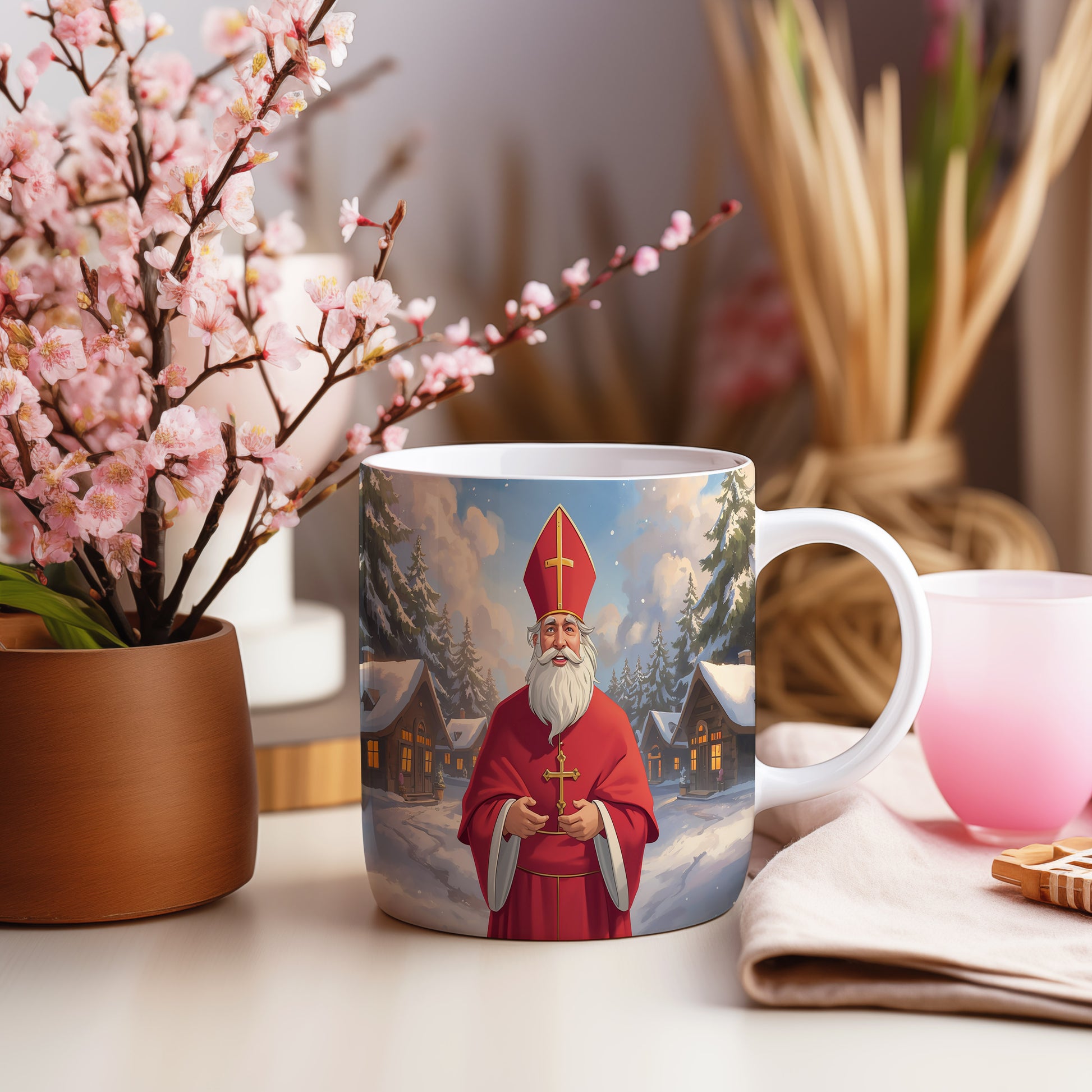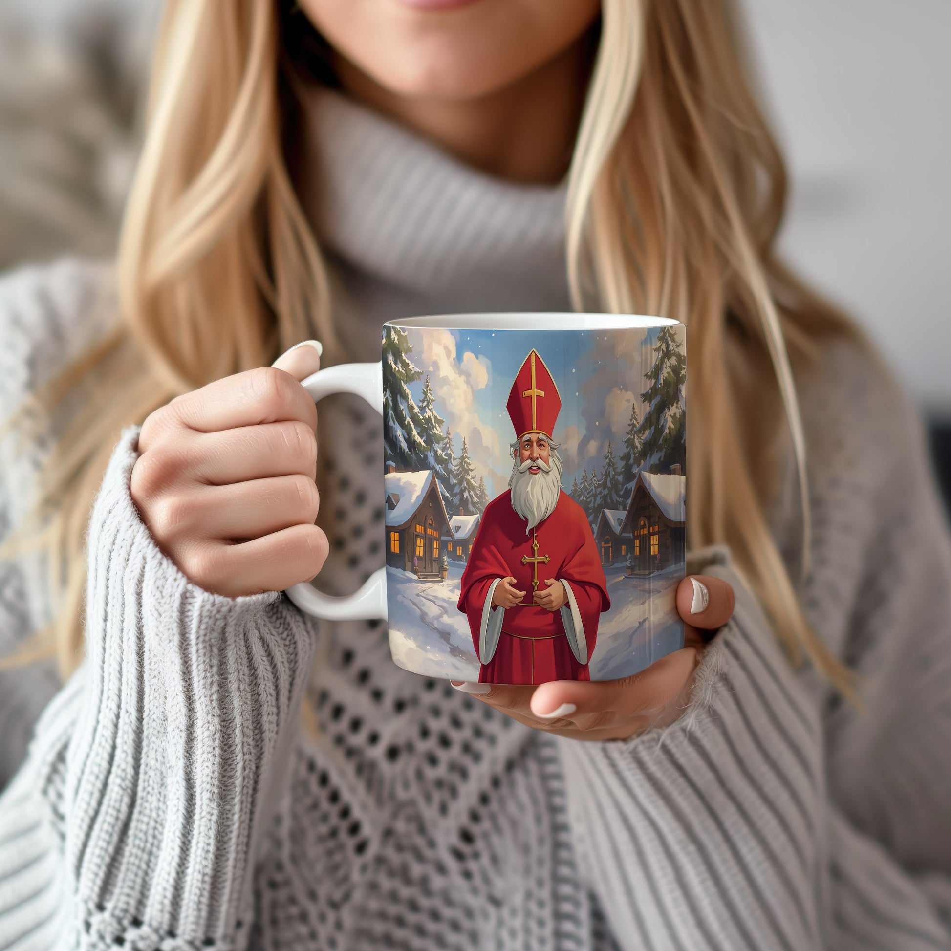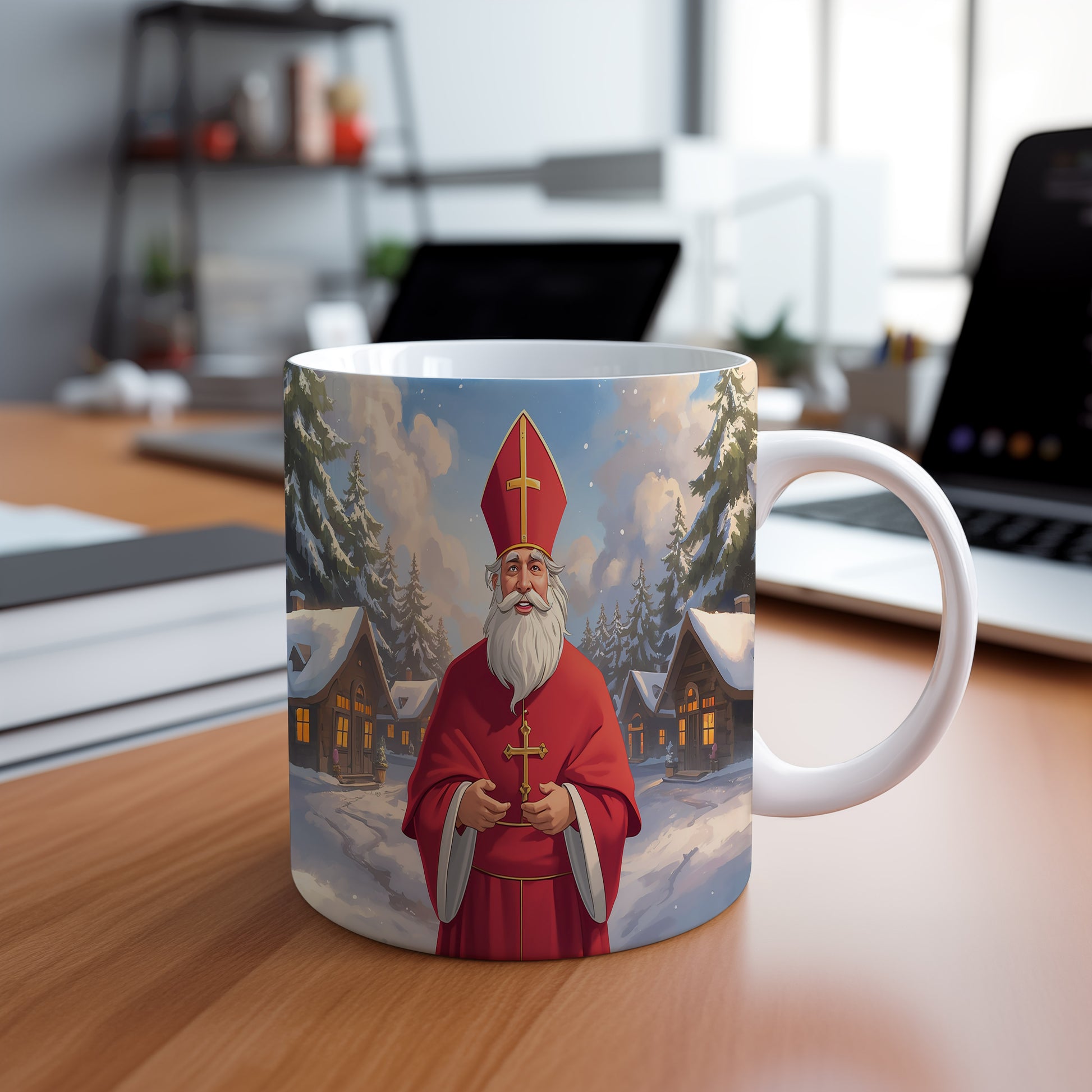Klasický Mikuláš v červeném rouchu s křížem, stojící před zasněženou vesničkou, vytváří hřejivou atmosféru. Hrnek 330ml – vhodný do myčky i mikrovlnky.