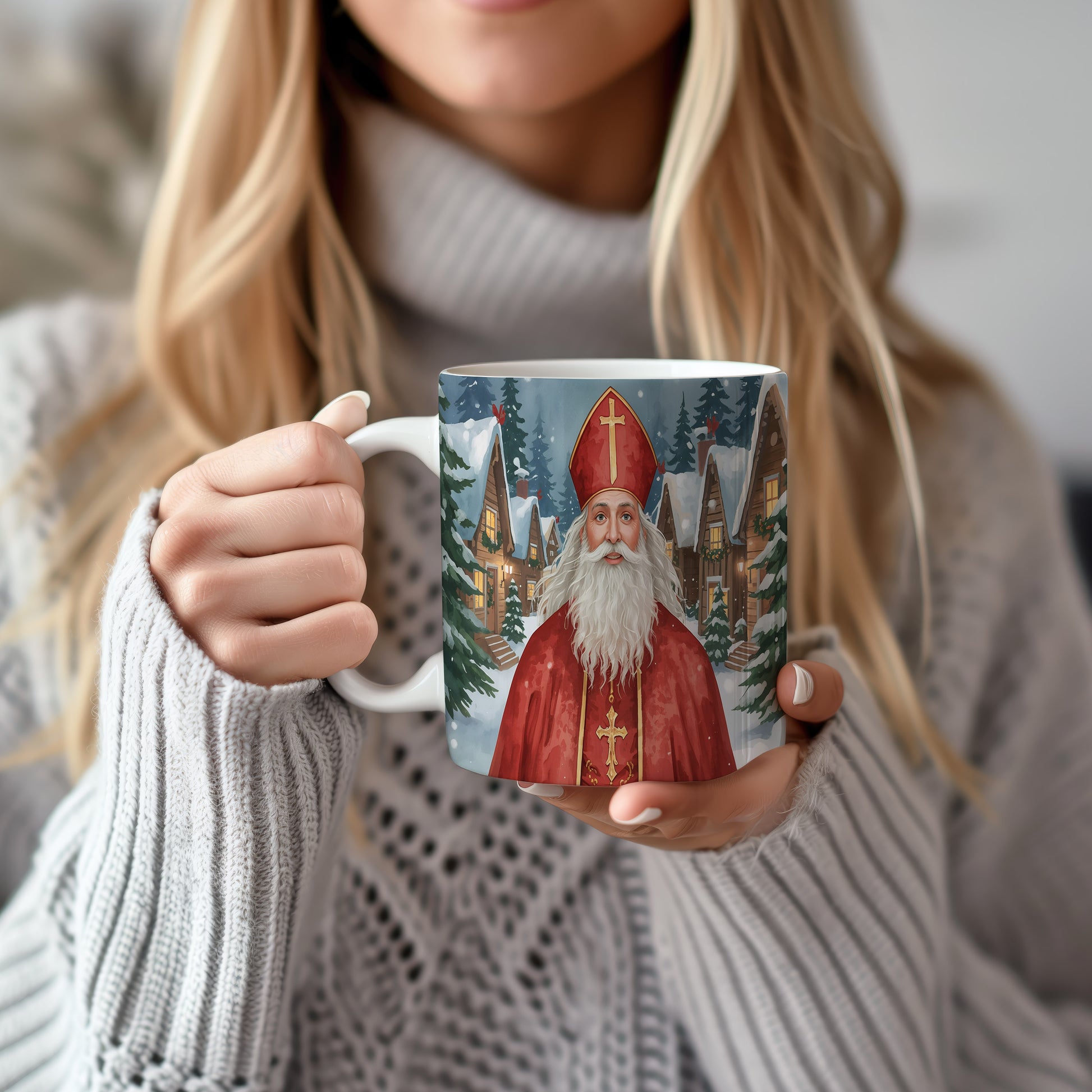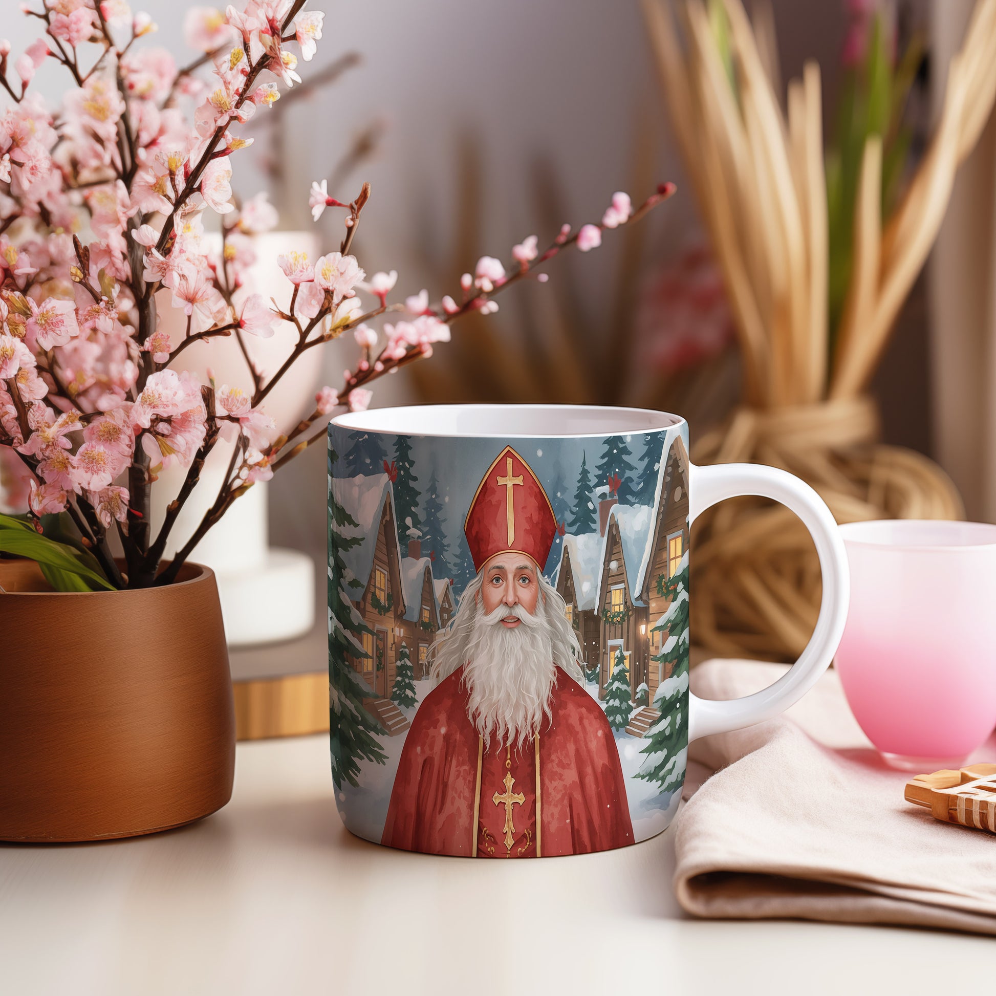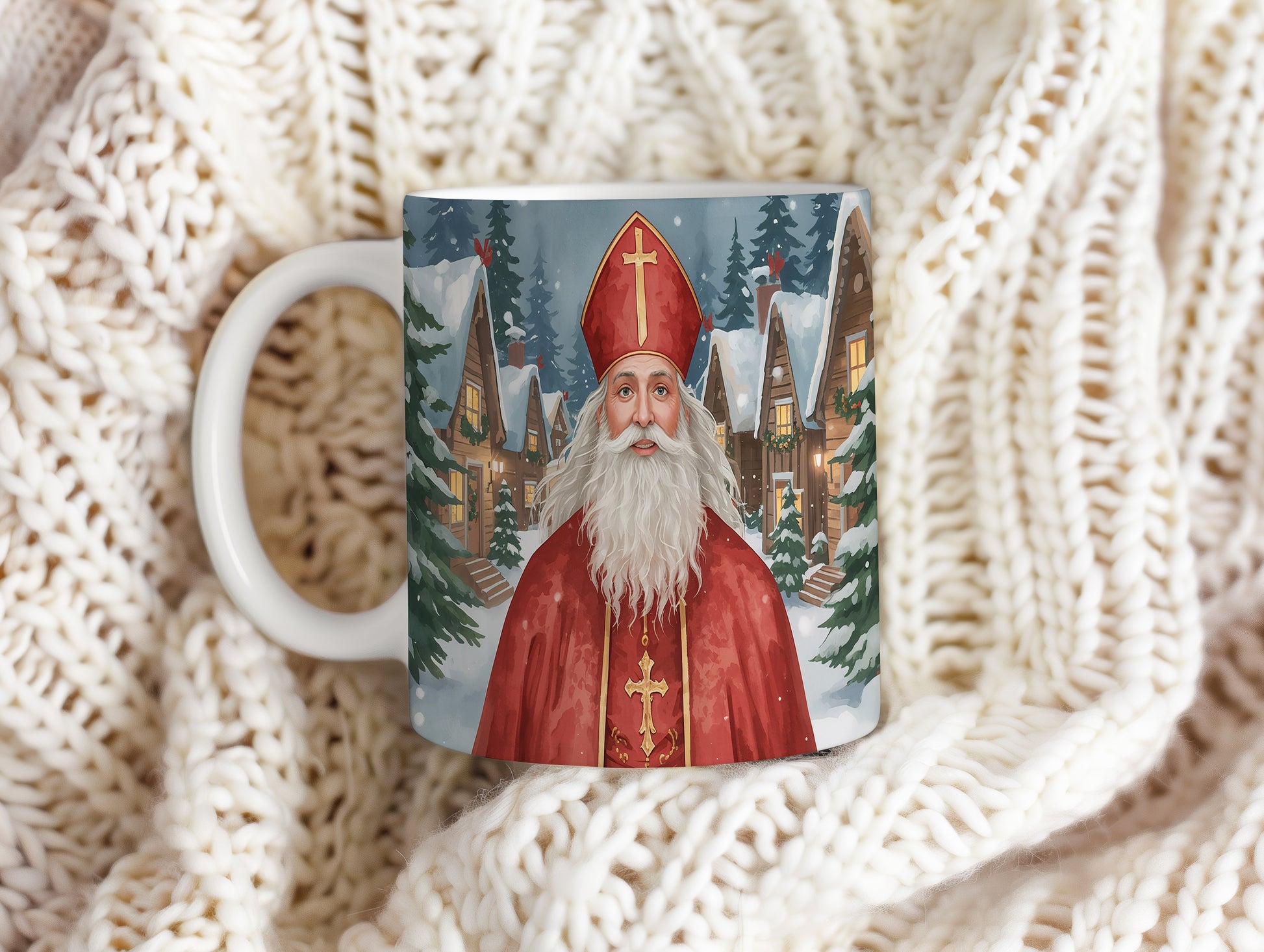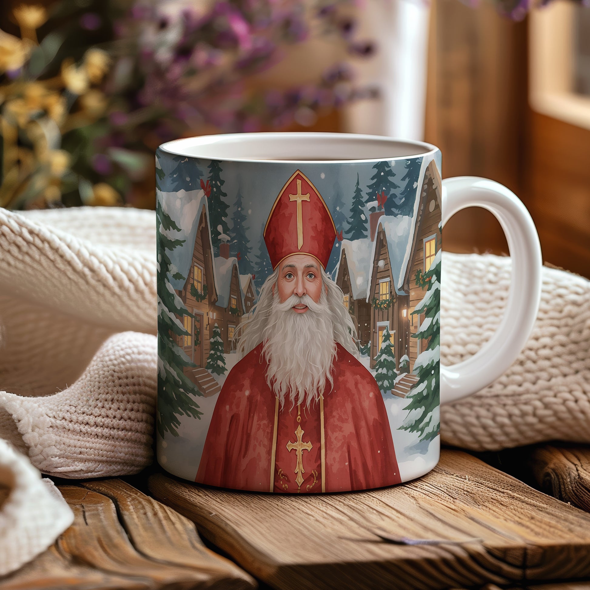 Mikuláš v červeném rouchu září na pozadí zasněžené vesnice s malebnými chaloupkami. Atmosféra plná klidu a zimního kouzla. Hrnek 330ml – vhodný do myčky i mikrovlnky.