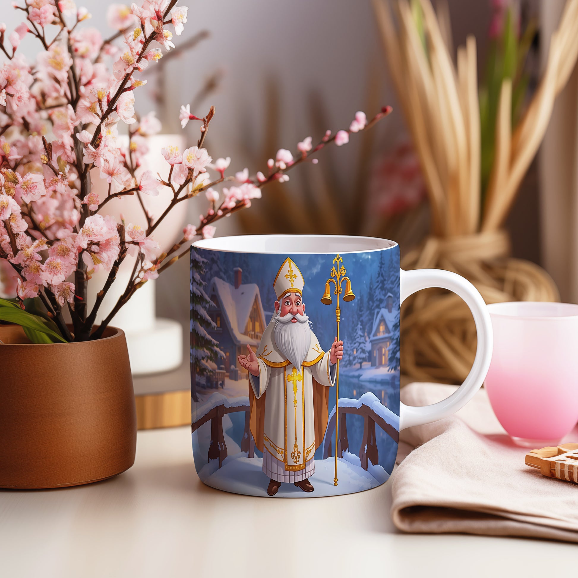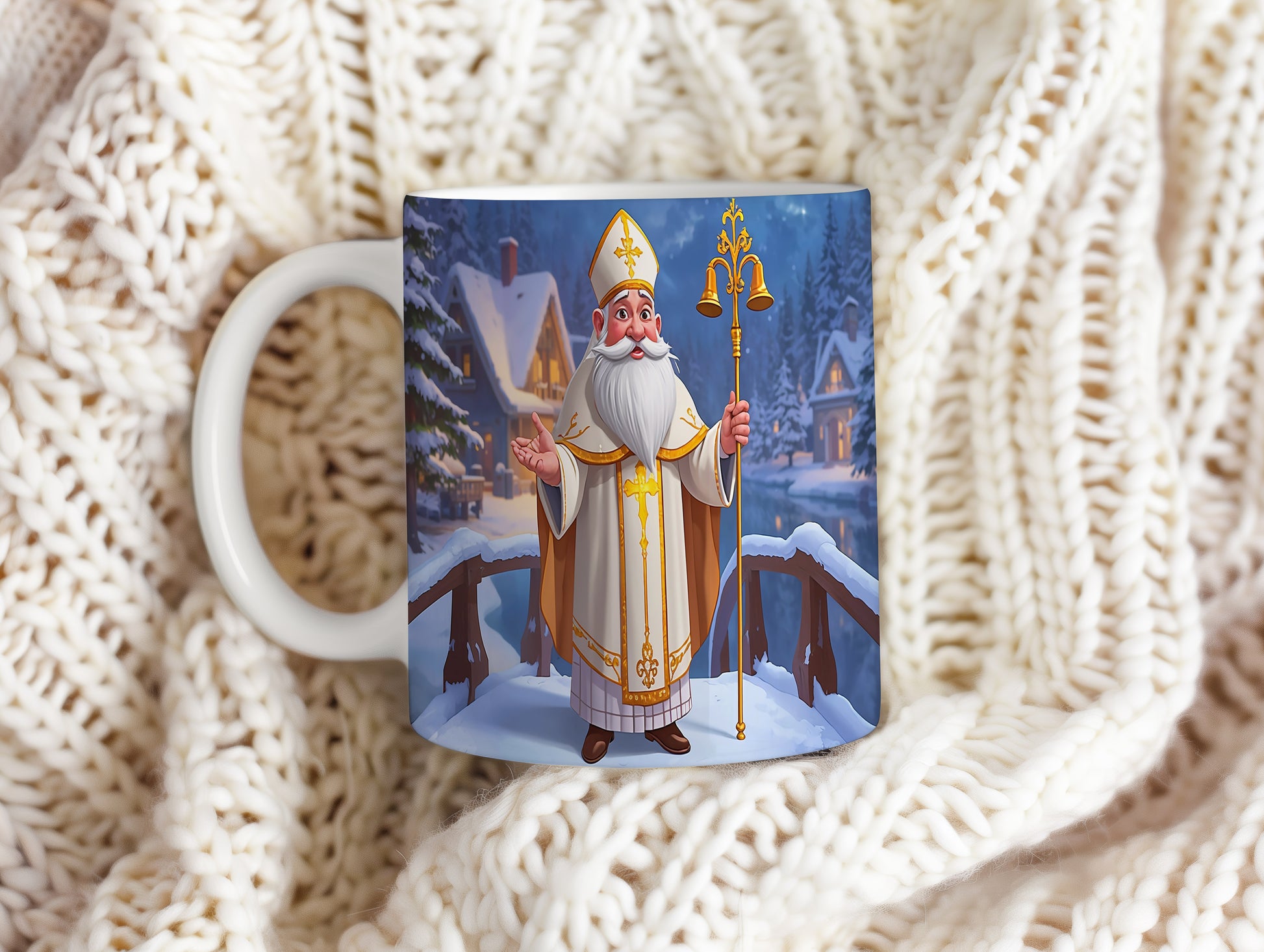 Mikuláš v červeném rouchu stojí na zasněženém mostě s pohledem na klidnou zimní vesnici. Atmosféra je plná klidu a svátečního kouzla. Hrnek 330ml – vhodný do myčky i mikrovlnky.