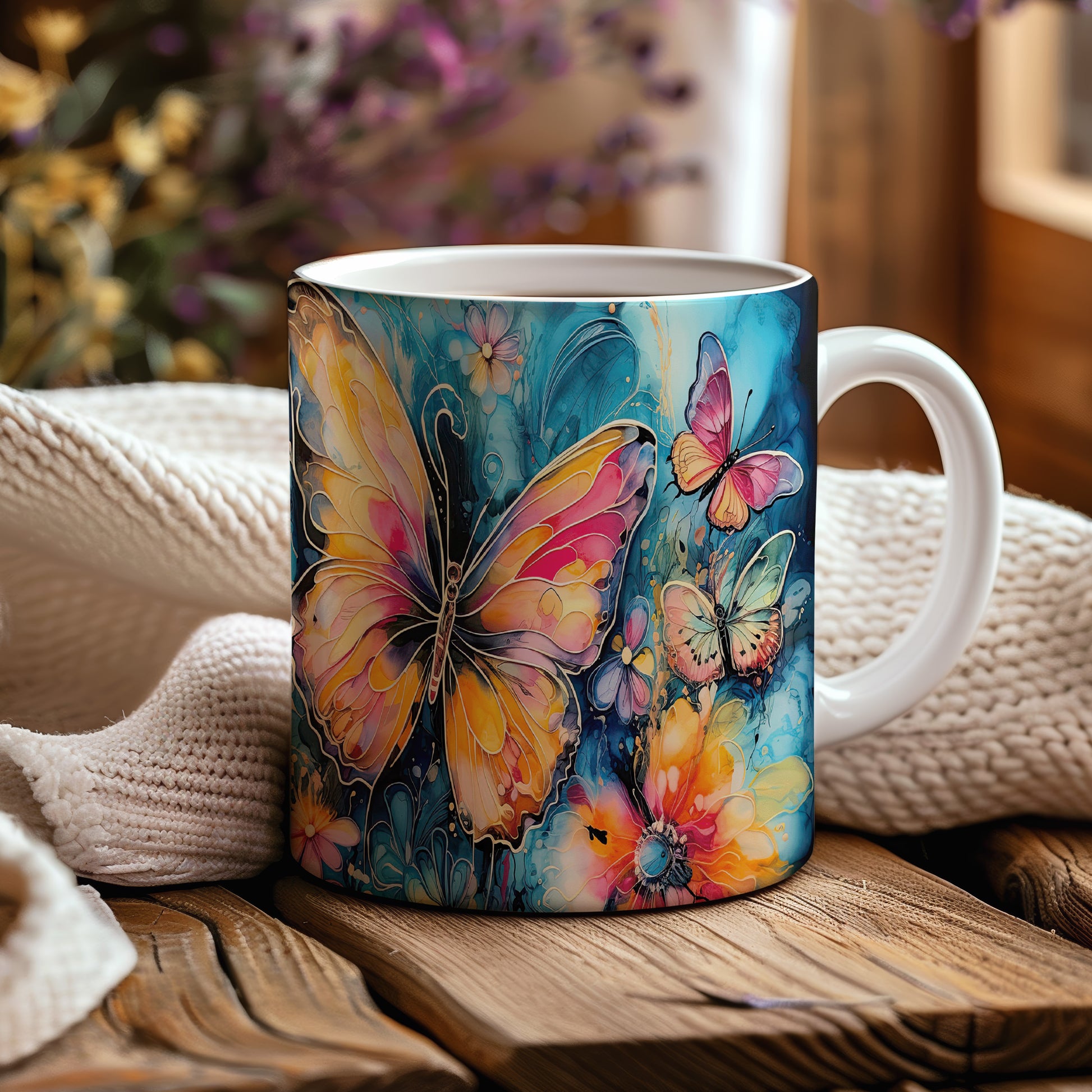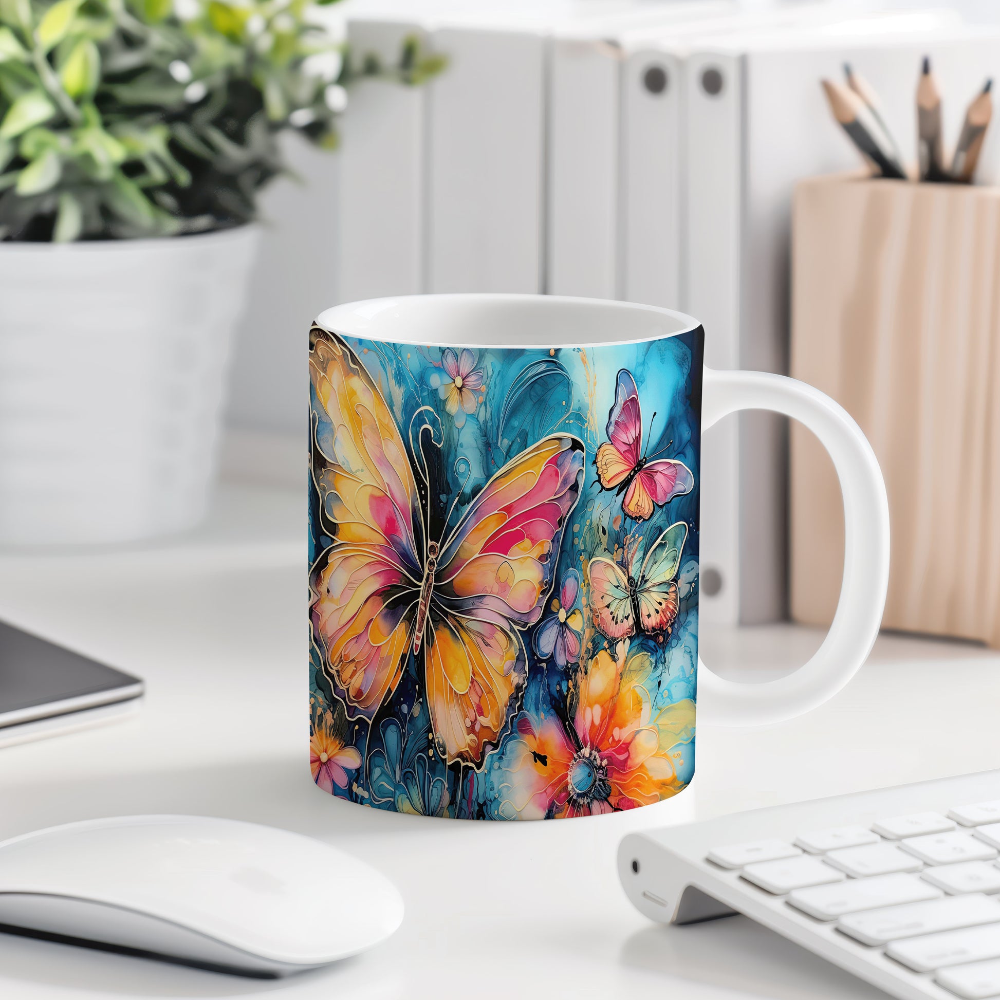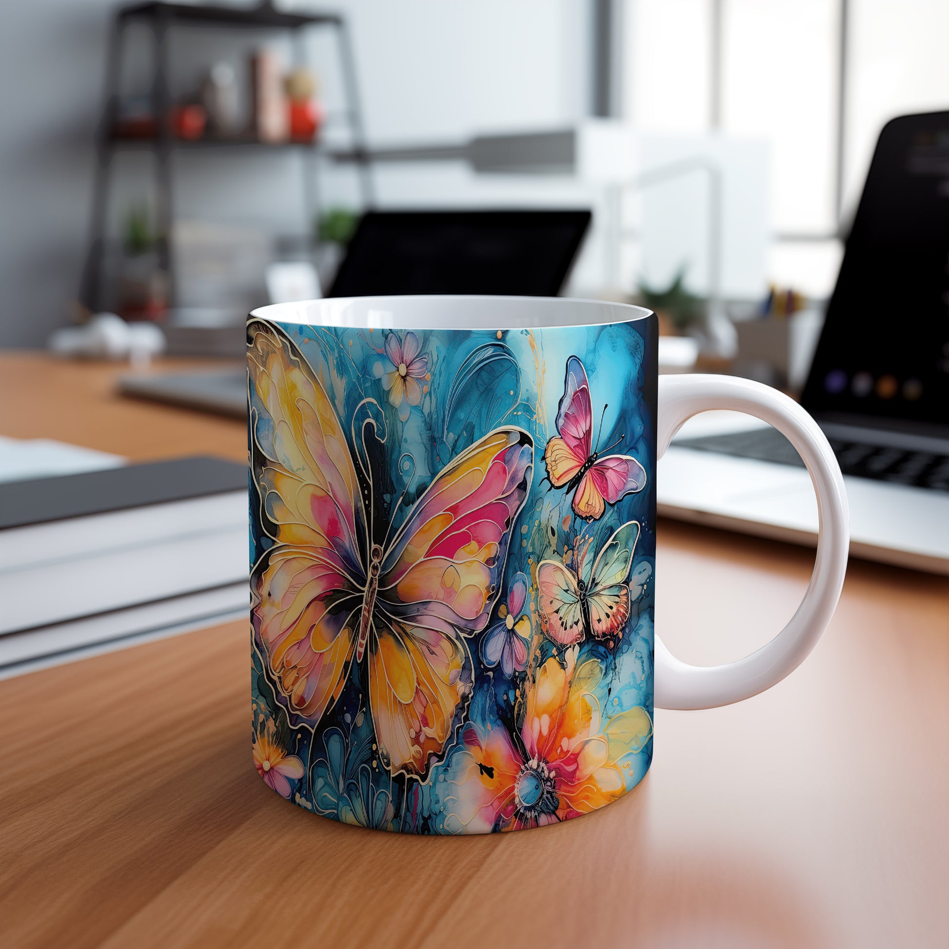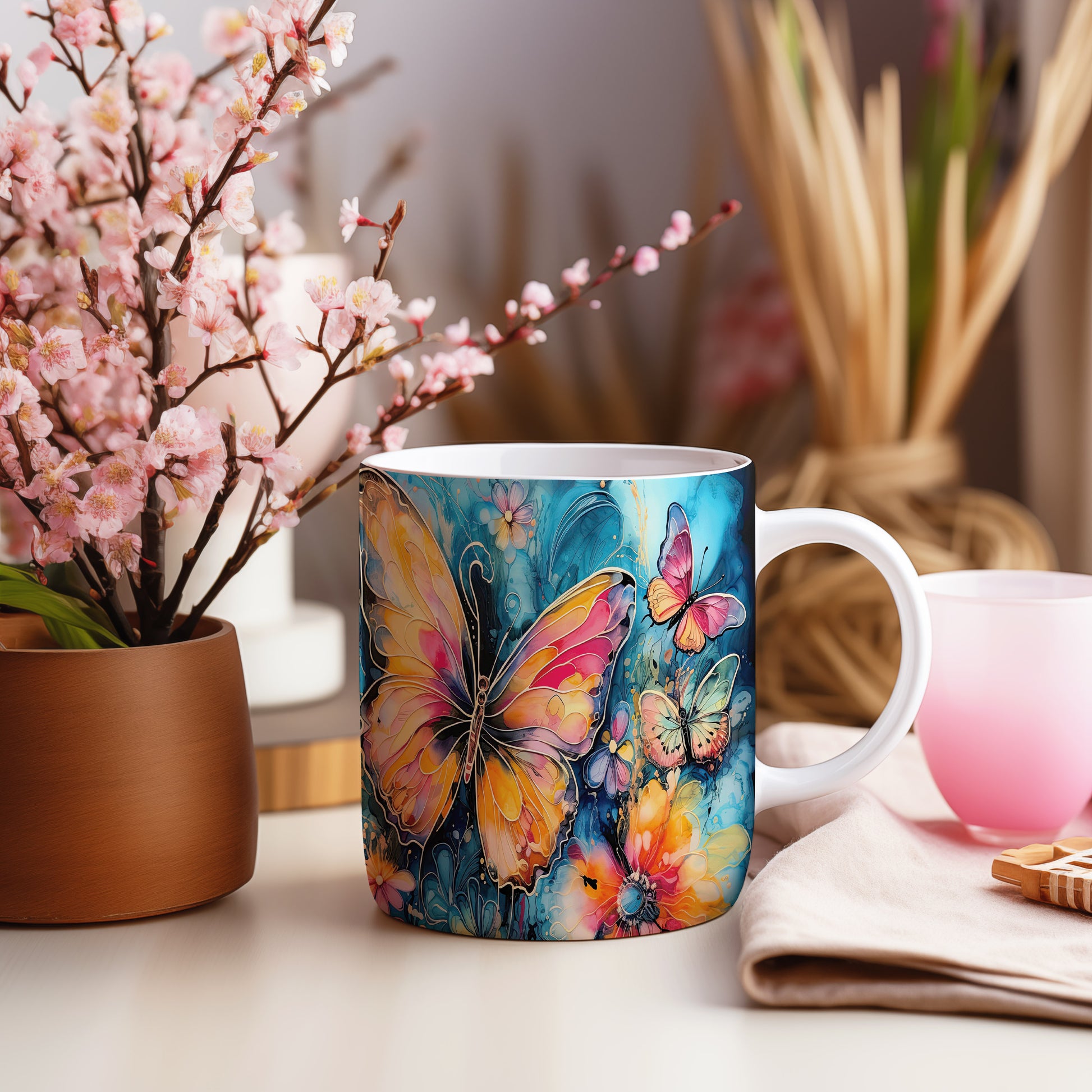 Elegantní hrnek zdobený barevnými motýly. Tento motiv evokuje přírodu a jaro, ideální pro milovníky květin a zvířat. Skvělý tip na dárek pro přátele nebo rodinu. Materiál: keramika. Objem: 330 ml. Vhodné do myčky i mikrovlnky. Užívejte si kávu nebo čaj s tímto stylovým hrnkem, který přináší radost do každého dne.