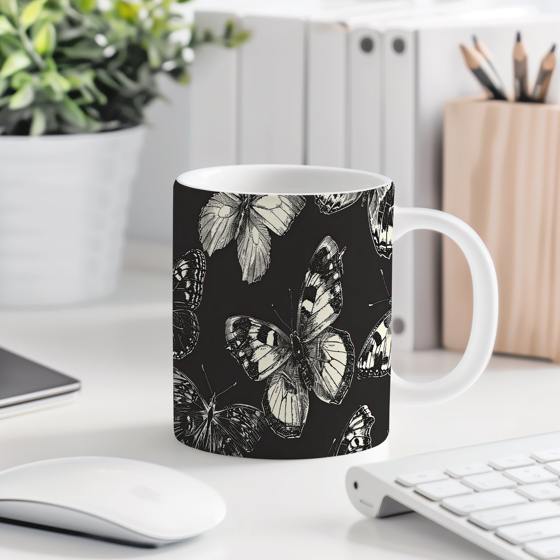 Tento krásný hrnek s designem motýlů v kontrastních barvách je ideální pro milovníky přírody. Skvělý tip na dárek pro přátele nebo rodinu, kteří ocení jedinečný styl. Materiál: keramika. Objem: 330 ml. Vhodné do myčky i mikrovlnky. Používání tohoto hrnku přináší radost z každého doušku.