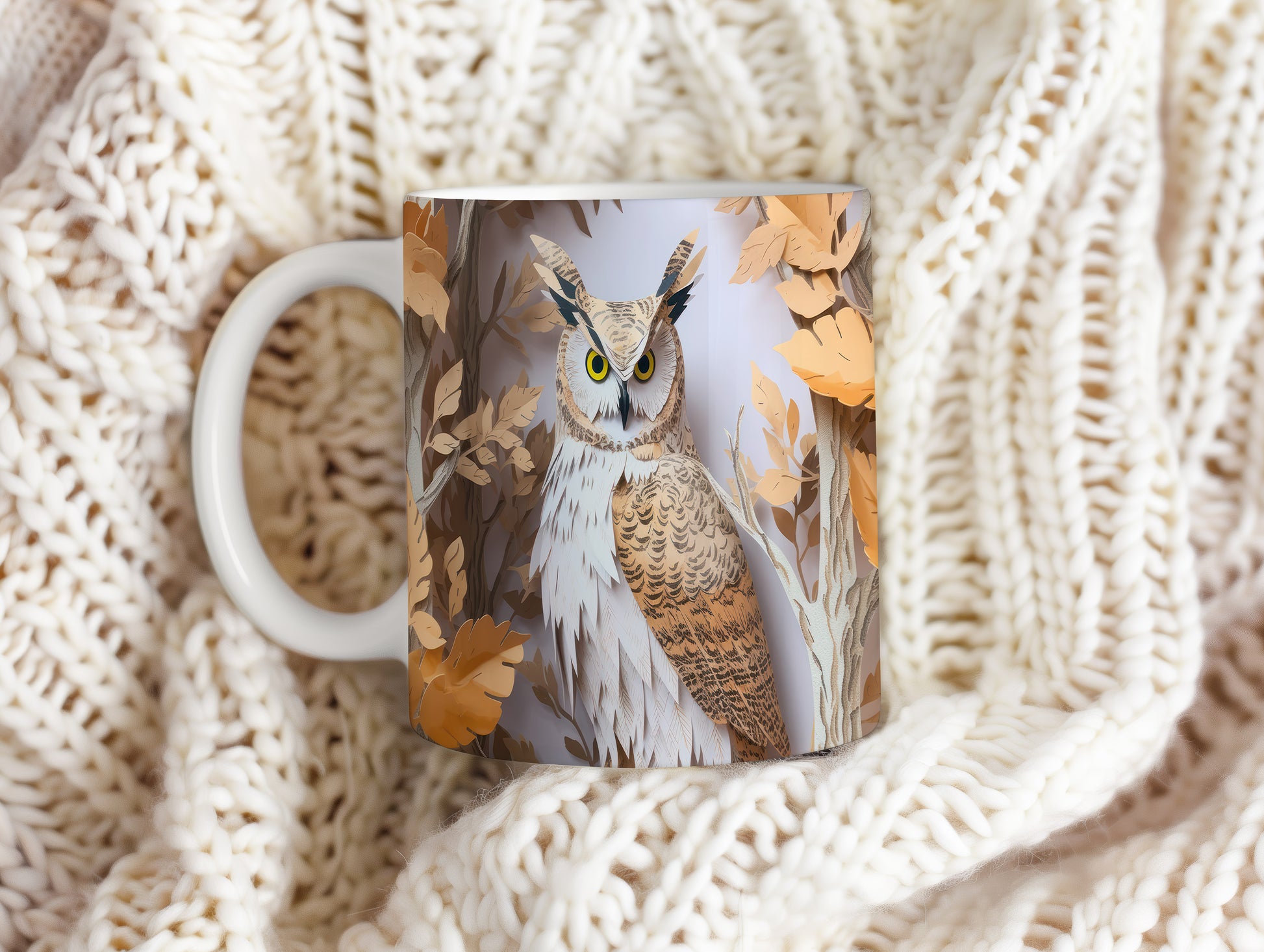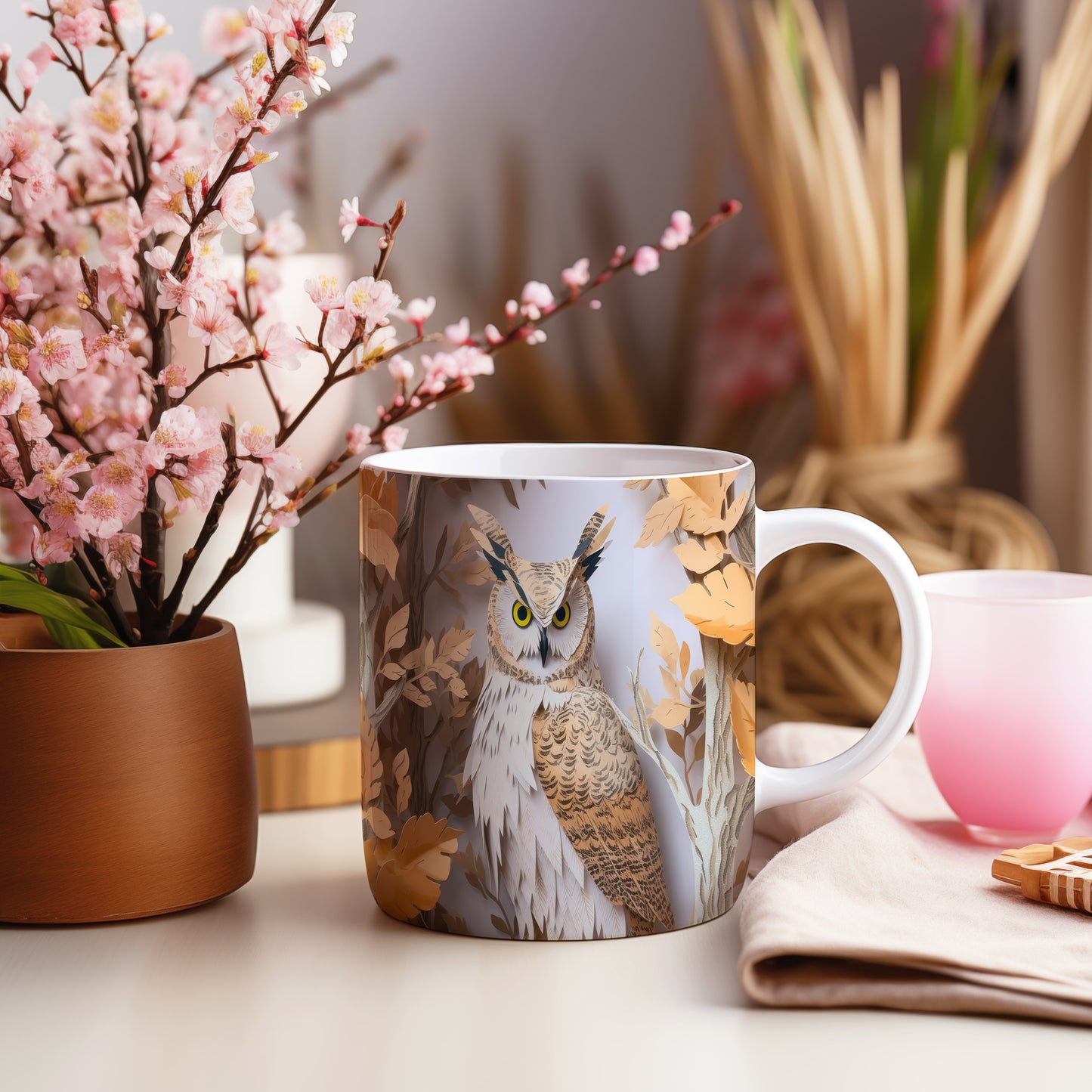 Hrnek s motivem sovy v přírodě