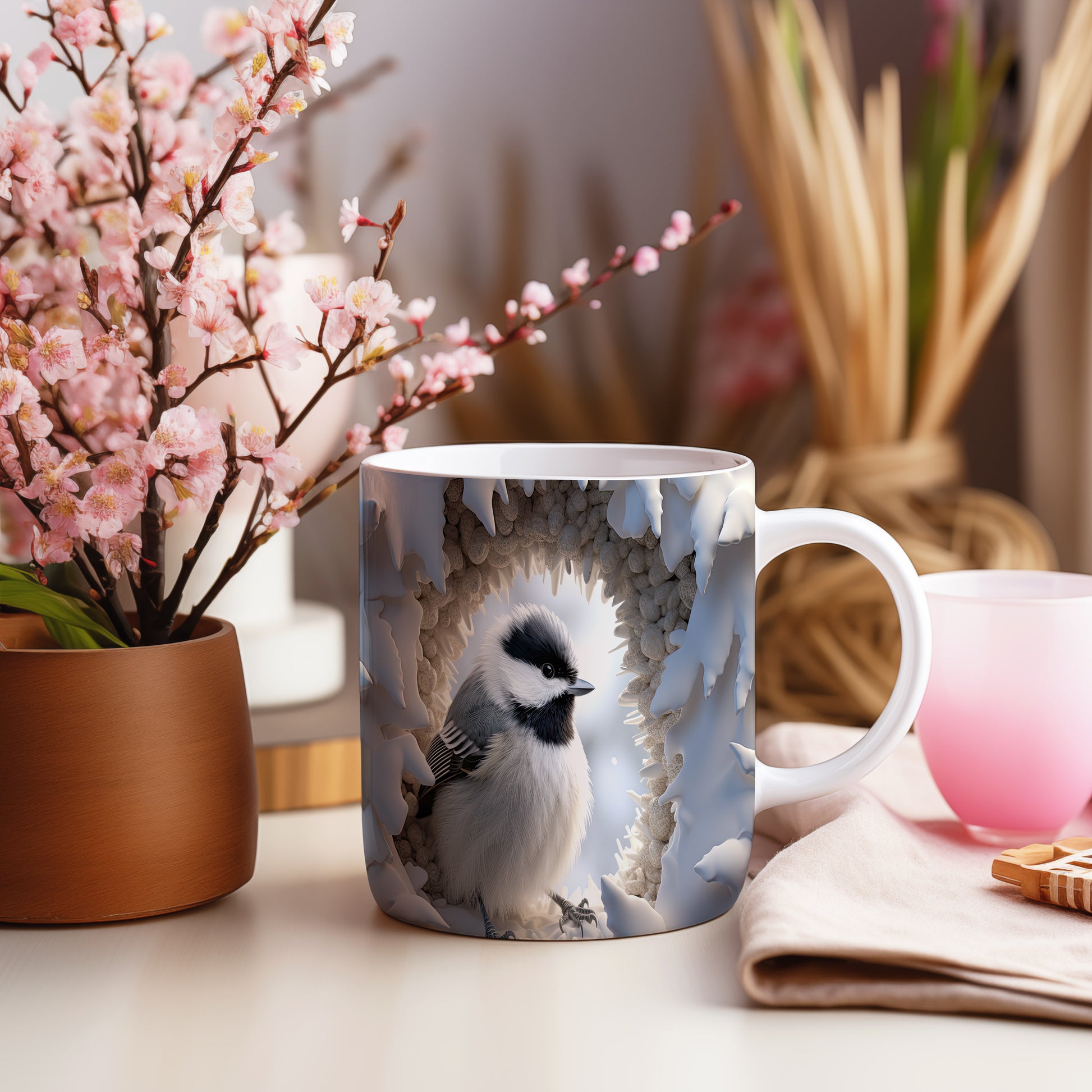 Hrnek s motivem sýkorky v zimním prostředí