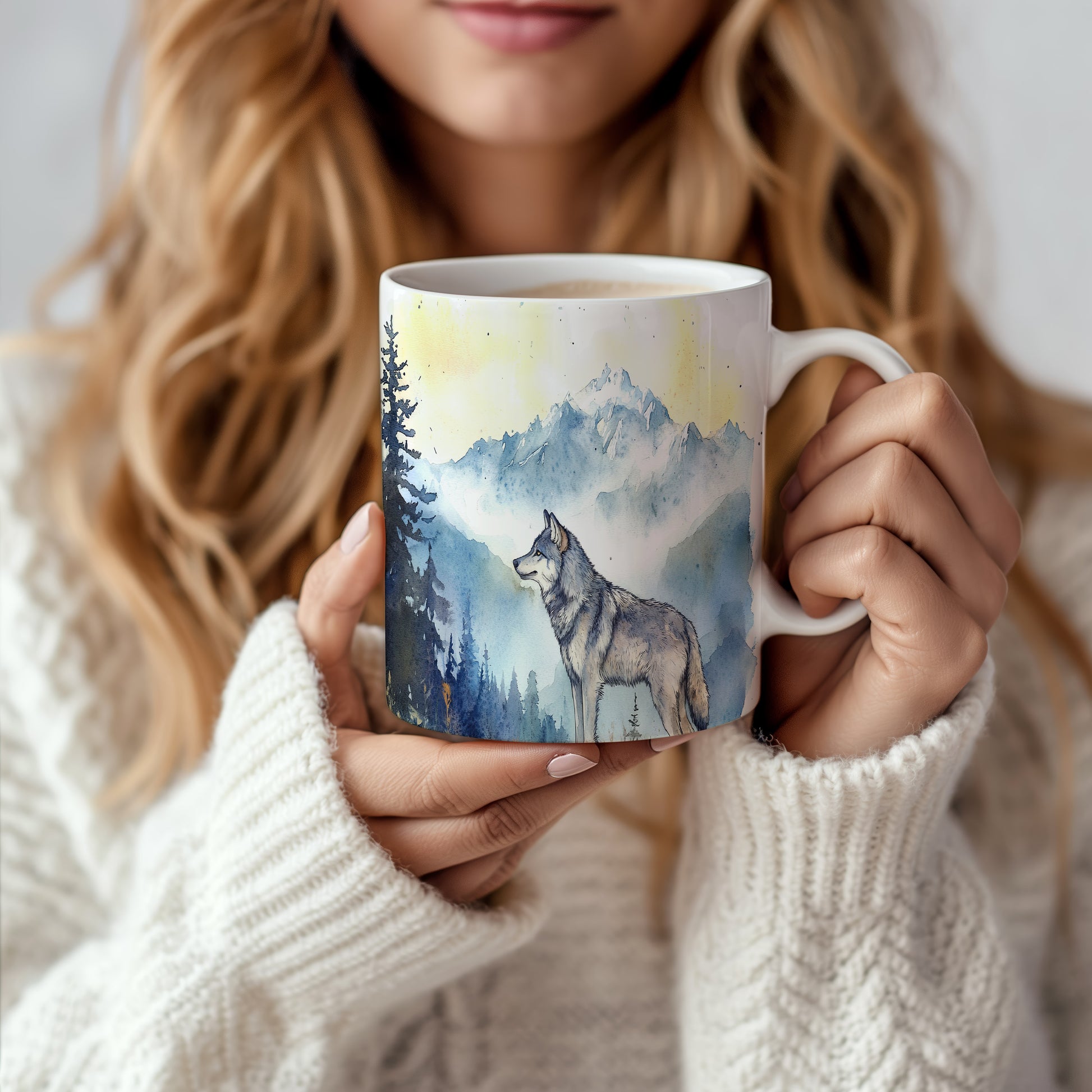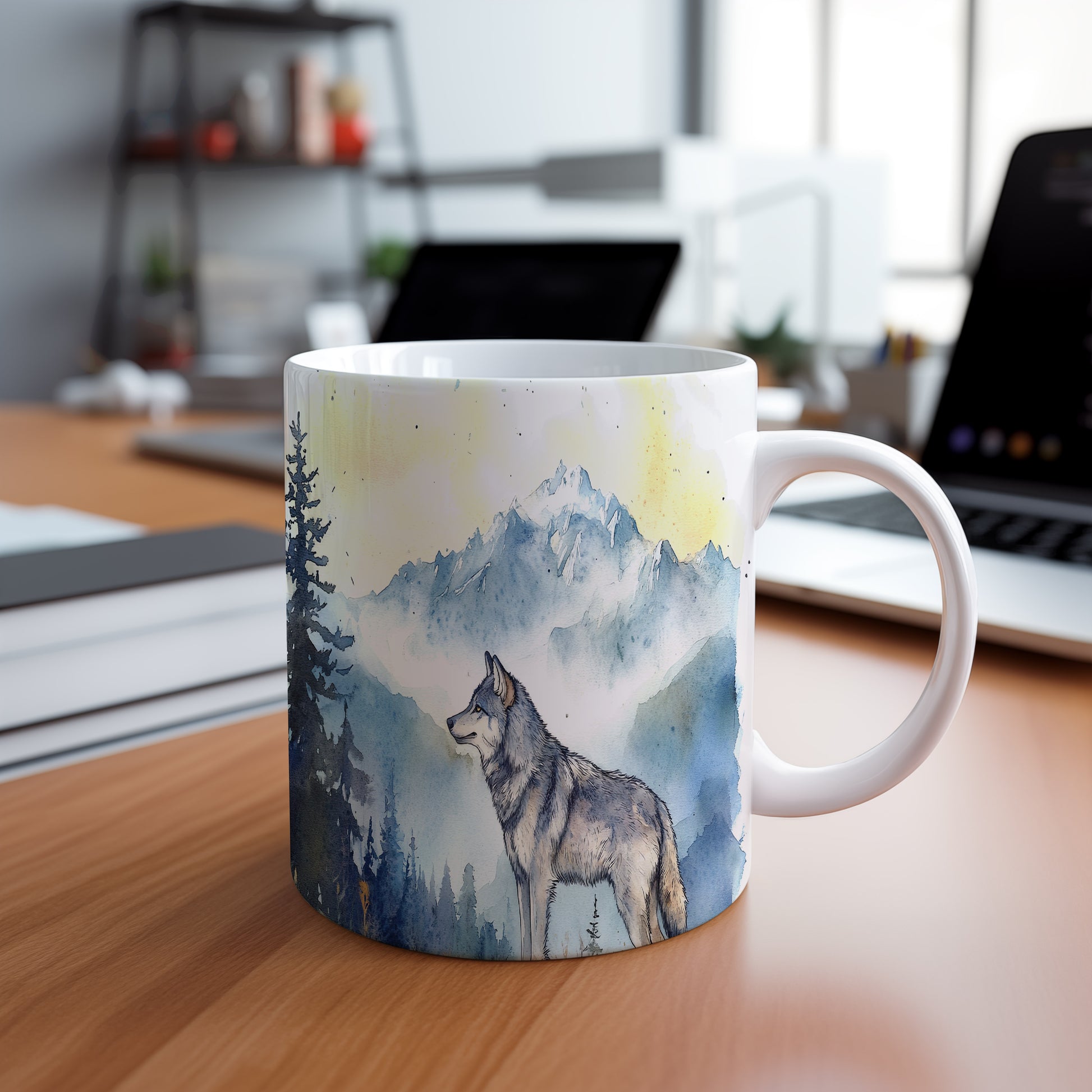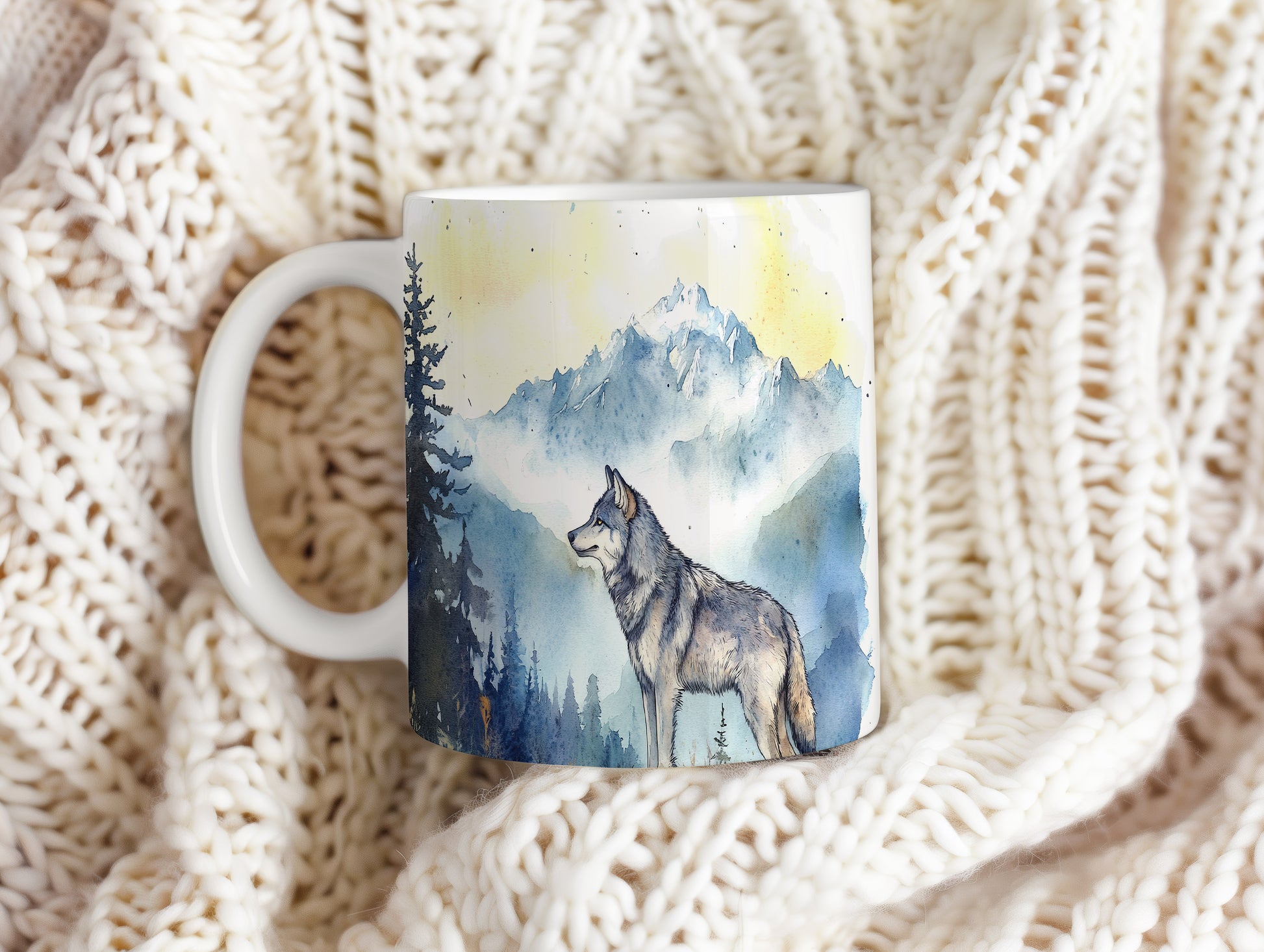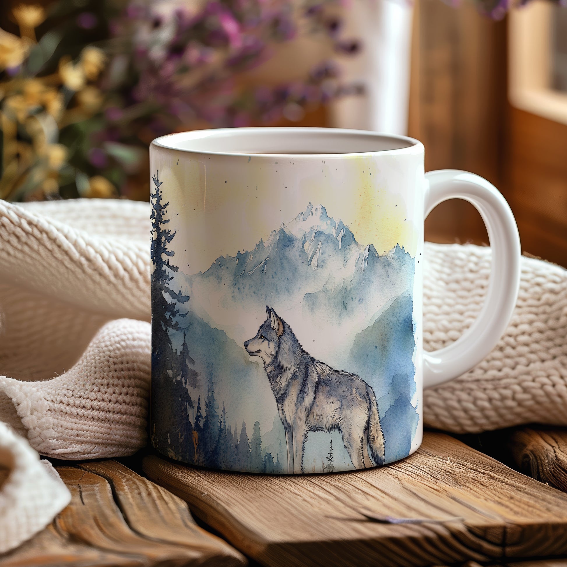 Hrnek s motivem vlka v horské scenérii
