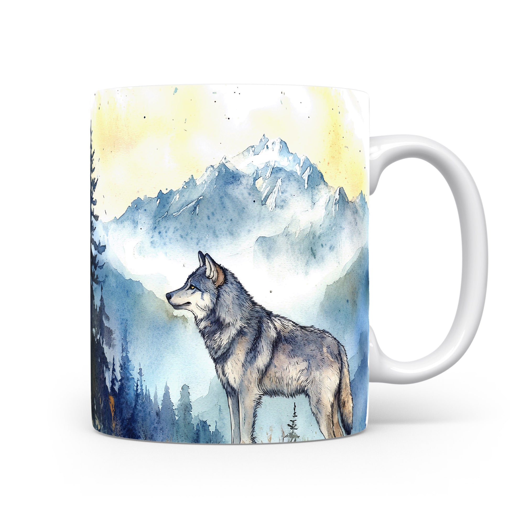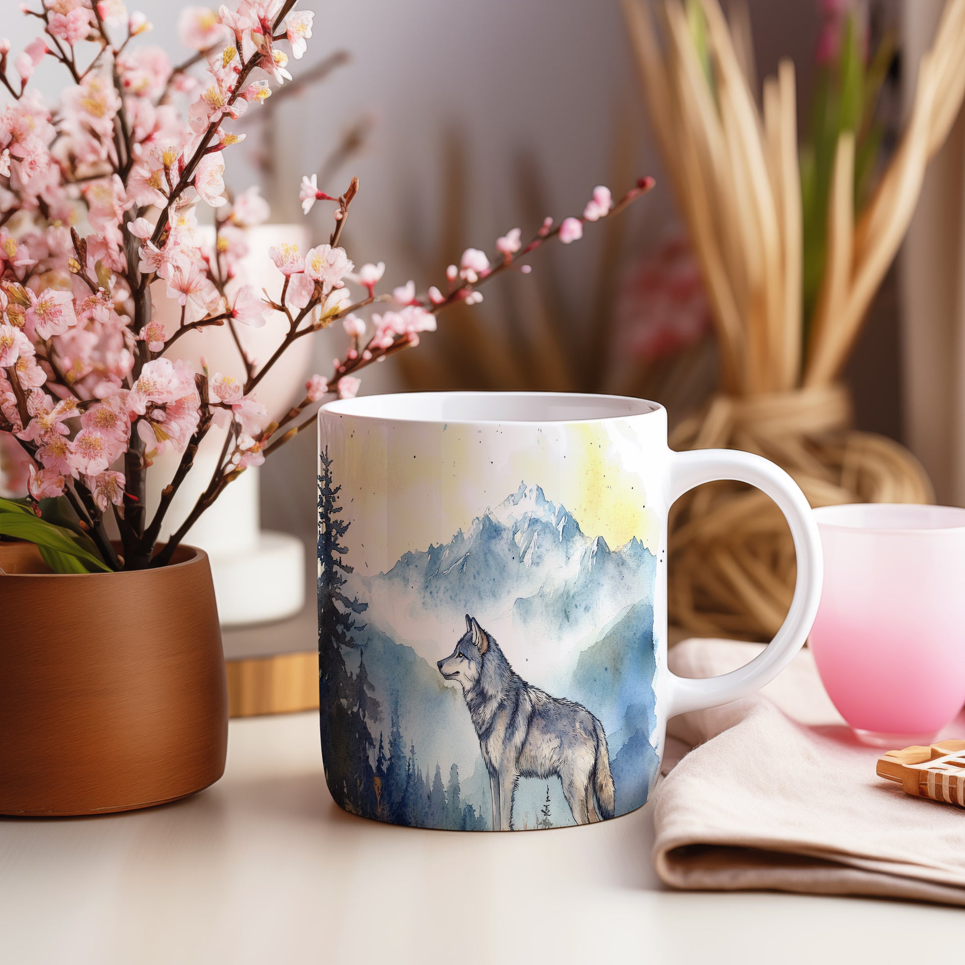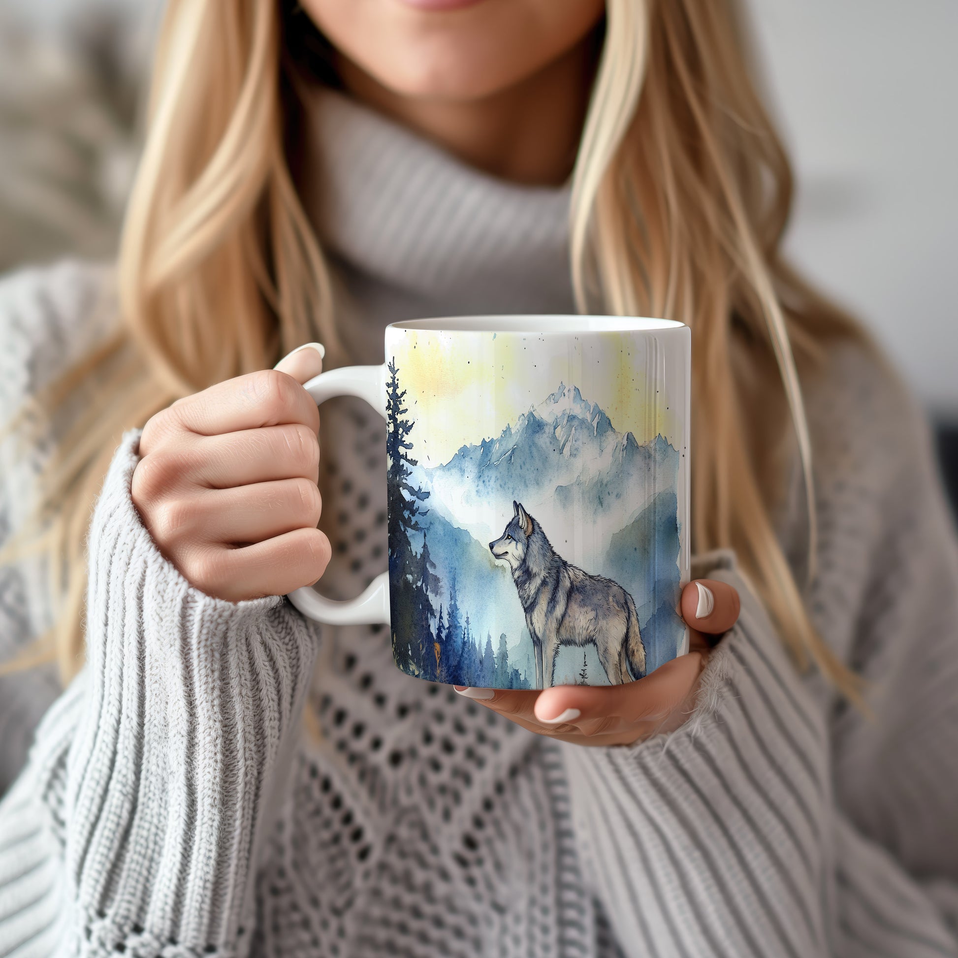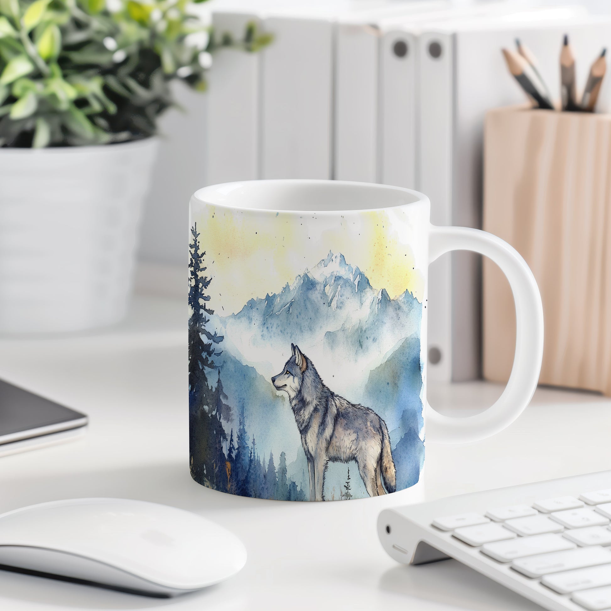 Hrnek s motivem vlka v horské scenérii