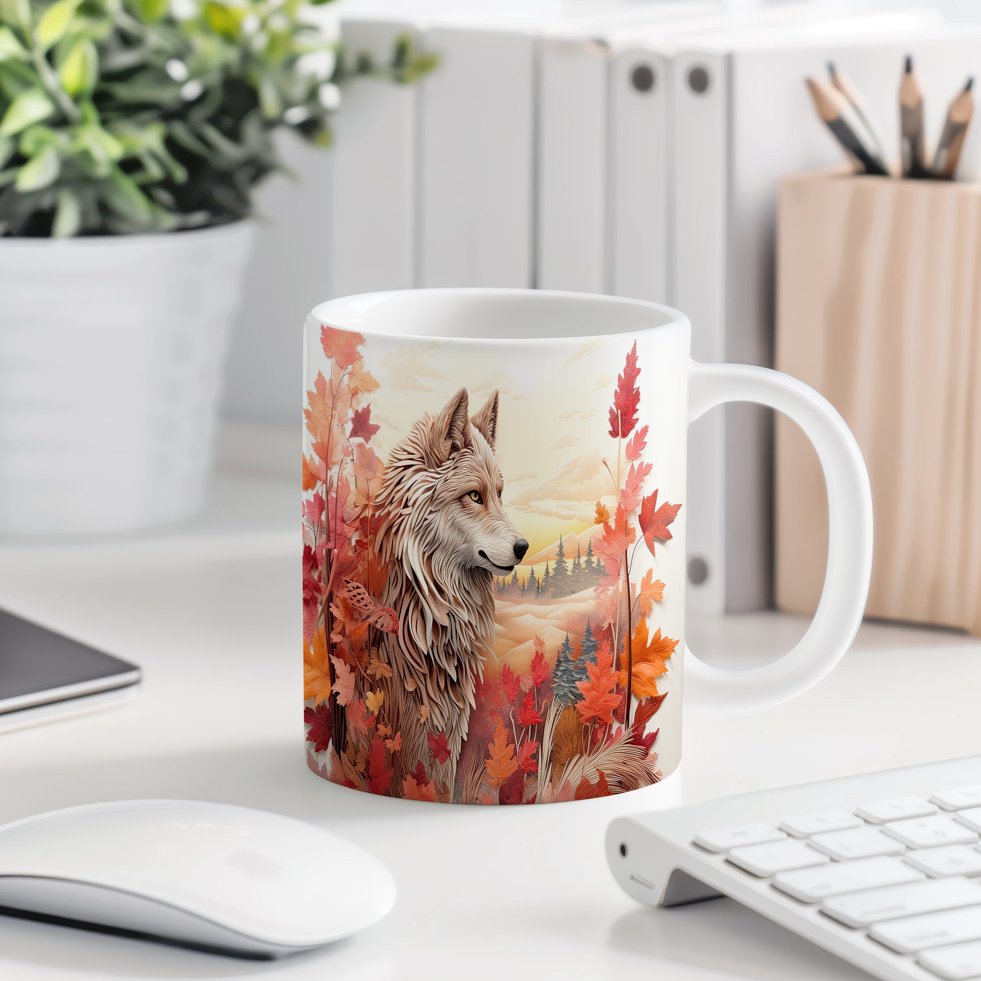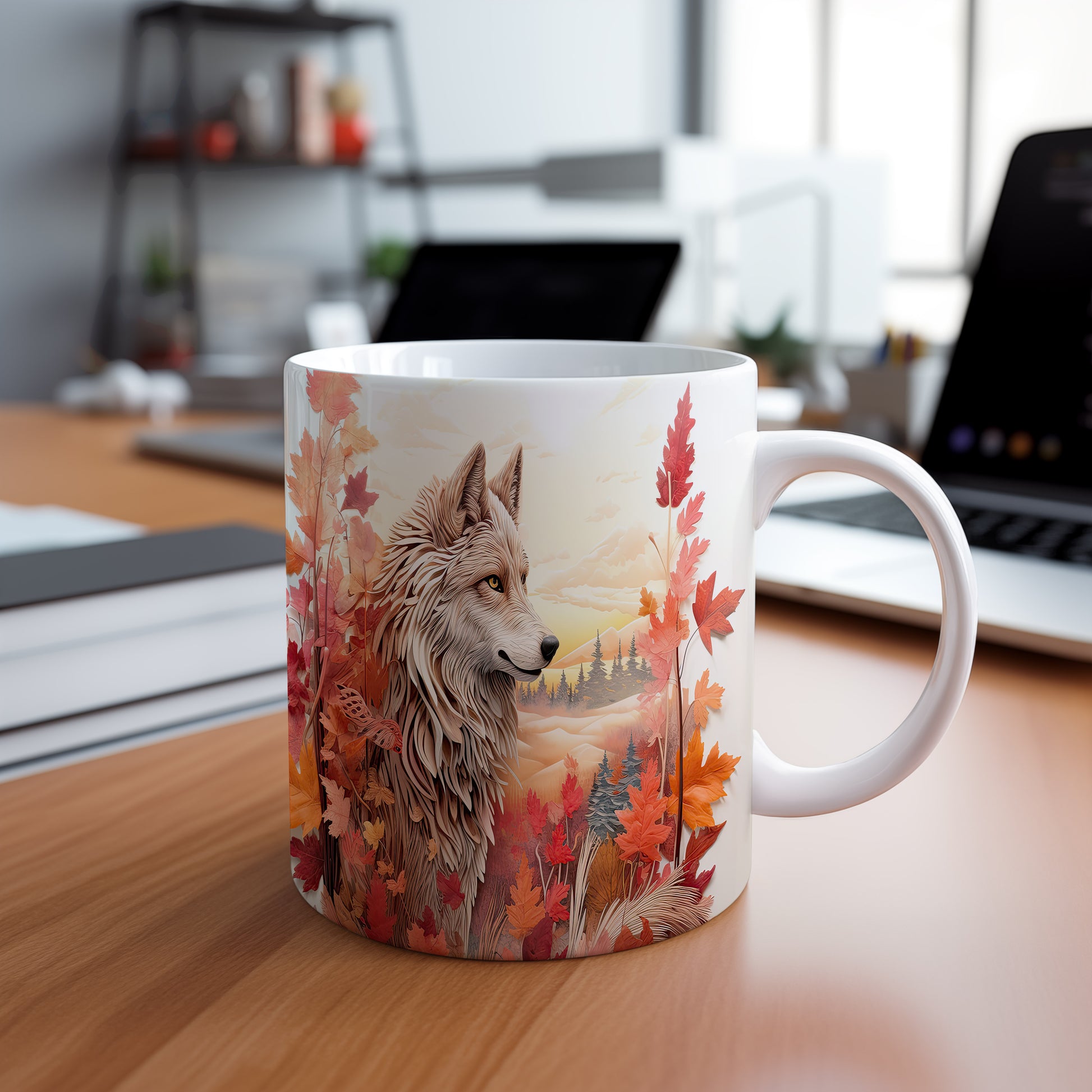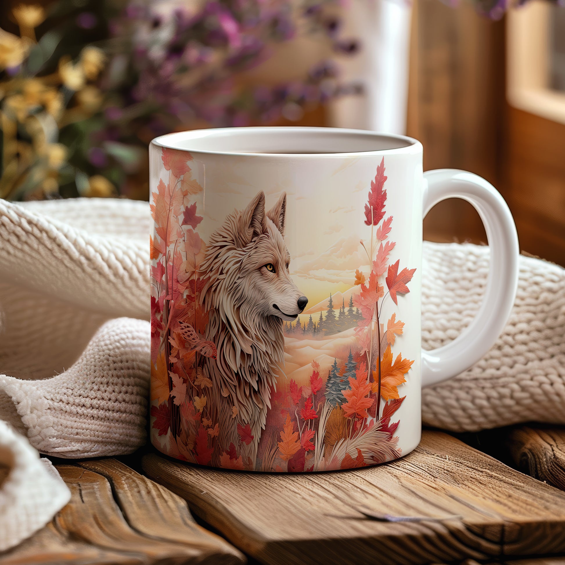 Hrnek s motivem vlka v podzimní krajině