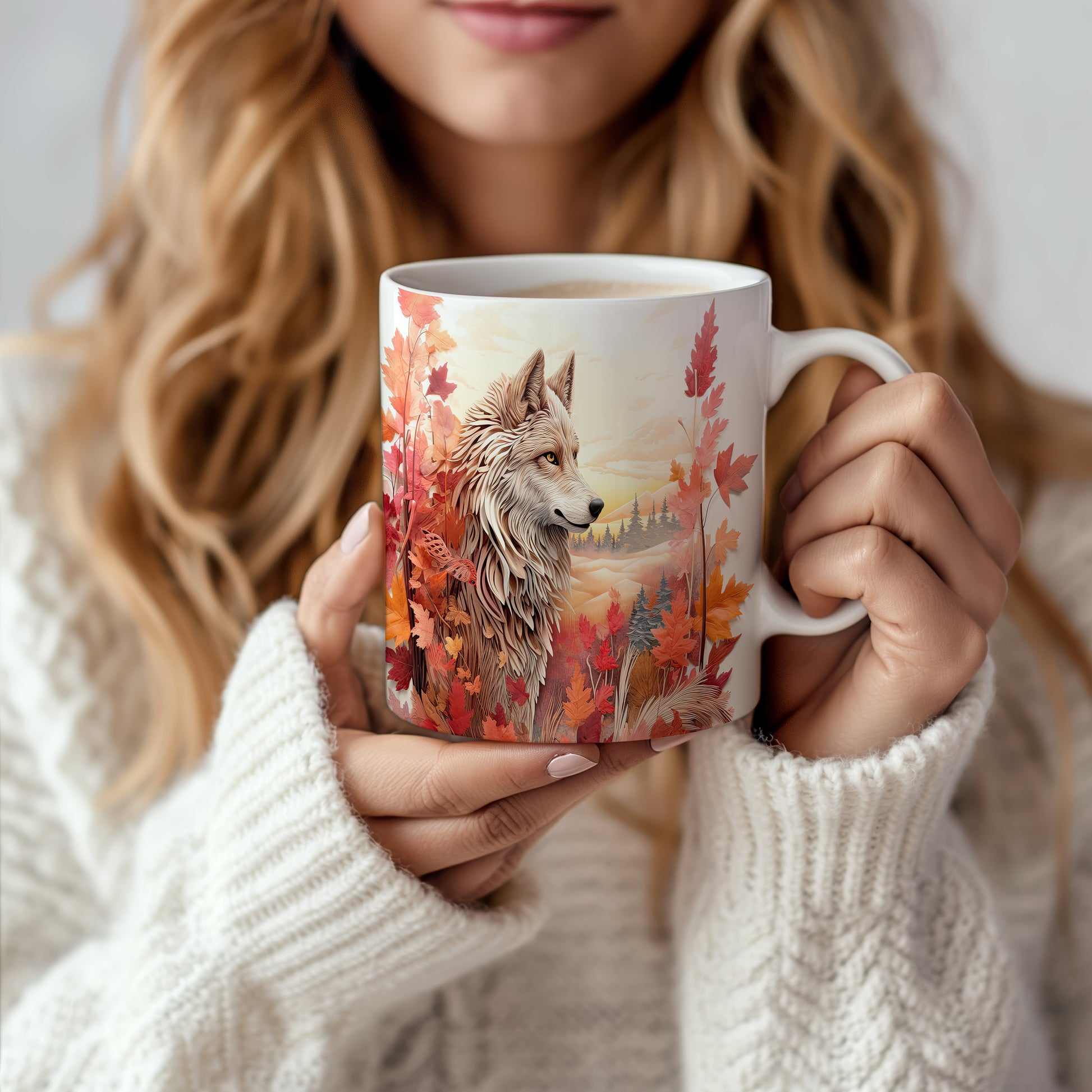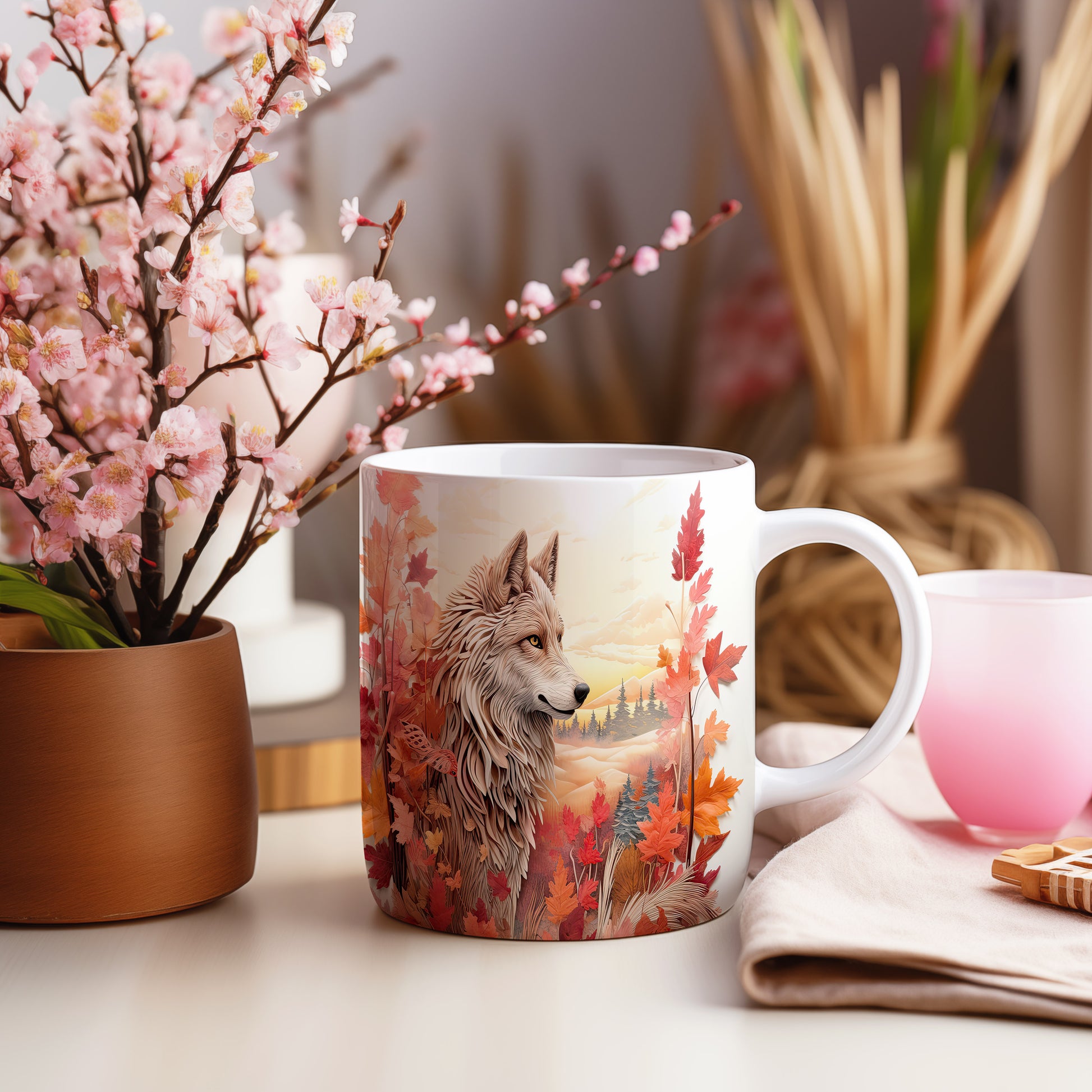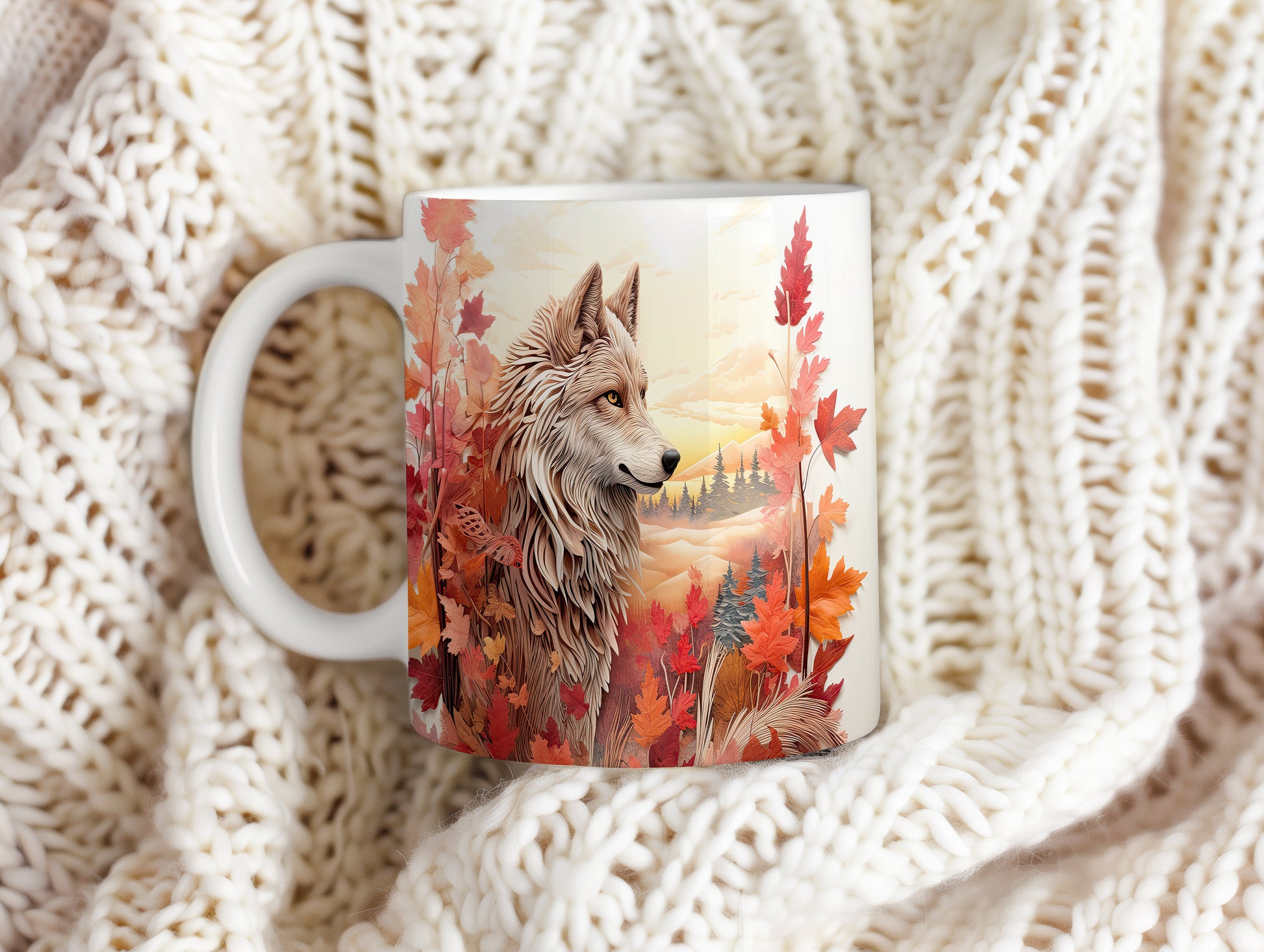 Hrnek s motivem vlka v podzimní krajině