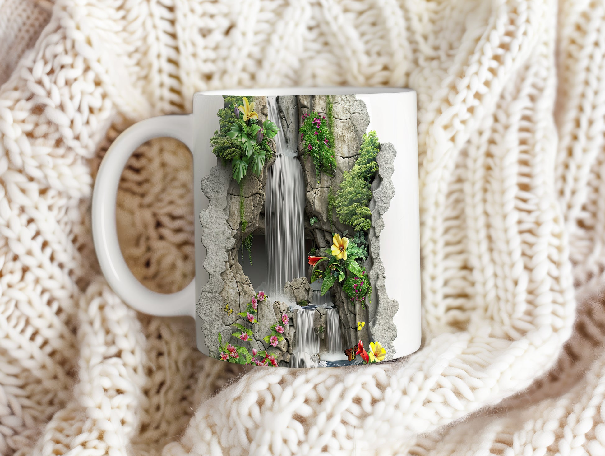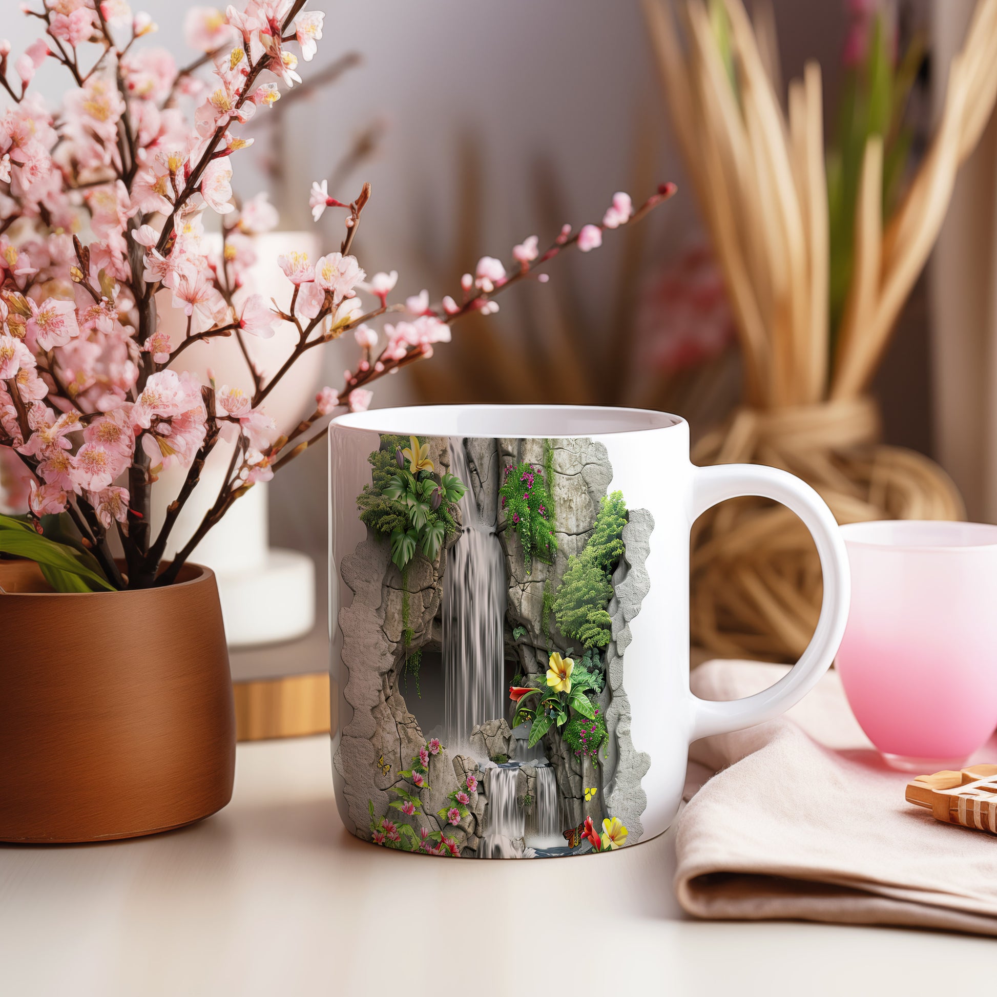 Hrnek s motivem vodopádu a květinami