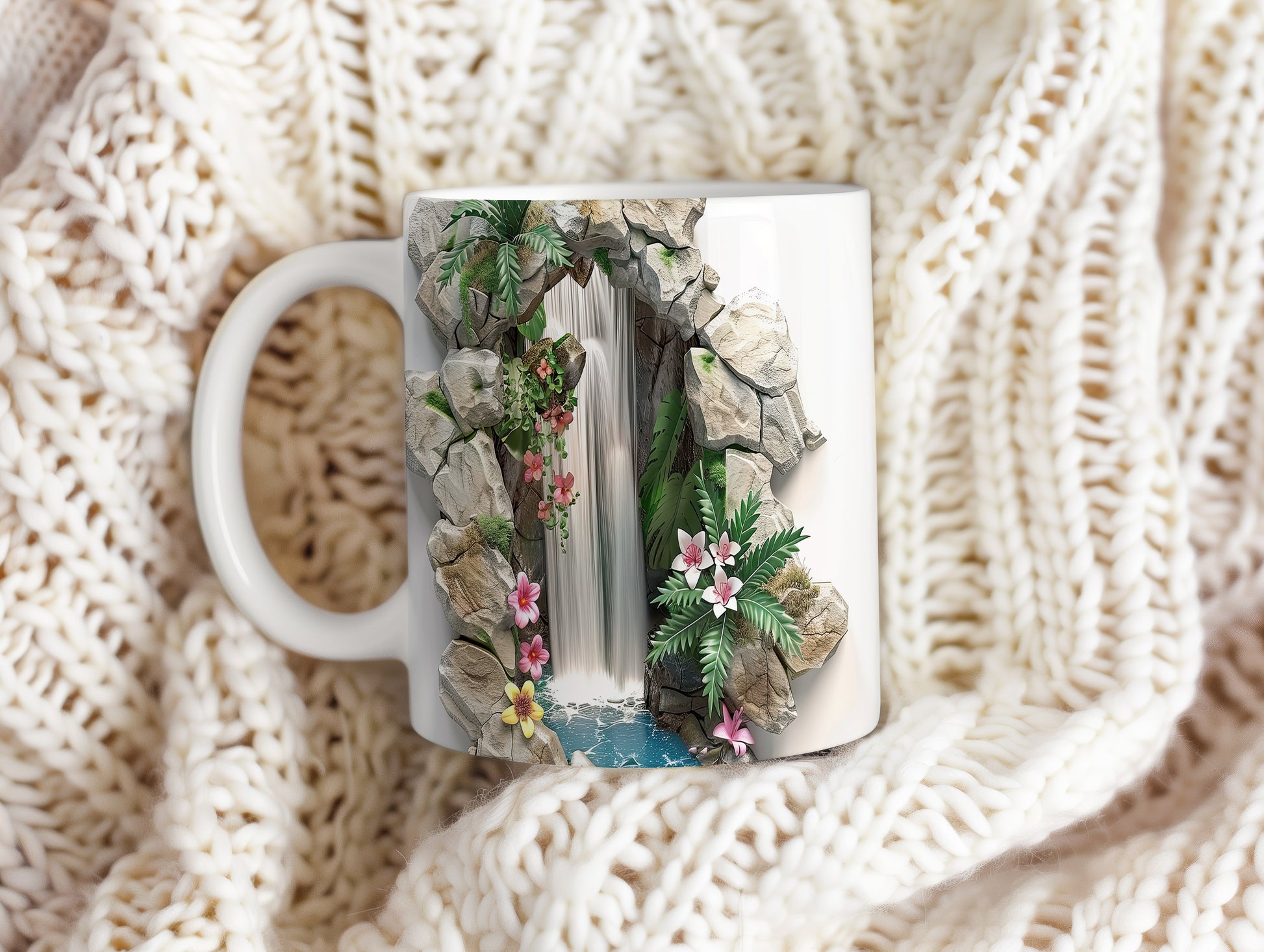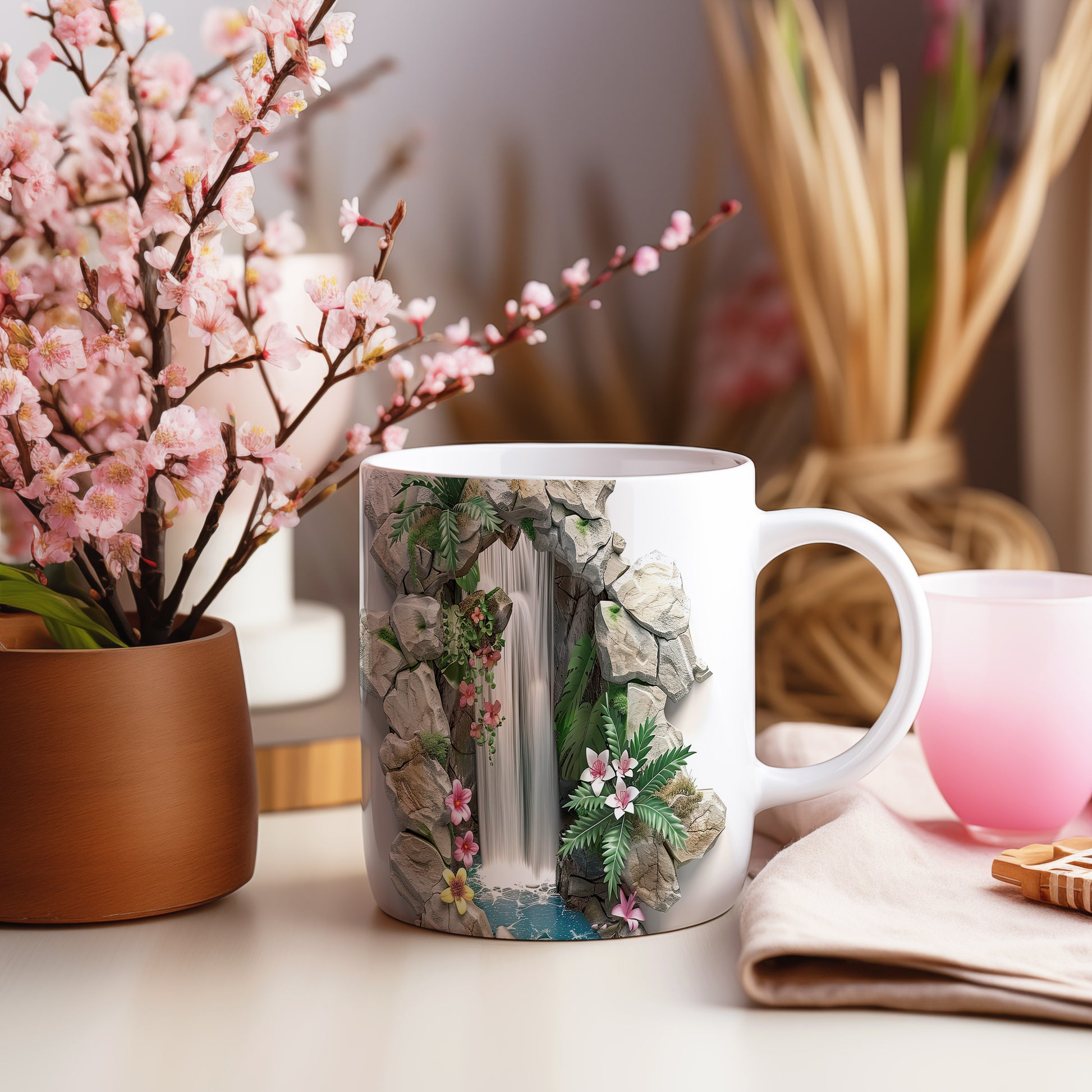 Hrnek s motivem vodopádu a květinami – modrými detaily