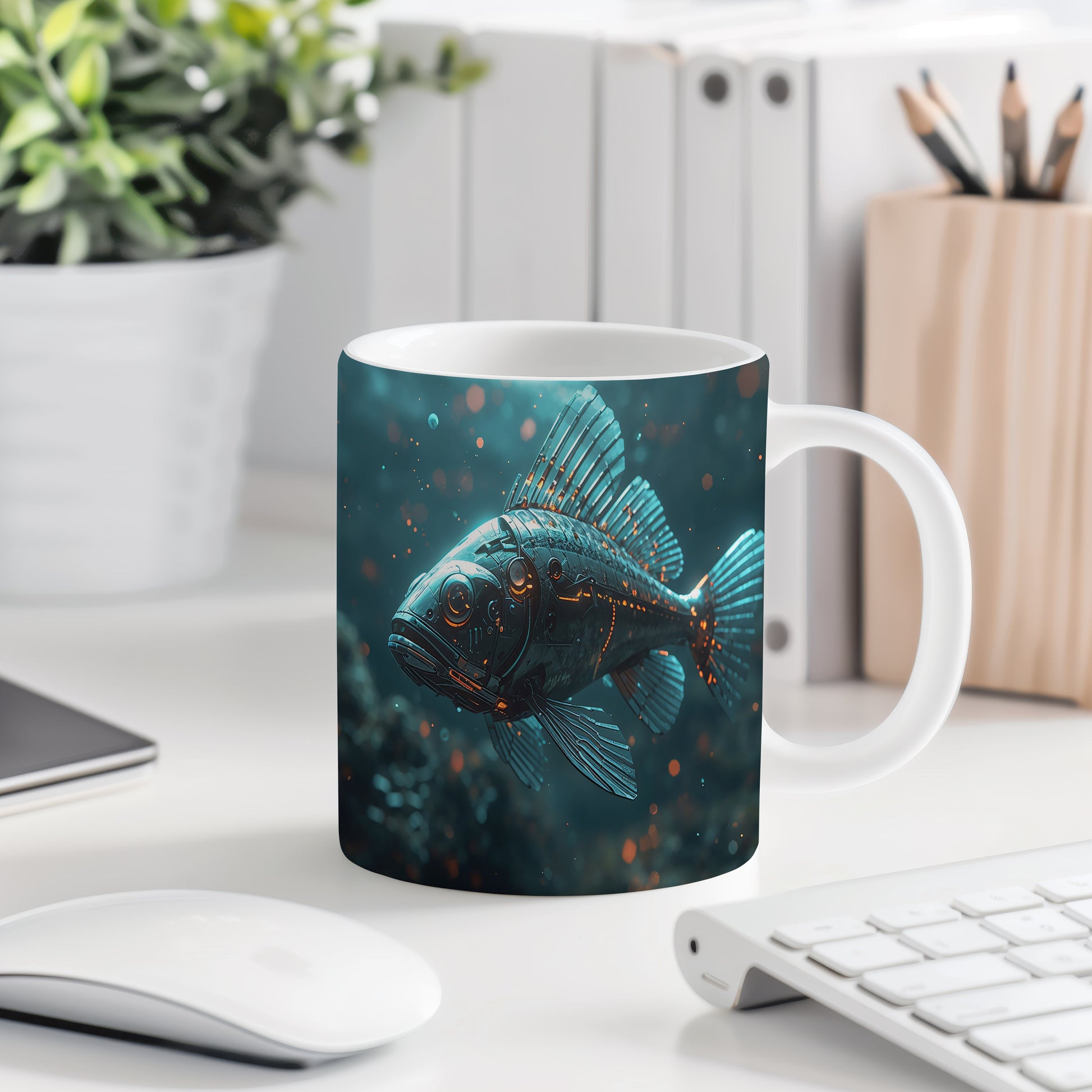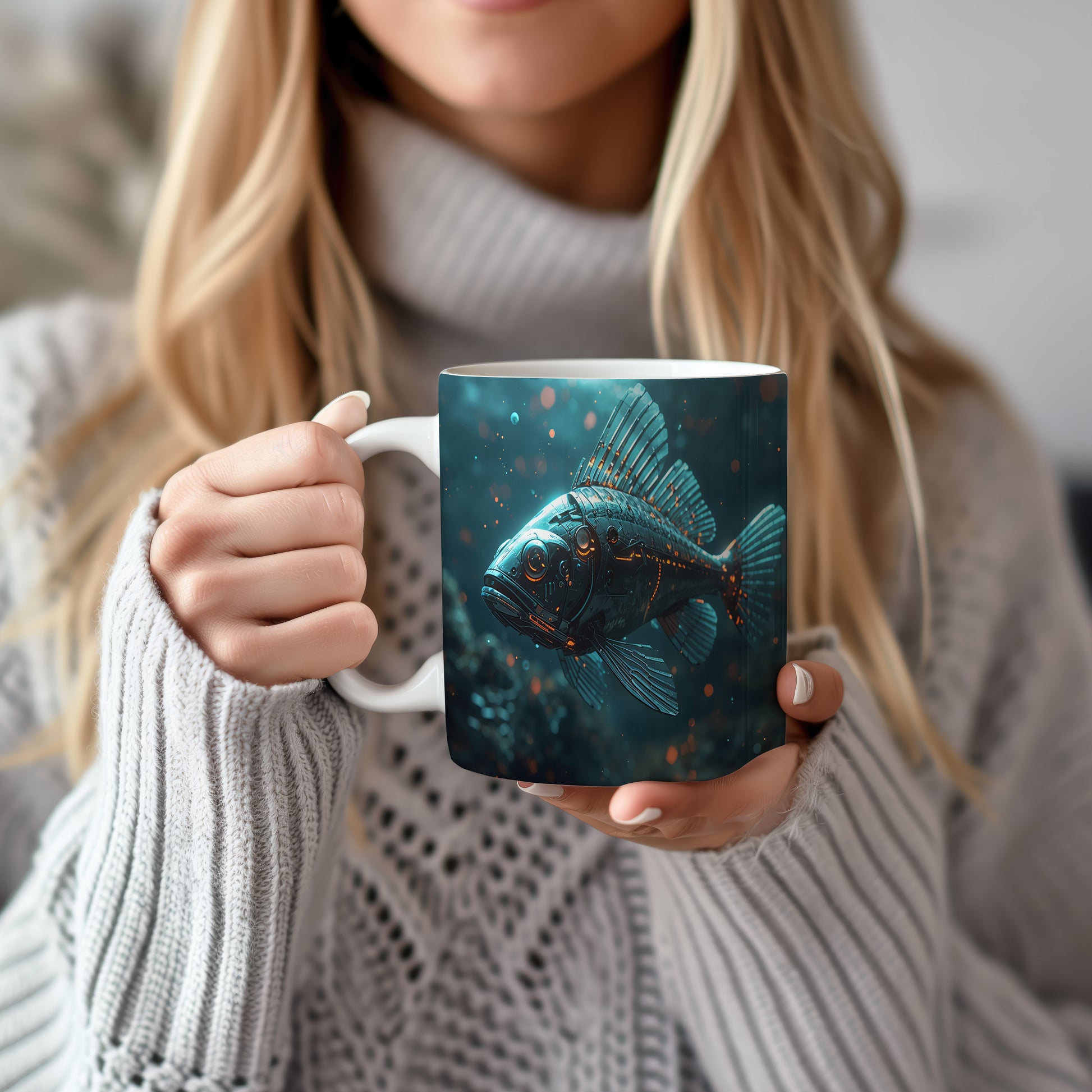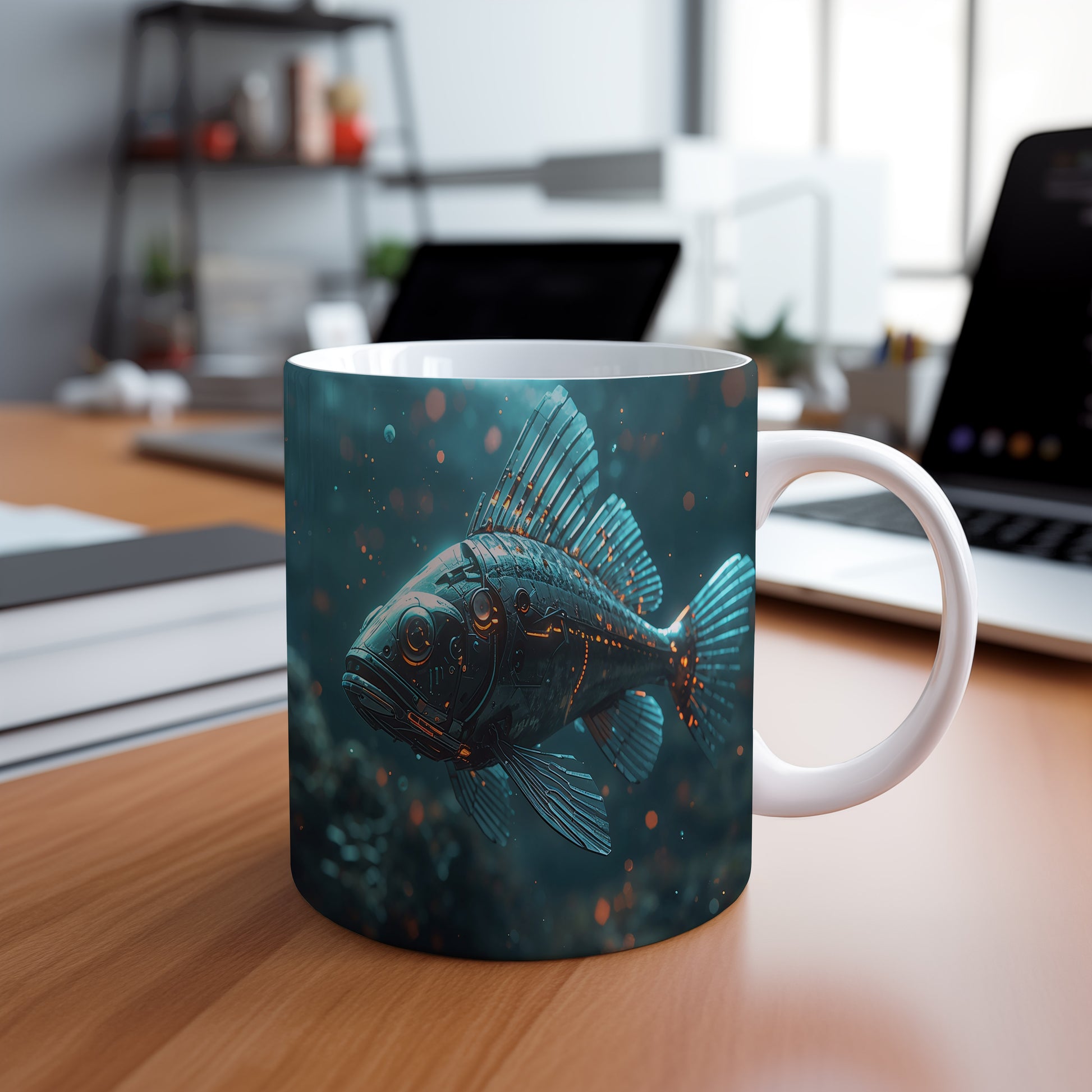 Futuristická ryba proplouvá temnými hlubinami, její kovové ploutve odrážejí zářící modré světlo. Elektrizující atmosféra vytváří dojem tajemného podmořského světa. Hrnek 330ml – vhodný do myčky i mikrovlnky.