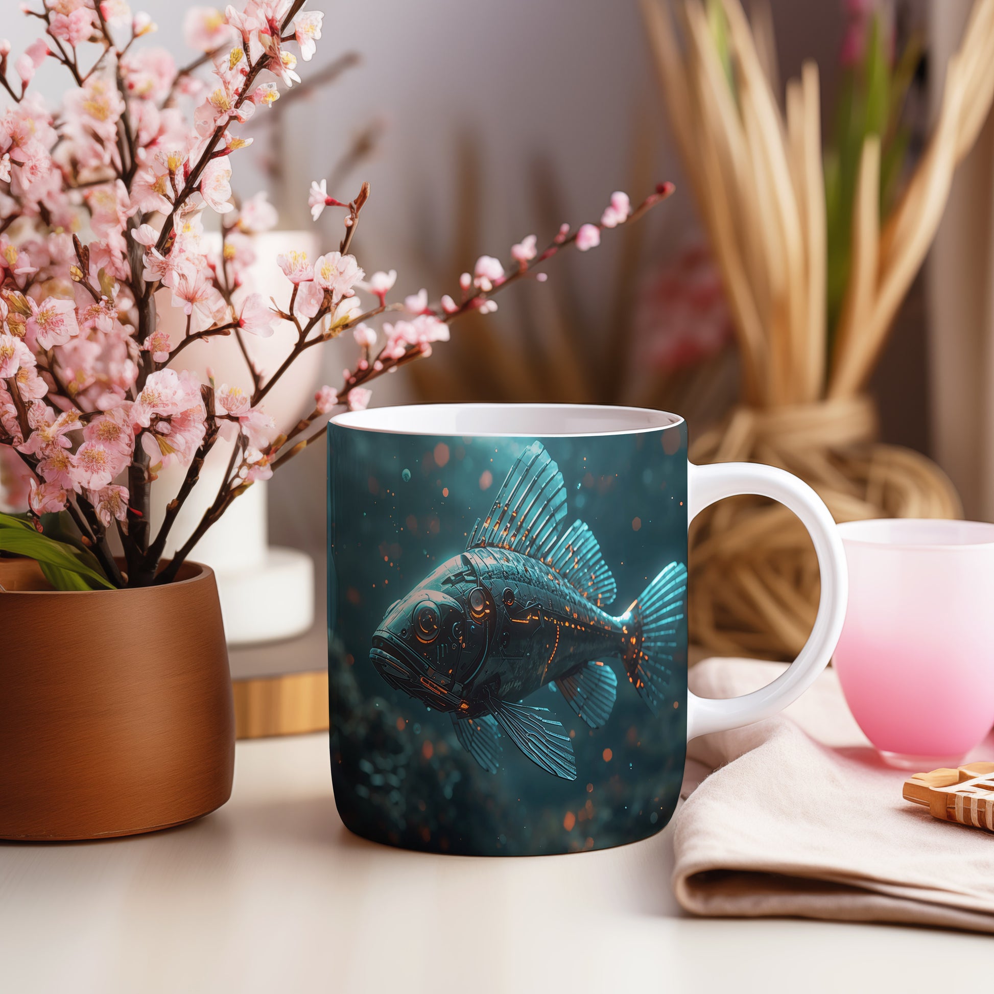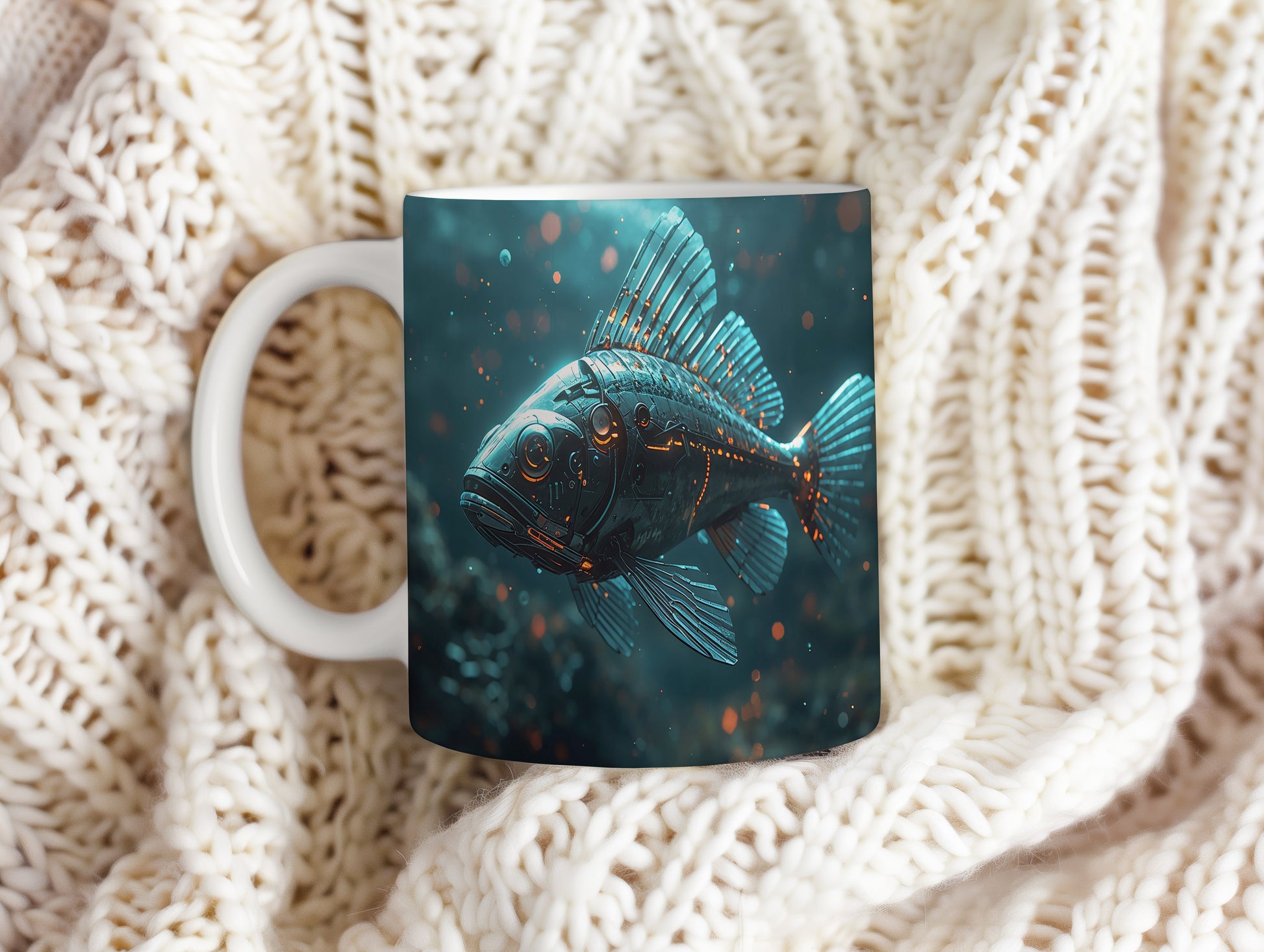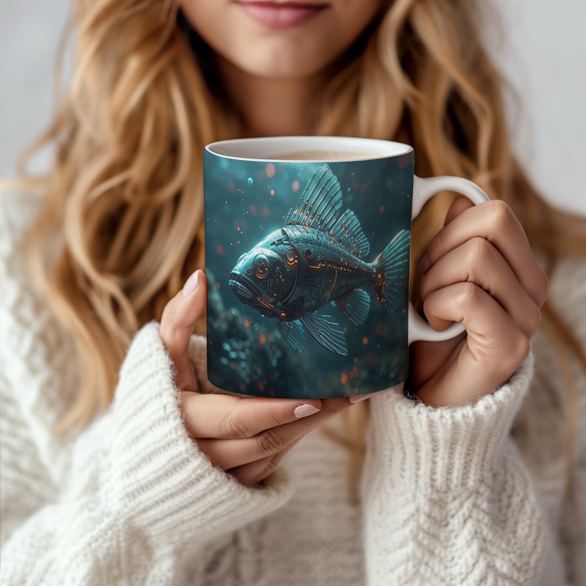 Futuristická ryba proplouvá temnými hlubinami, její kovové ploutve odrážejí zářící modré světlo. Elektrizující atmosféra vytváří dojem tajemného podmořského světa. Hrnek 330ml – vhodný do myčky i mikrovlnky.