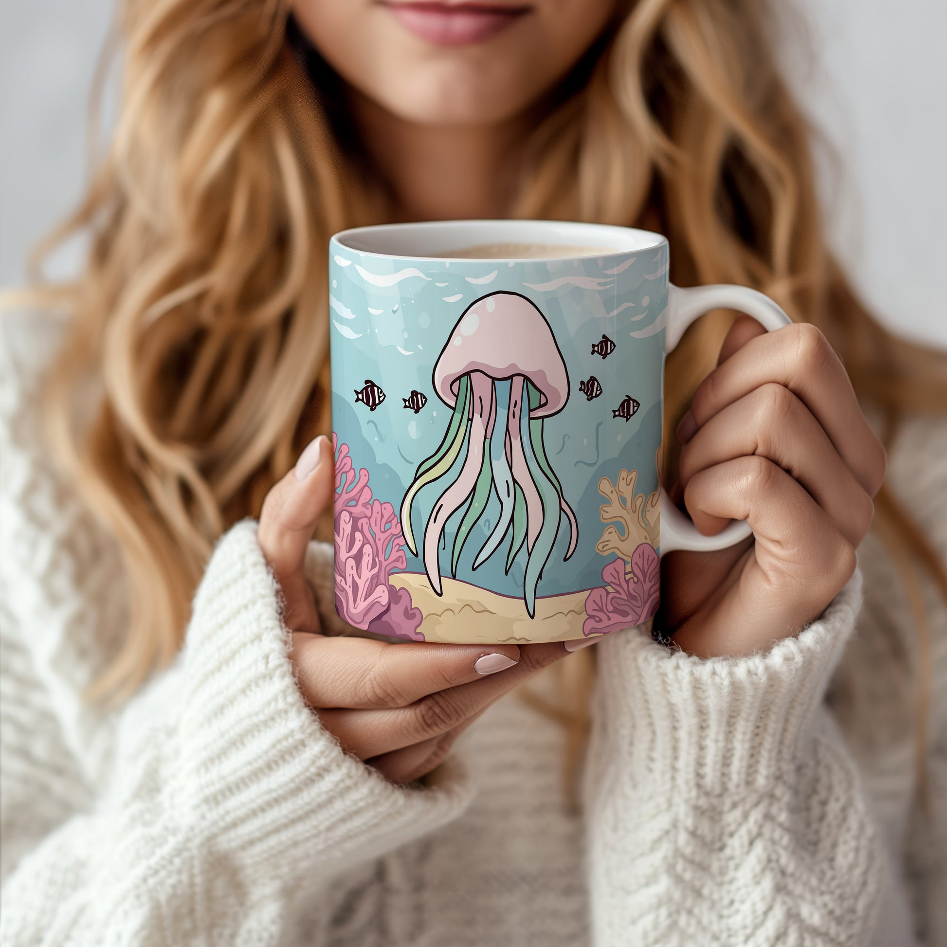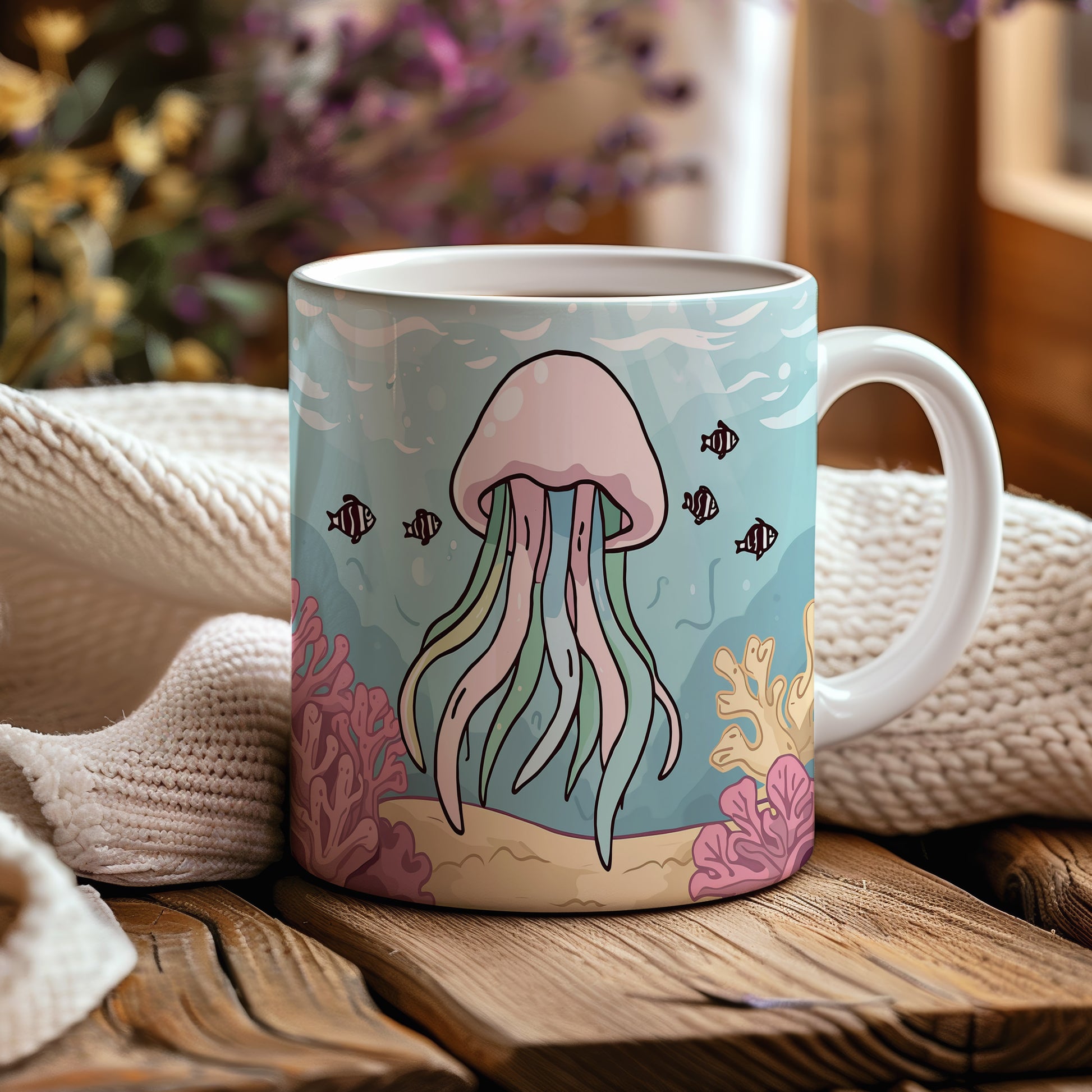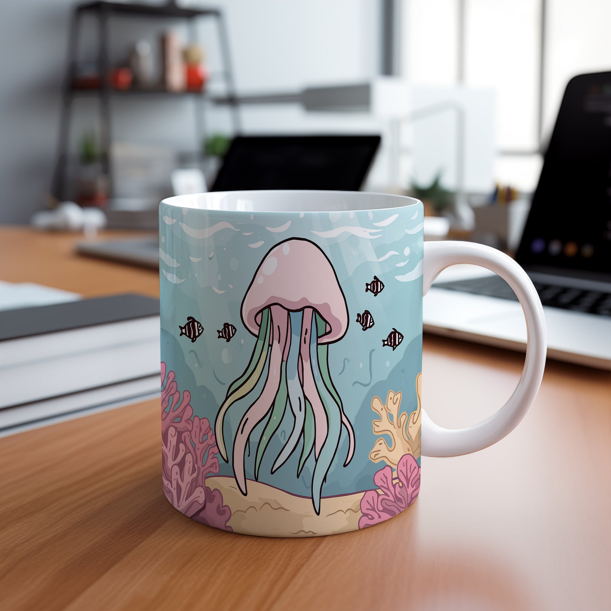 Kreslená medúza tančí v pastelových barvách oceánu, obklopena jemnými korály. Okouzlující pohled do světa pod hladinou, plný klidu a harmonie. Hrnek 330ml – vhodný do myčky i mikrovlnky.