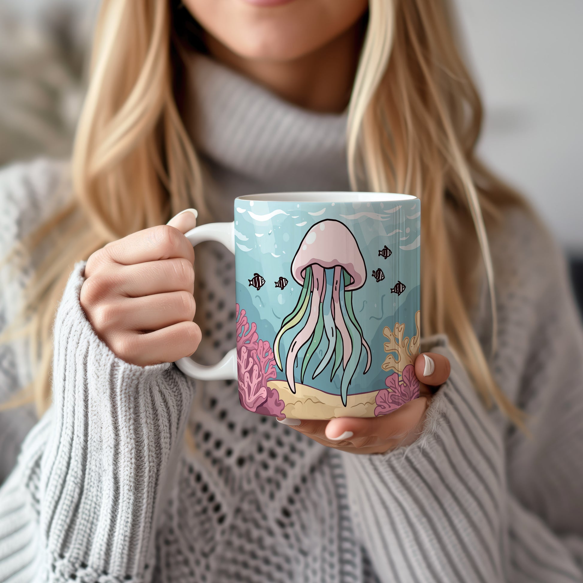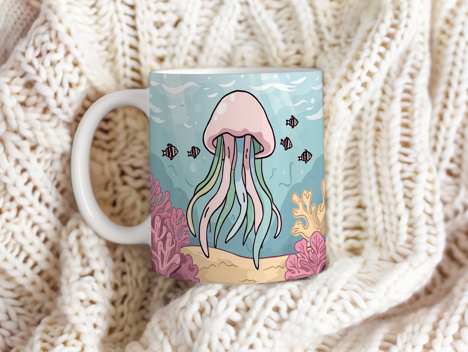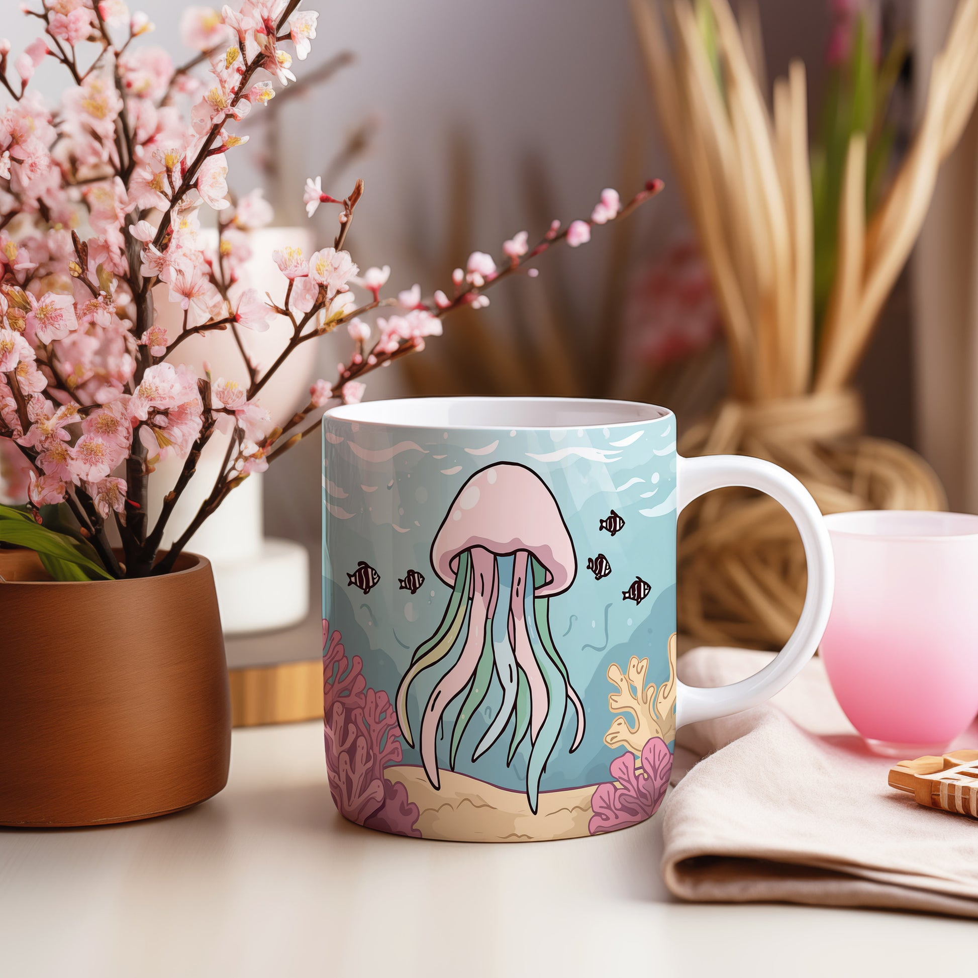 Kreslená medúza tančí v pastelových barvách oceánu, obklopena jemnými korály. Okouzlující pohled do světa pod hladinou, plný klidu a harmonie. Hrnek 330ml – vhodný do myčky i mikrovlnky.