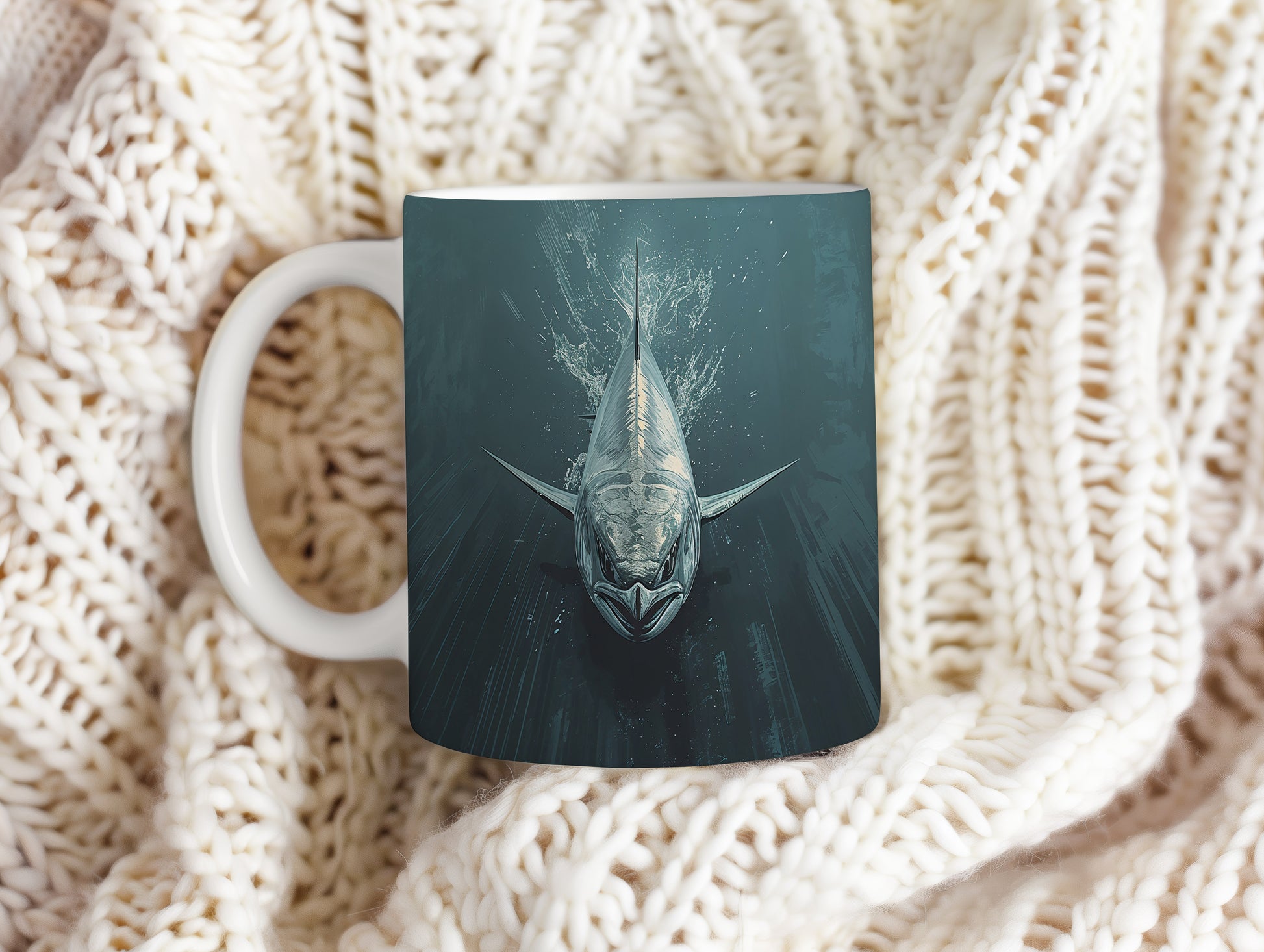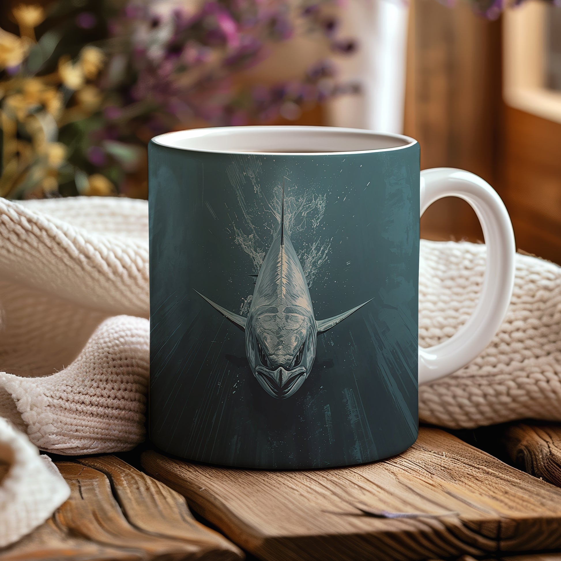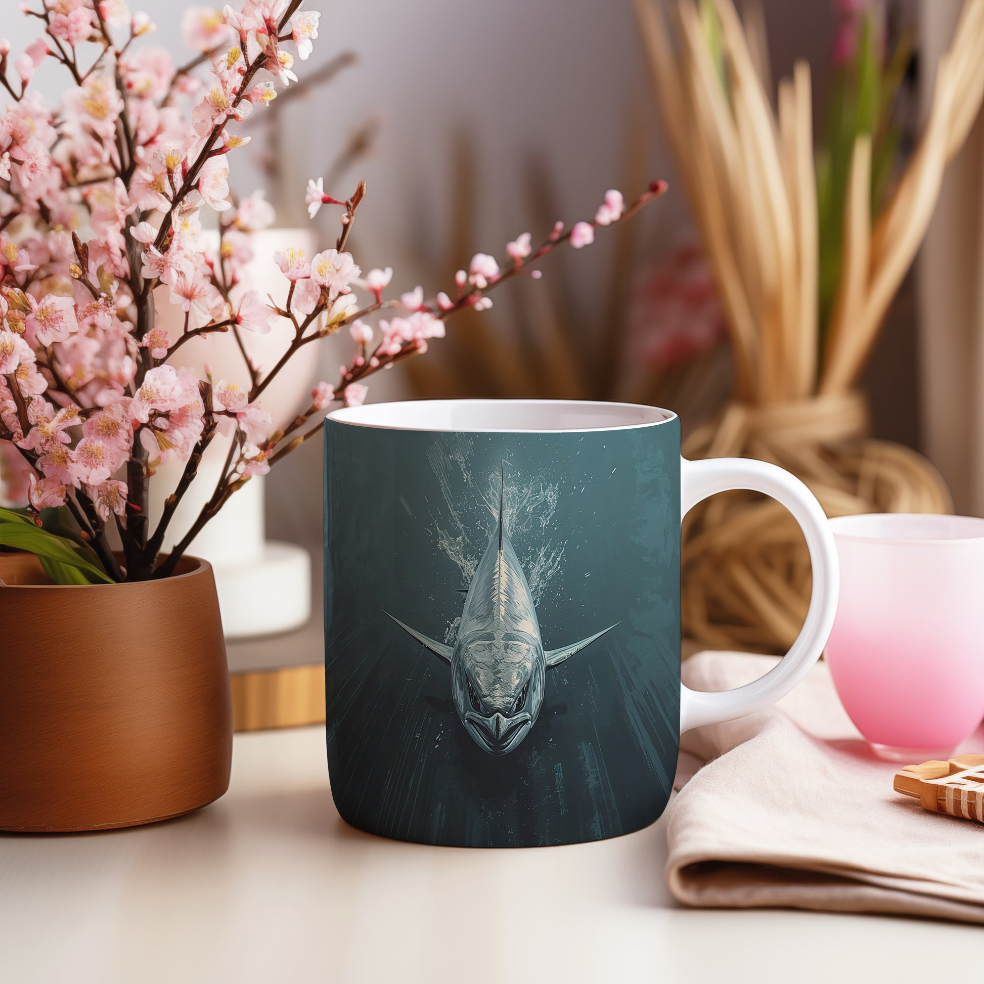 Tento hrnek zachycuje žraloka v plné síle, jak se řítí skrze temné vody oceánu. Stříbrné odlesky na jeho těle kontrastují s hlubokou modří moře. Hrnek 330ml – vhodný do myčky i mikrovlnky.