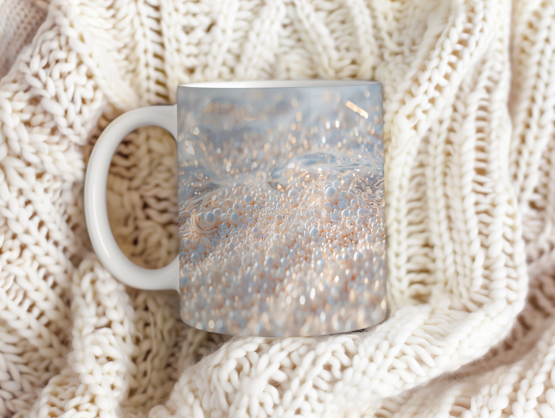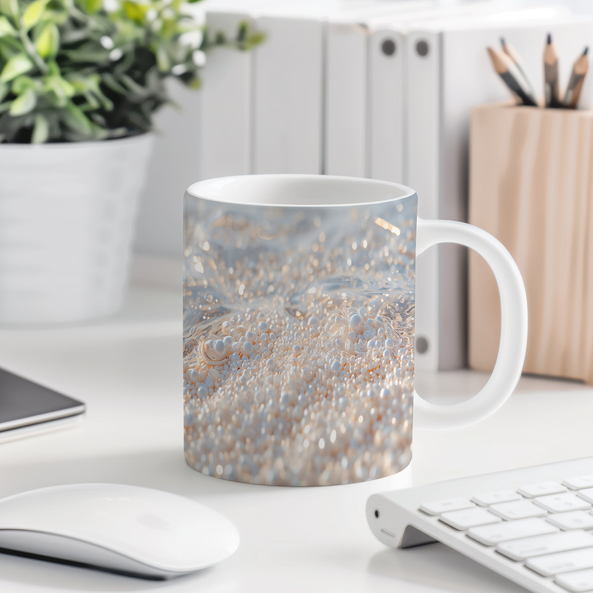 Zářivé perly tančí na hladině oceánu, odrážejí jemné světlo slunce. Tento hrnek vás přenese do světa klidu a elegance. Hrnek 330ml – vhodný do myčky i mikrovlnky.