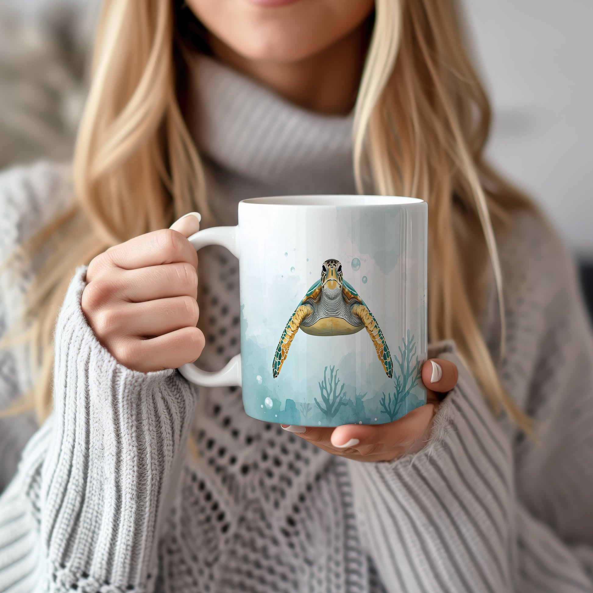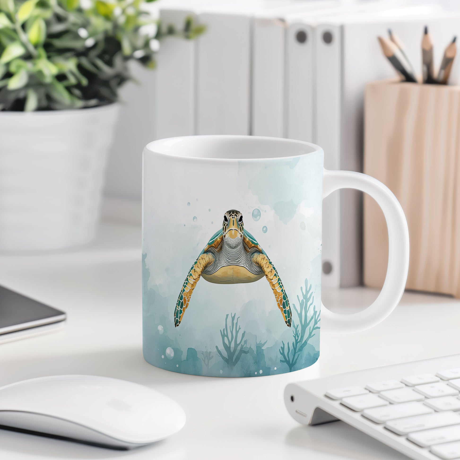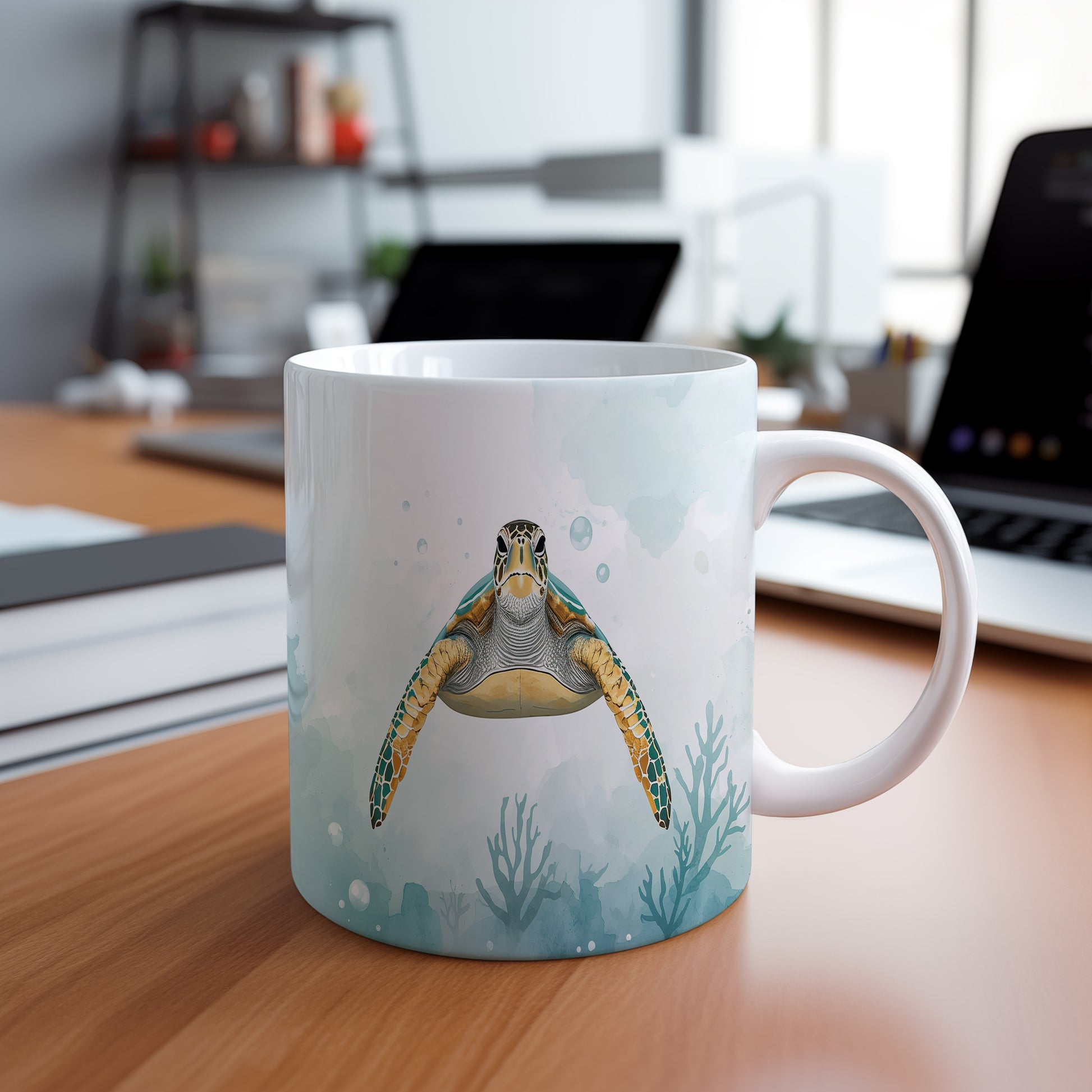 Na hladině klidného oceánu pluje majestátní želva, obklopena jemným akvarelovým pozadím. Světle modré tóny evokují pocit hlubokého klidu. Hrnek 330ml – vhodný do myčky i mikrovlnky.