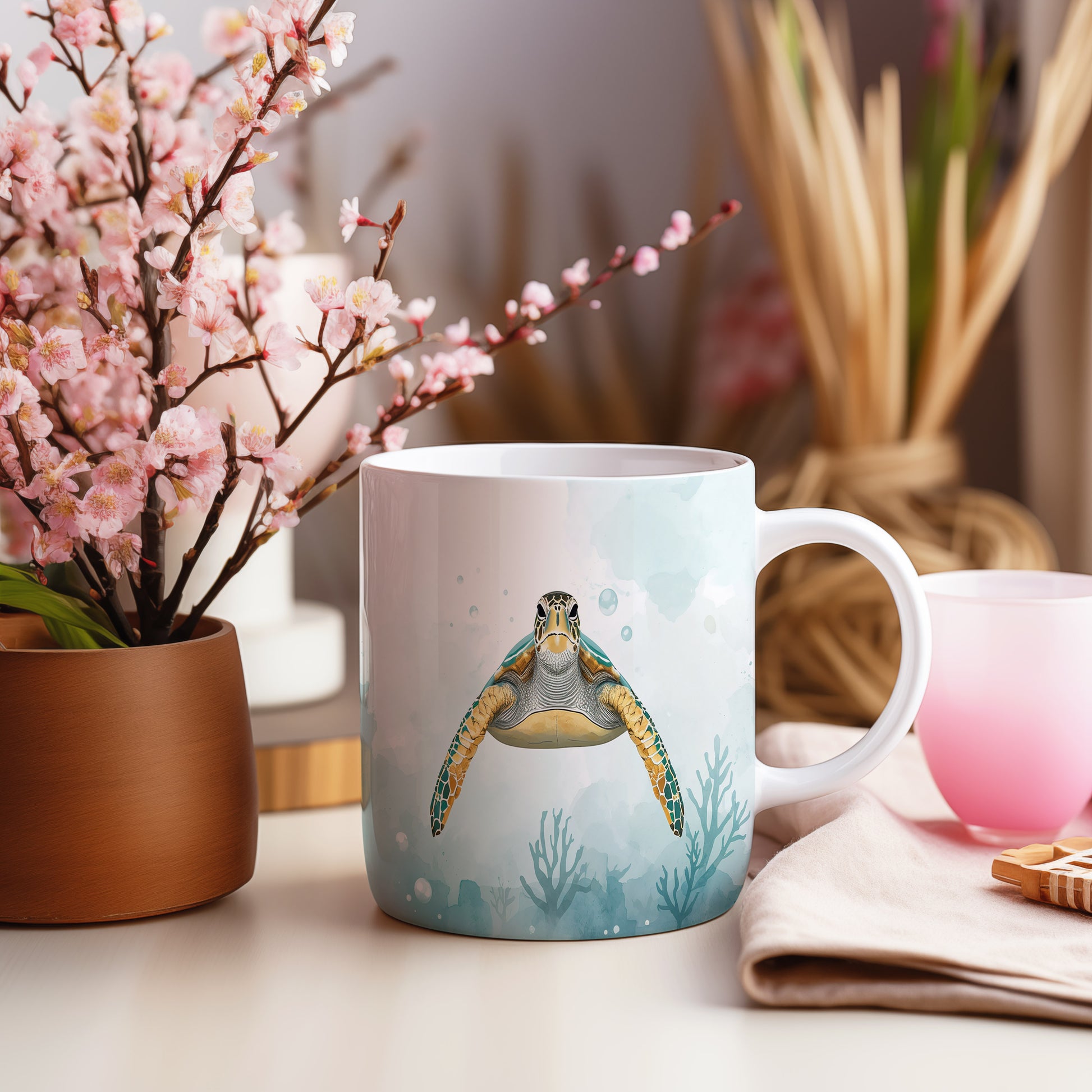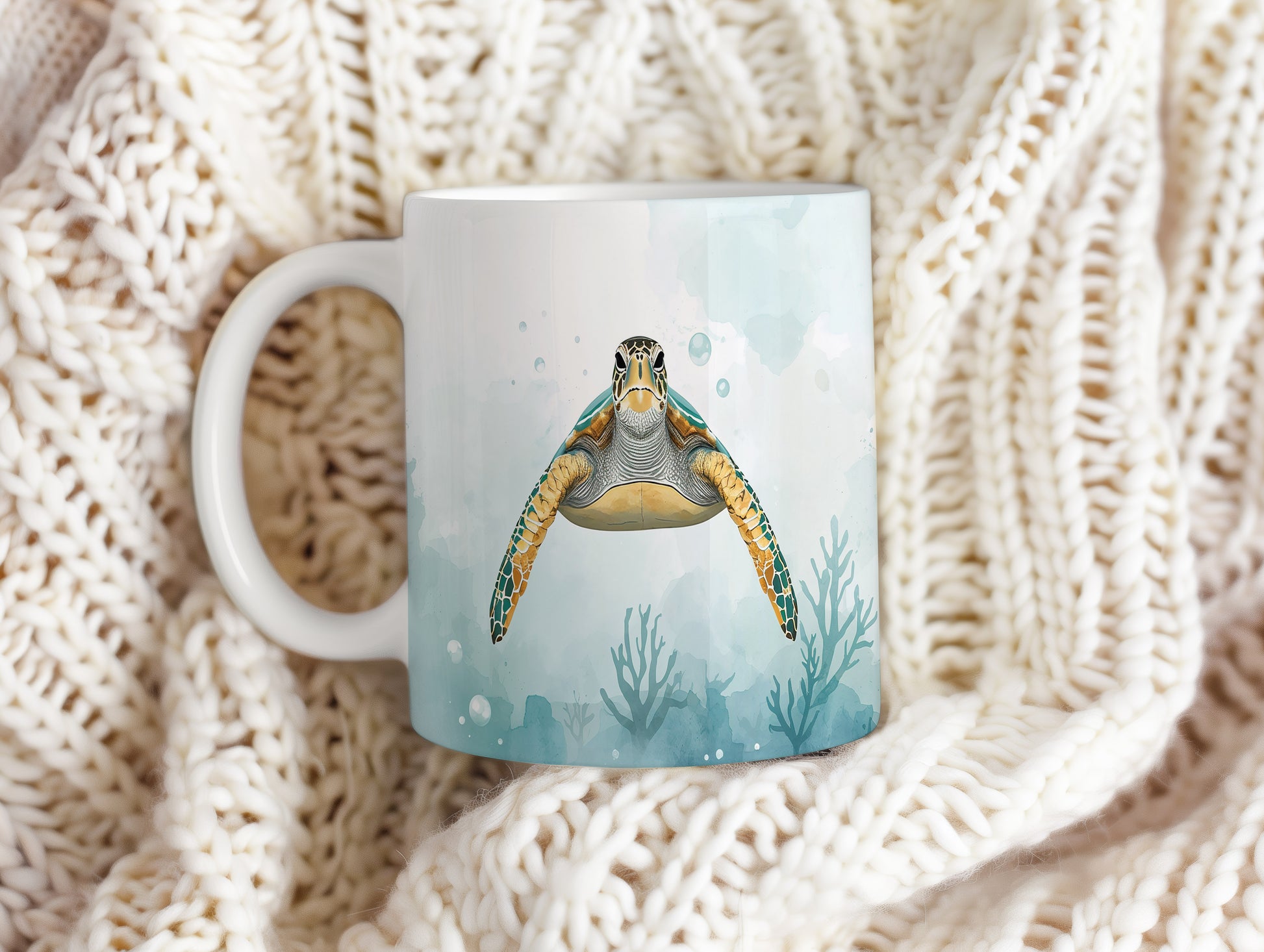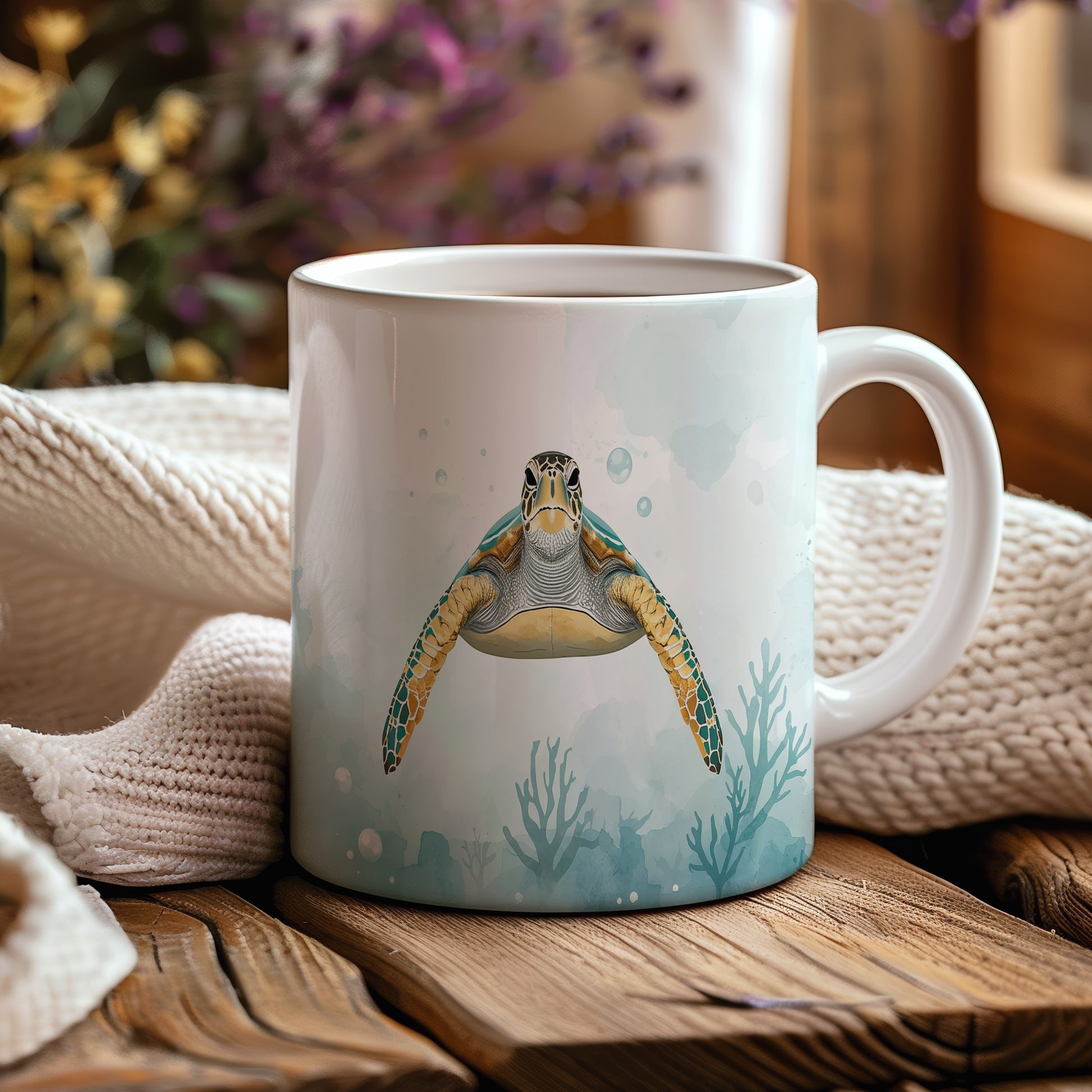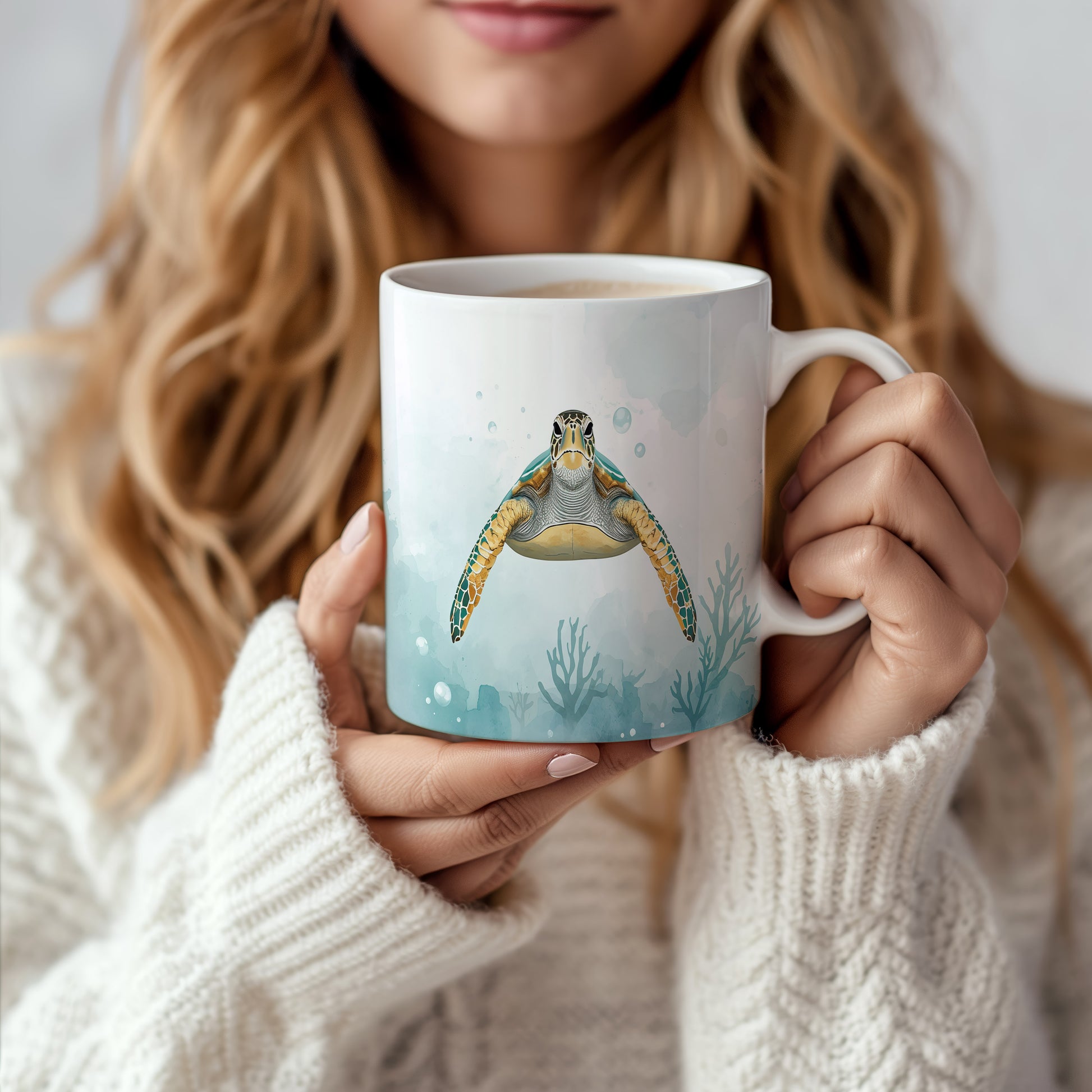 Na hladině klidného oceánu pluje majestátní želva, obklopena jemným akvarelovým pozadím. Světle modré tóny evokují pocit hlubokého klidu. Hrnek 330ml – vhodný do myčky i mikrovlnky.