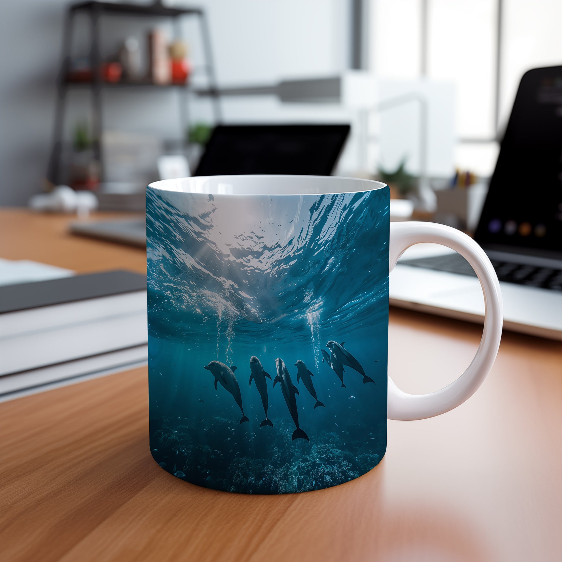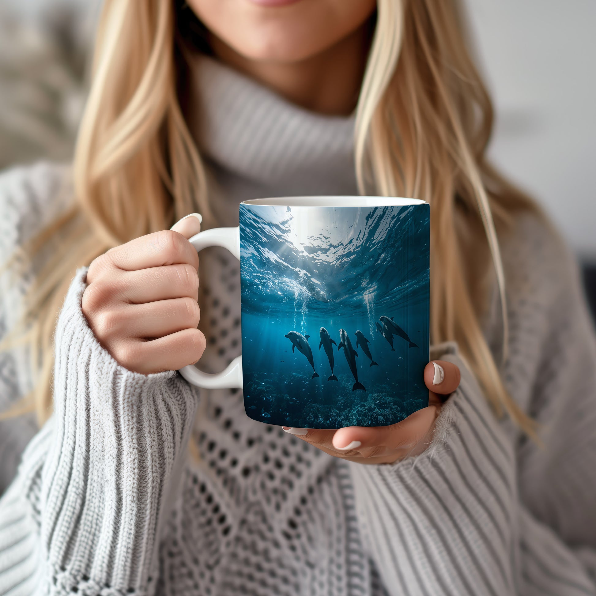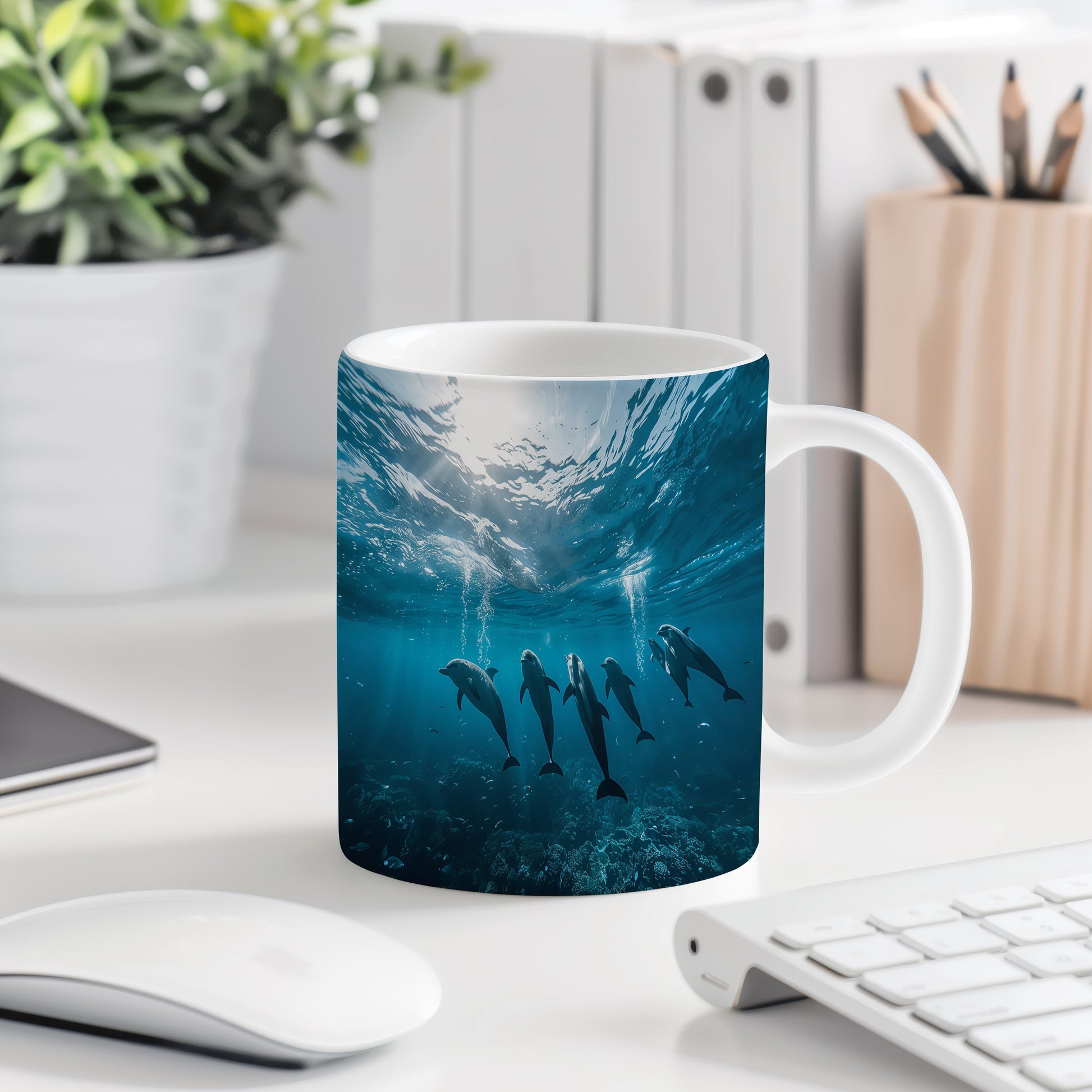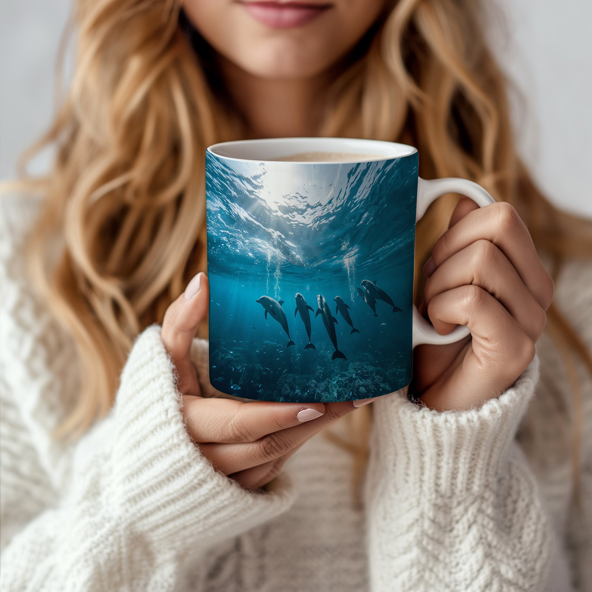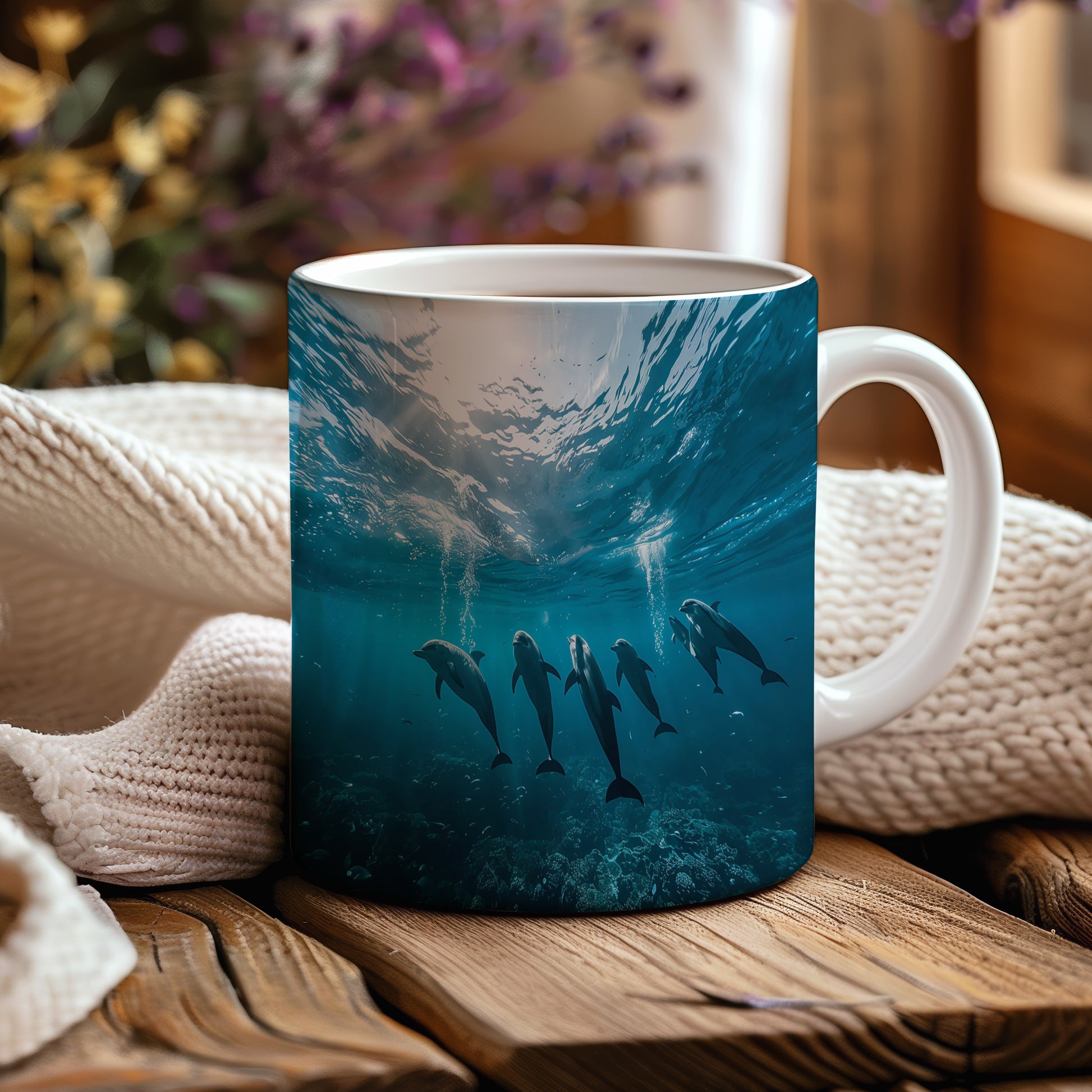 Delfíni se vznášejí pod hladinou, kde se střetává světlo se stíny. Modř oceánu je jako nekonečná malba klidu. Hrnek 330ml – vhodný do myčky i mikrovlnky.