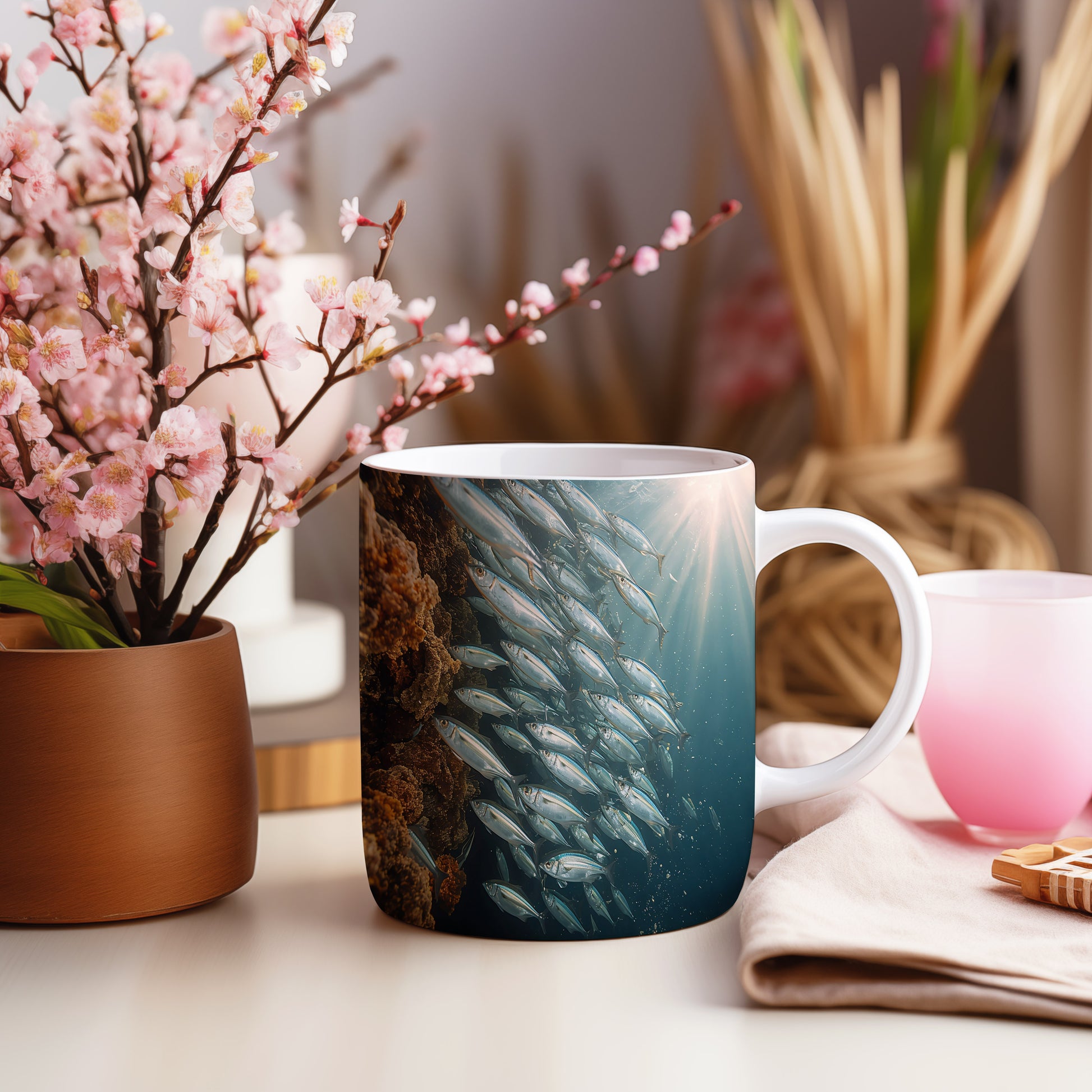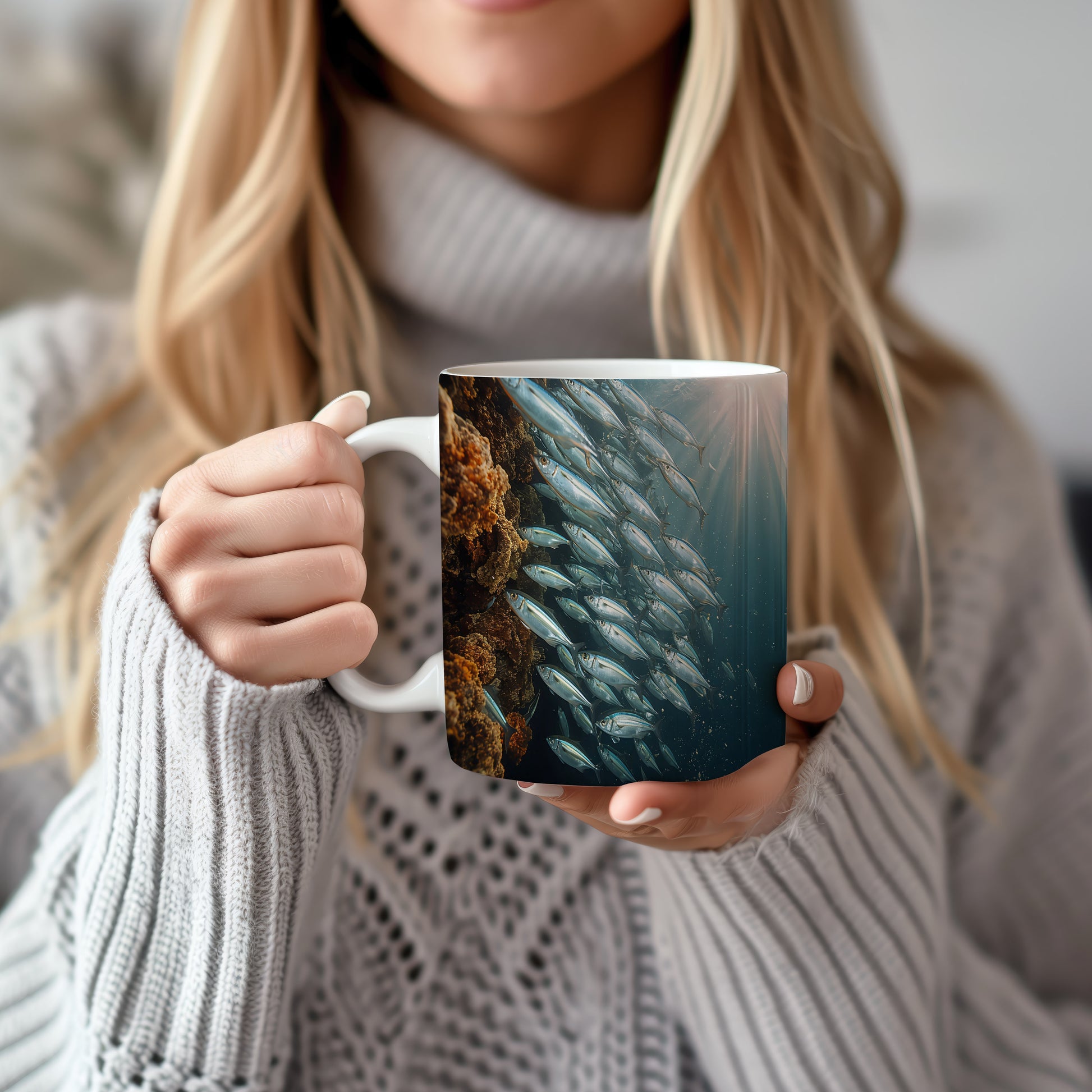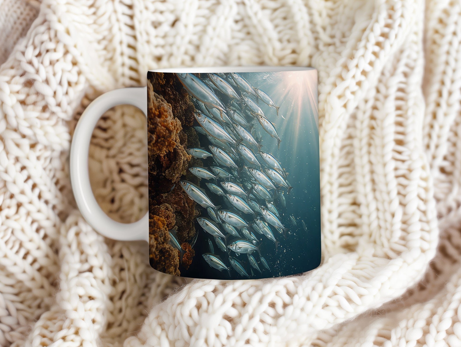 Objevte krásu podmořského světa s hejnem ryb tančícím v záři slunce. Hrnek 330ml – vhodný do myčky i mikrovlnky.