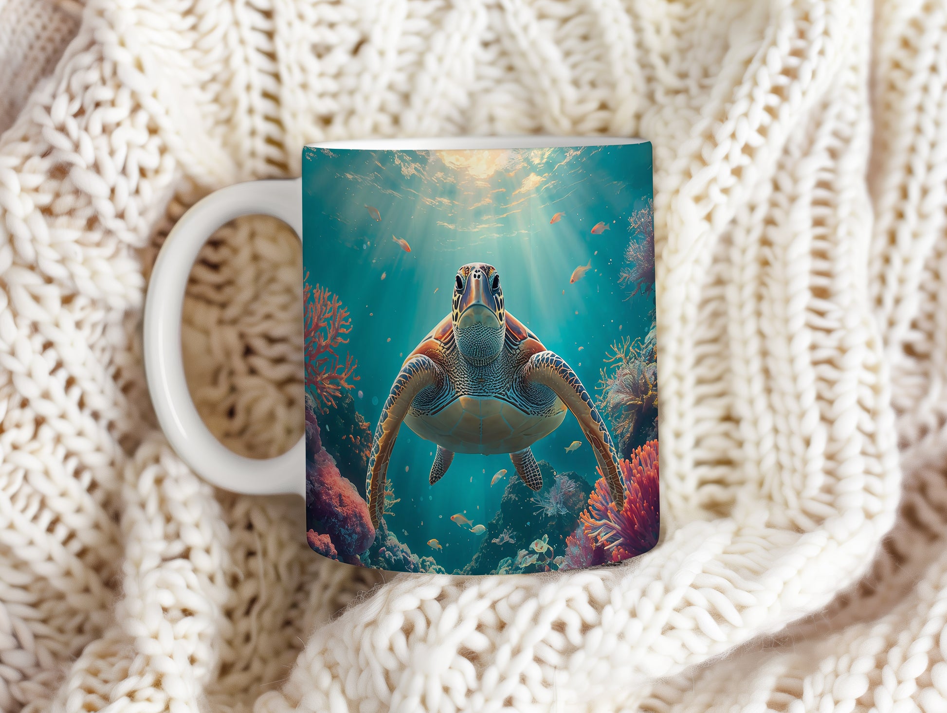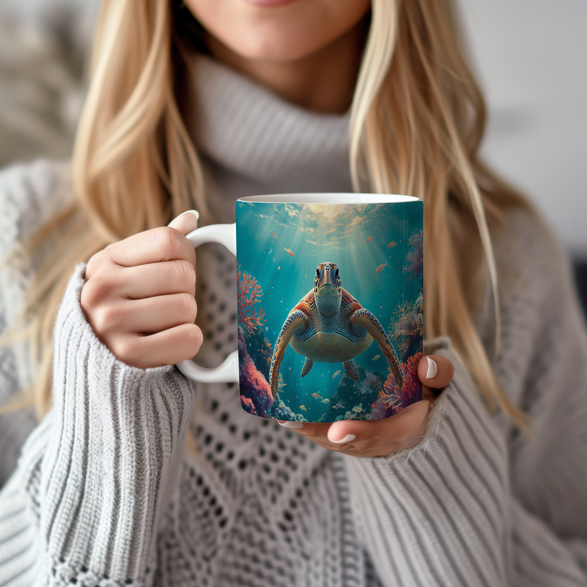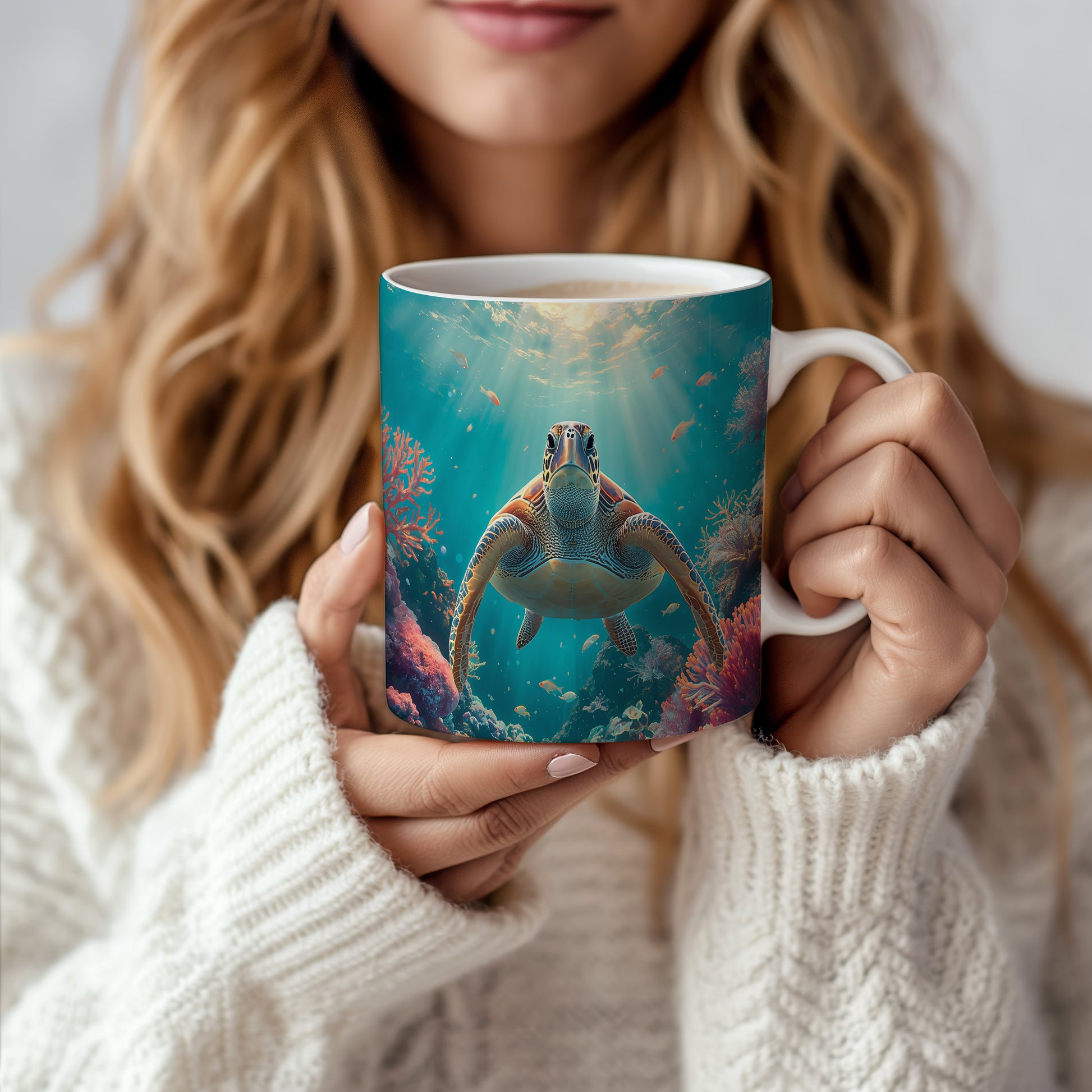 Pod hladinou oceánu, kde paprsky slunce tančí na vlnách, pluje majestátní želva mezi pestrobarevnými korály. Modrozelená záře vody vytváří uklidňující atmosféru. Hrnek 330ml – vhodný do myčky i mikrovlnky.