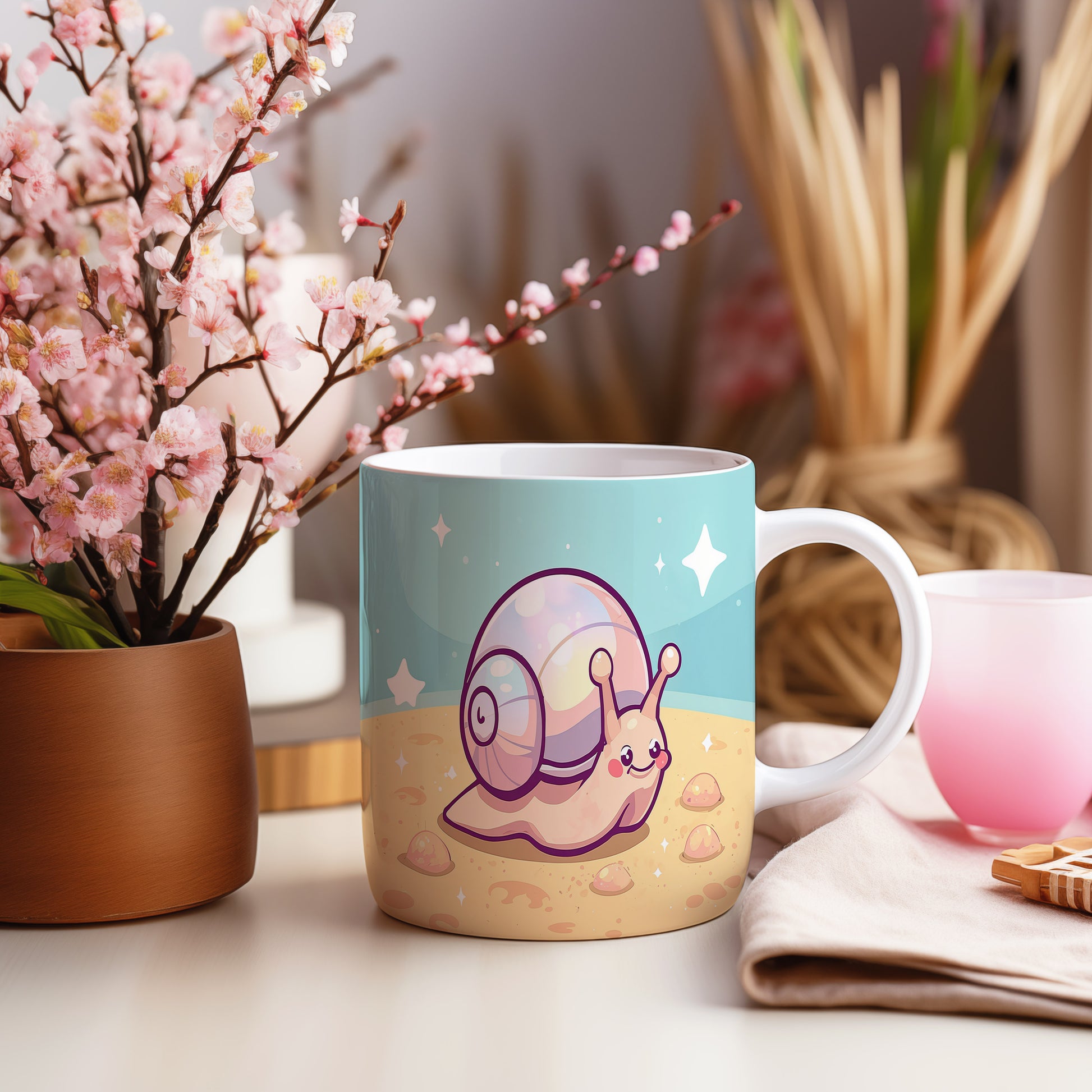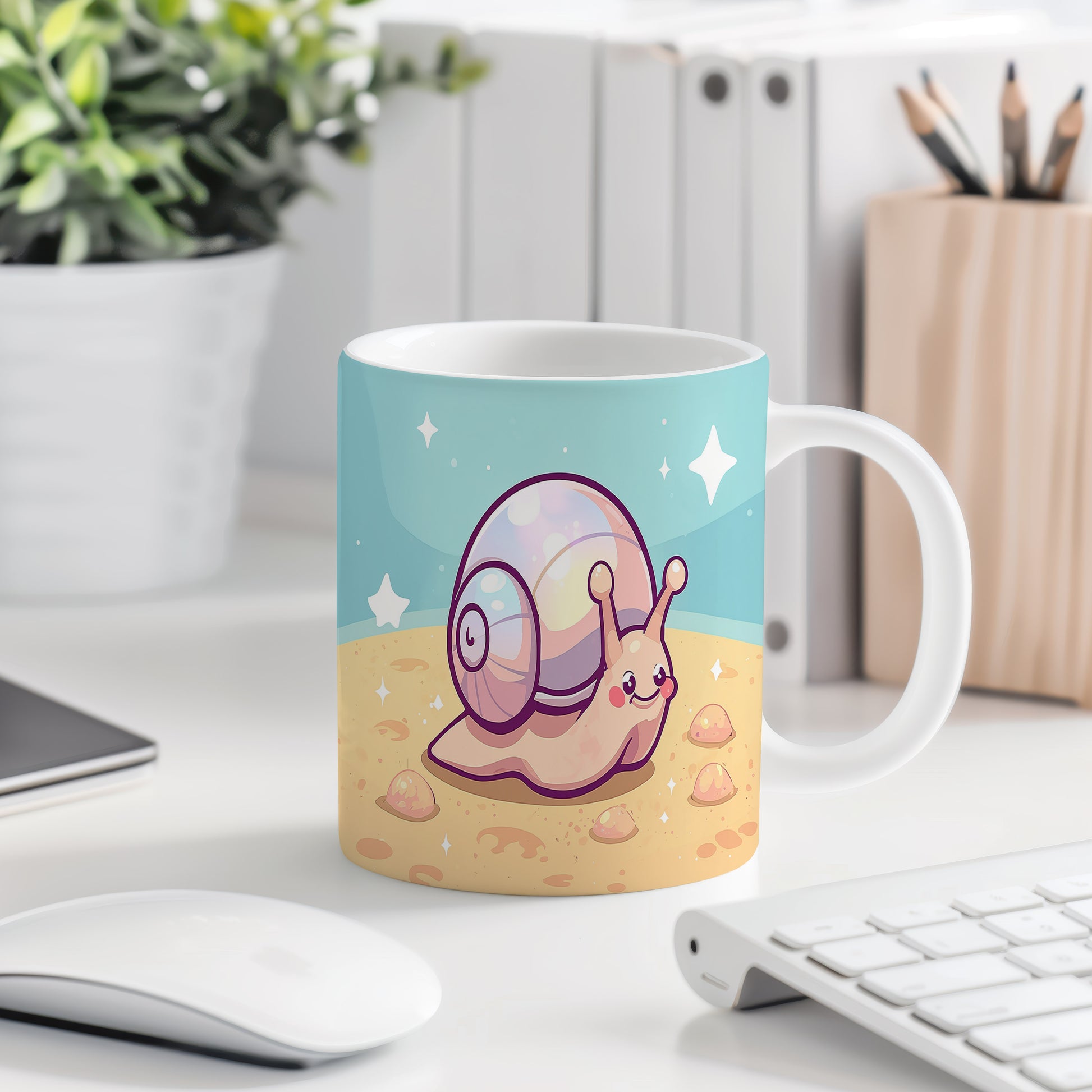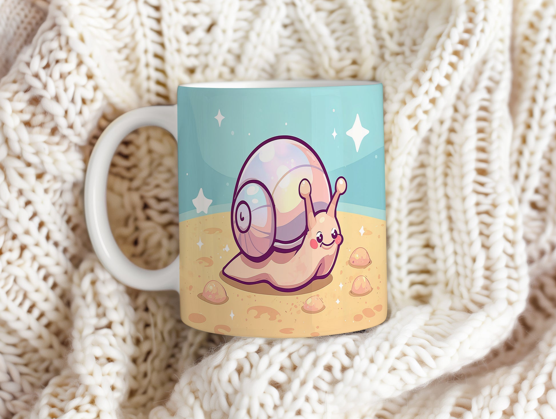 Na hrnku se rozprostírá roztomilý plž s duhovou ulitou, jak se klidně prochází po zlatavém písku. Jemné pastelové barvy vytvářejí hravou a radostnou atmosféru. Hrnek 330ml – vhodný do myčky i mikrovlnky.
