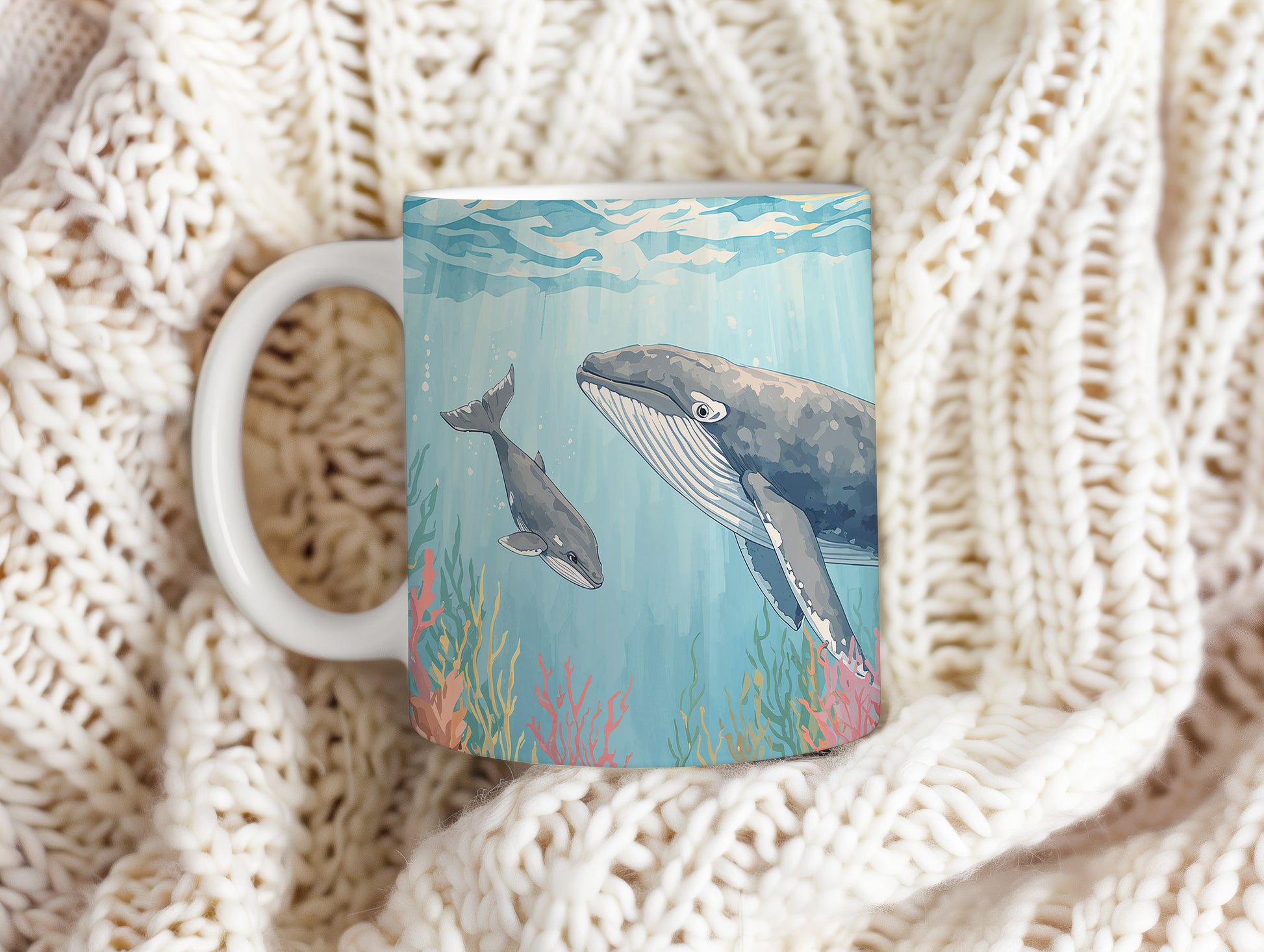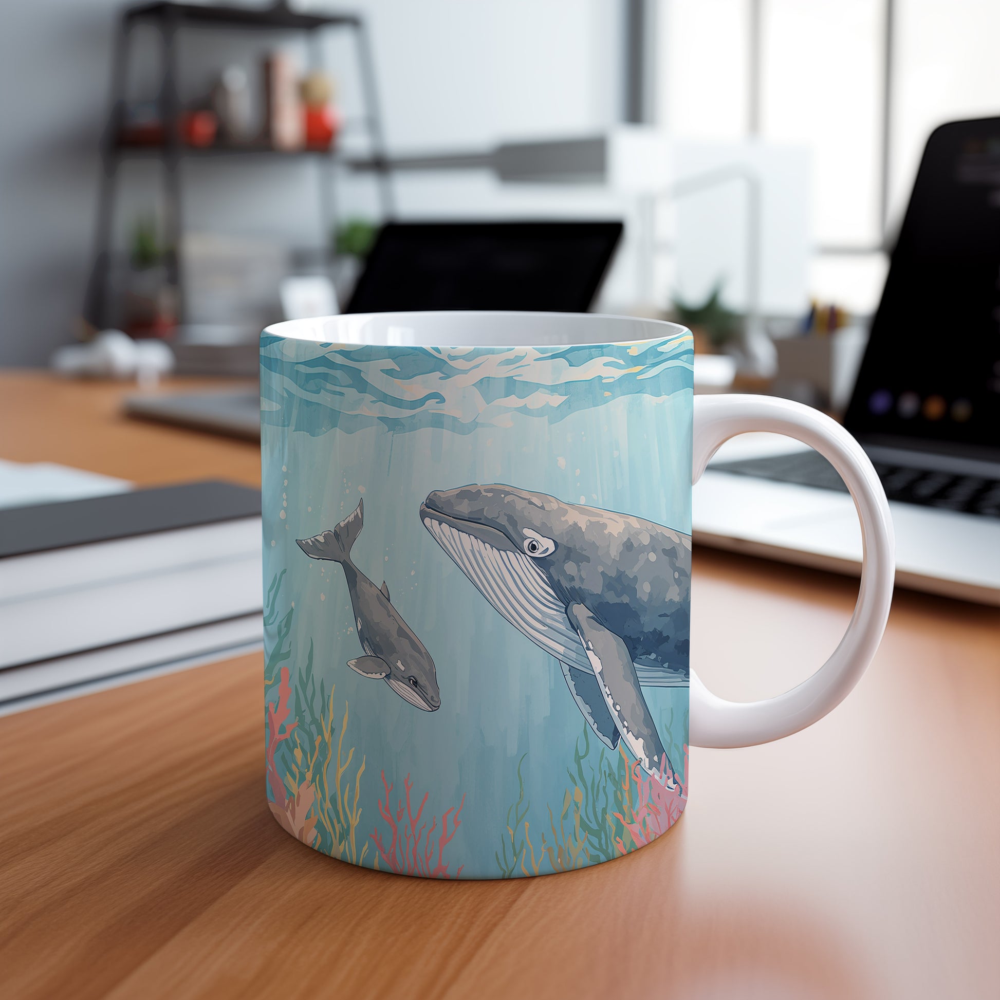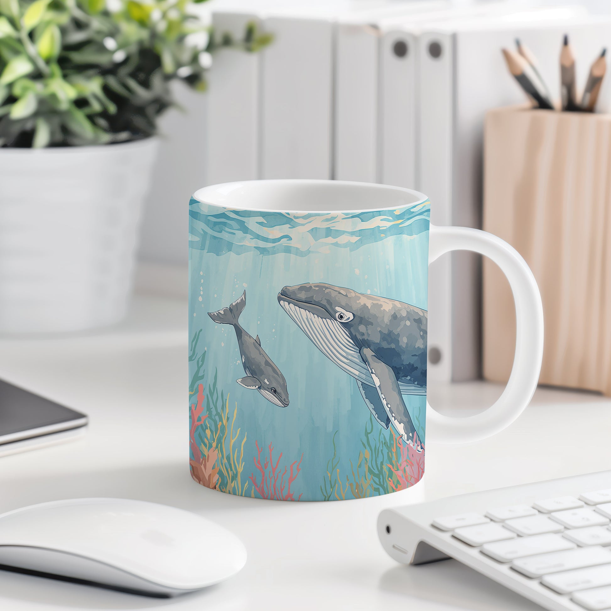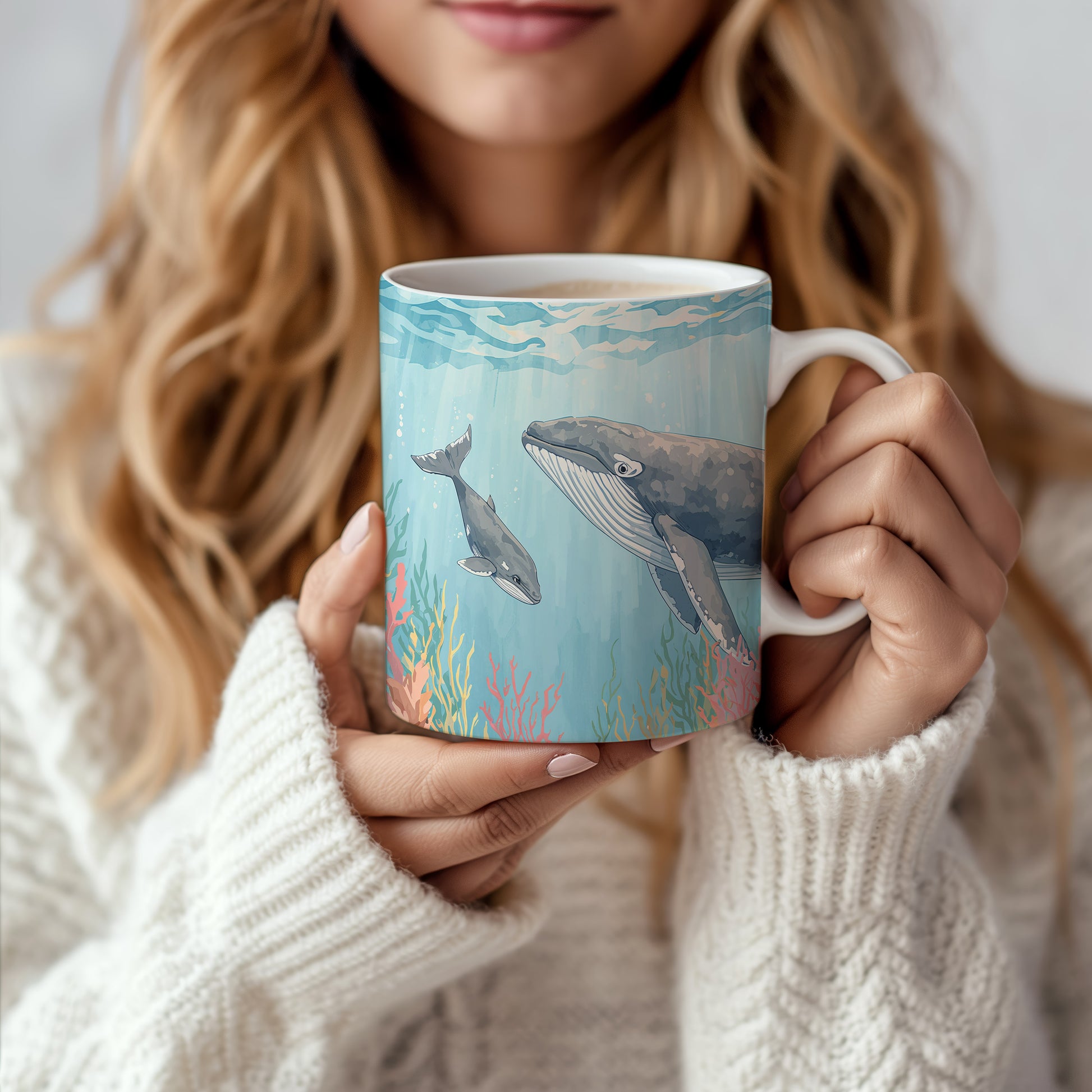 Pod hladinou oceánu se vznáší majestátní velryby obklopené pestrobarevnými korály. Světlo proniká vodou a vytváří klidnou symfonii barev. Hrnek 330ml – vhodný do myčky i mikrovlnky.