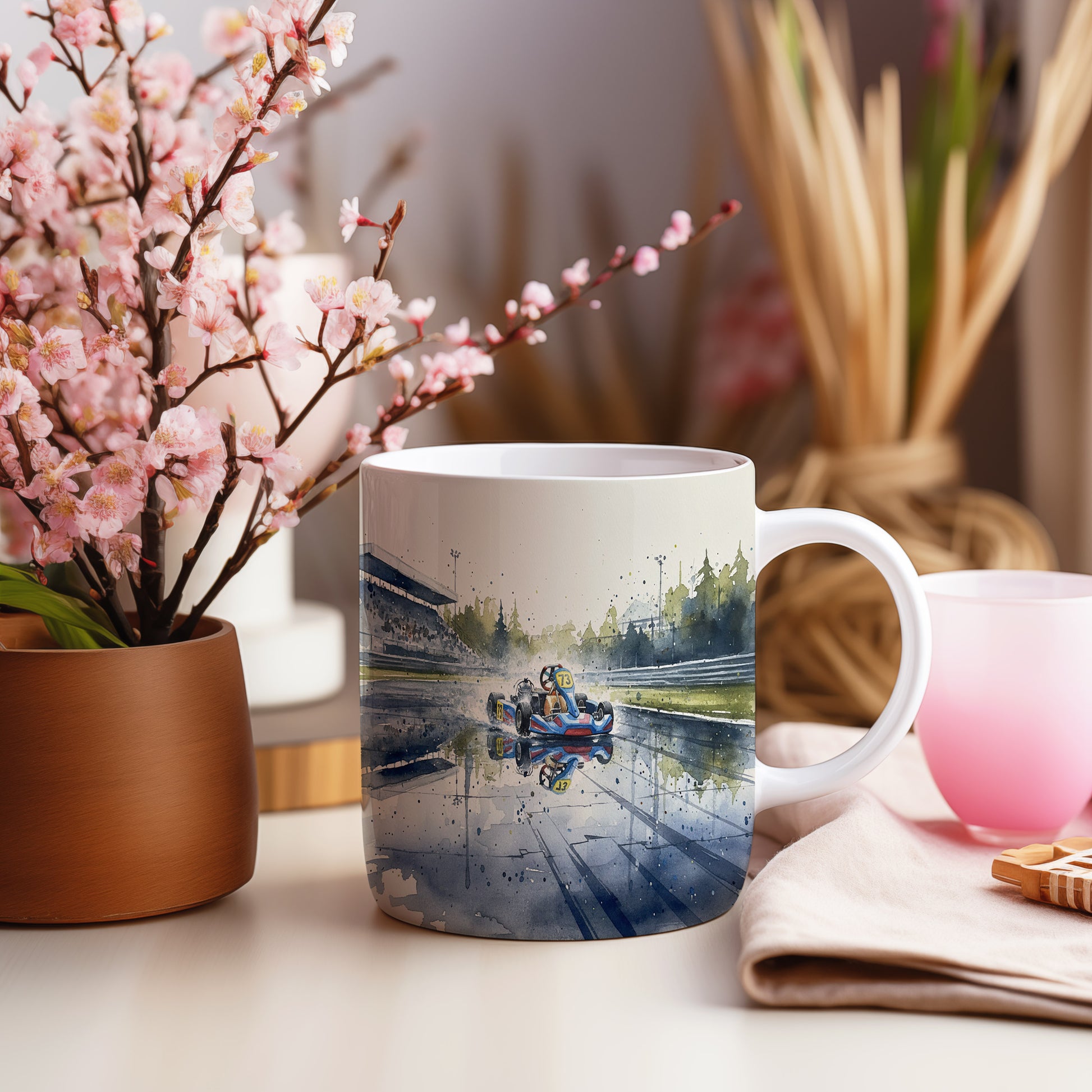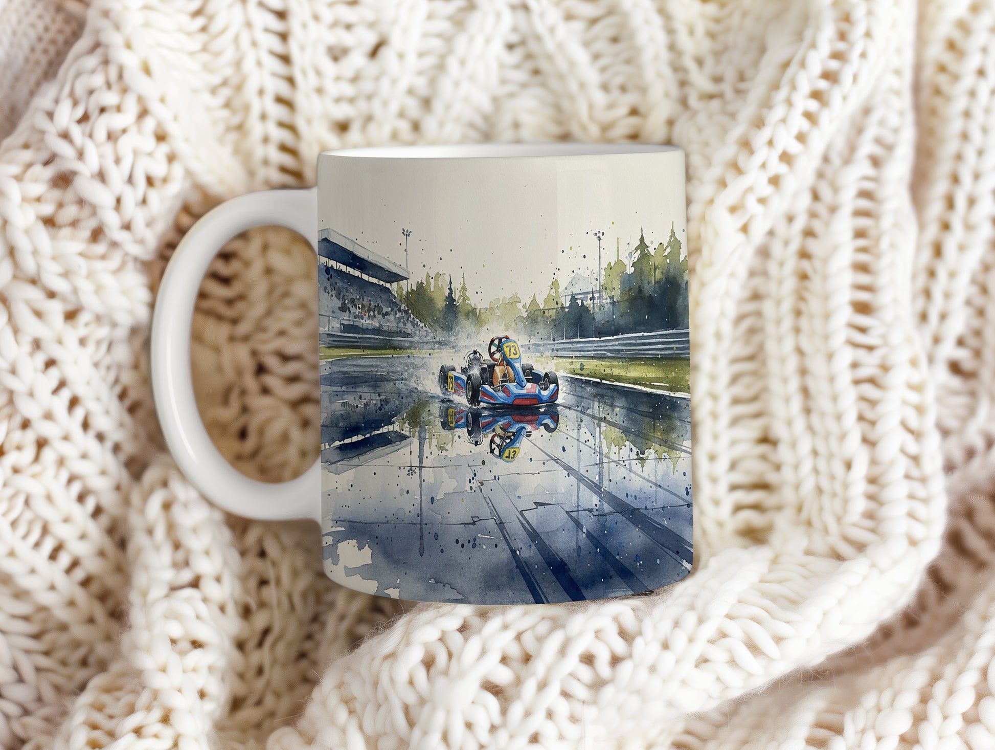 Objevte kouzlo rychlosti s hrnkem, na kterém je akvarelová motokára na mokré trati. Ideální pro milovníky adrenalinu.