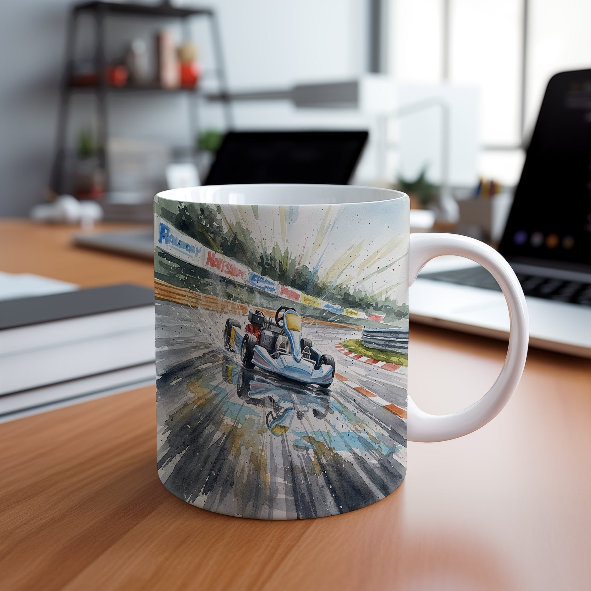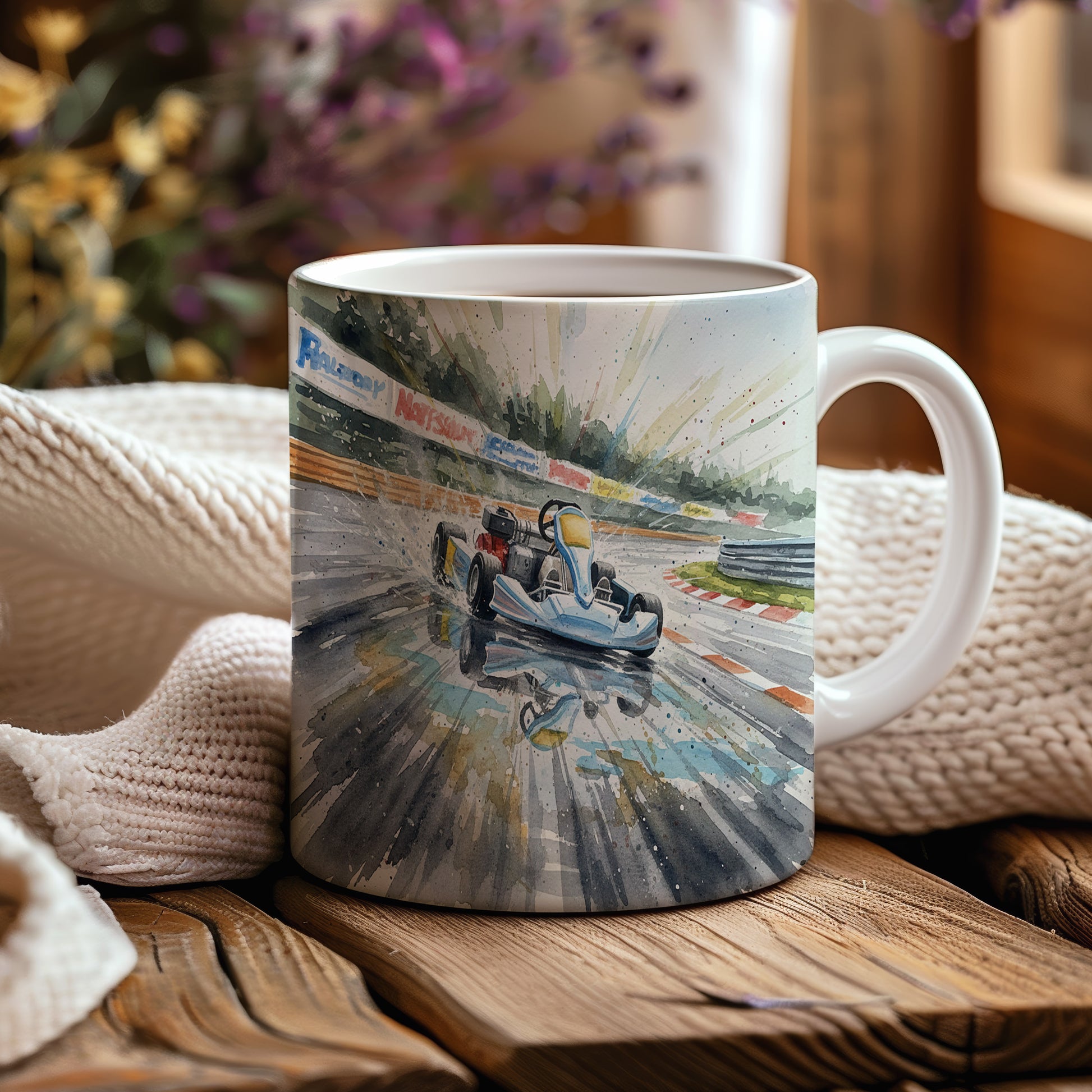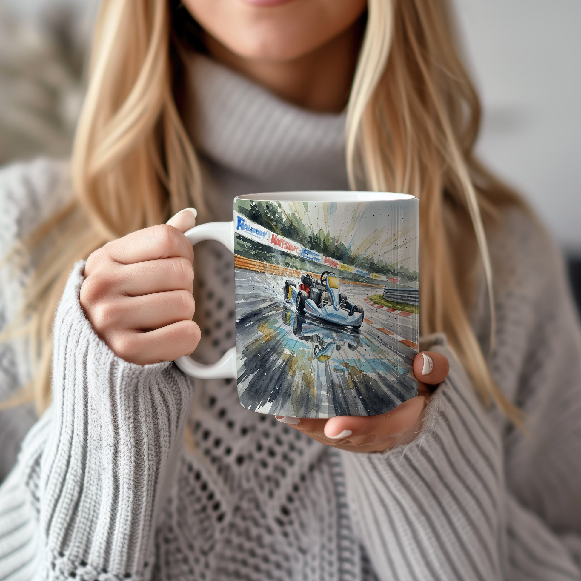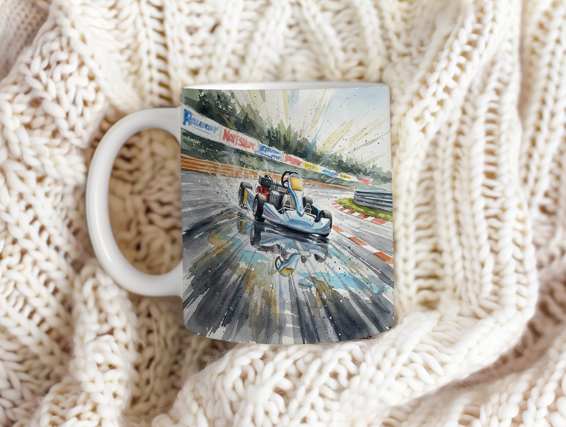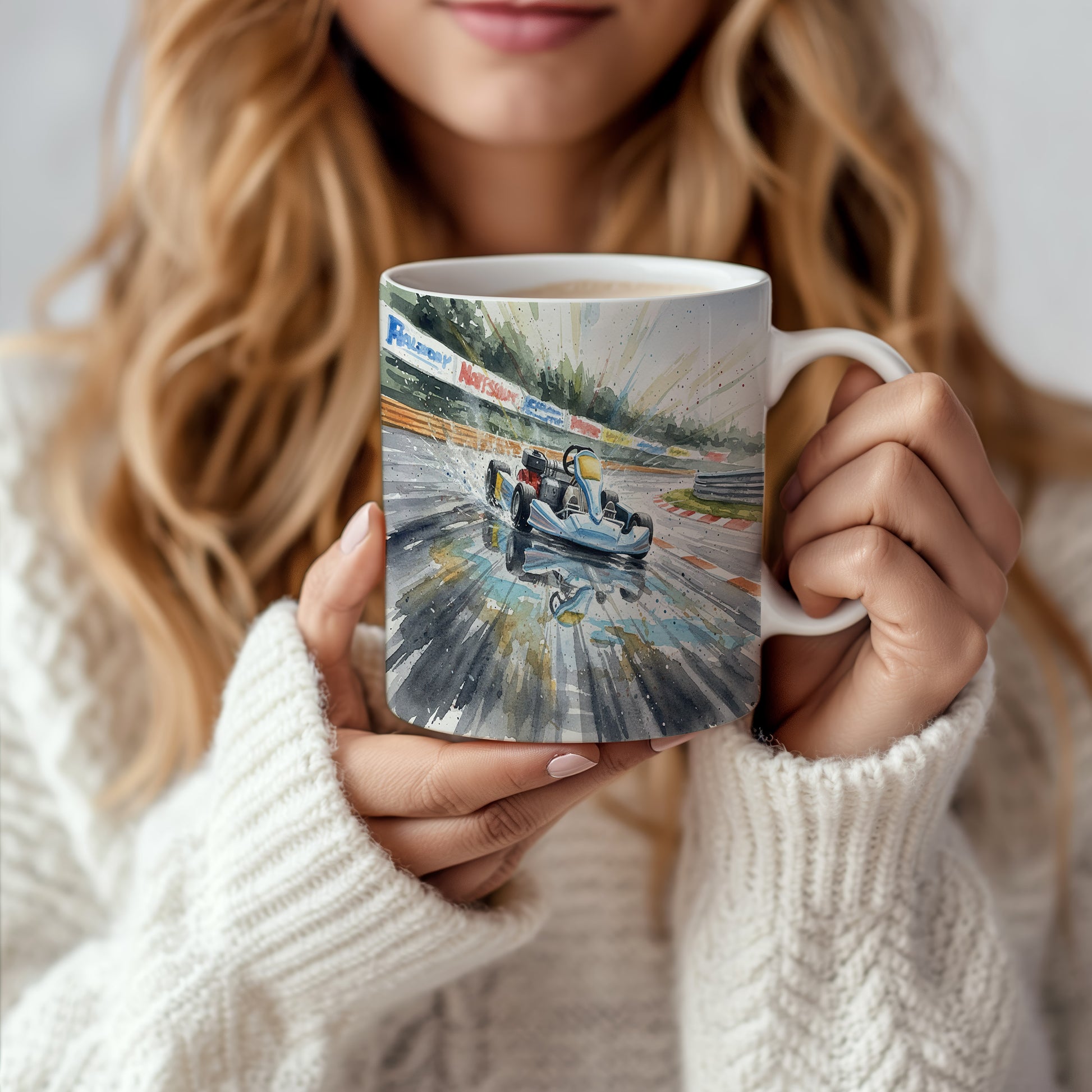 Objevte adrenalin na mokré trati s tímto akvarelovým motivem motokáry. Hrnek 330 ml – vhodný do myčky i mikrovlnky.
