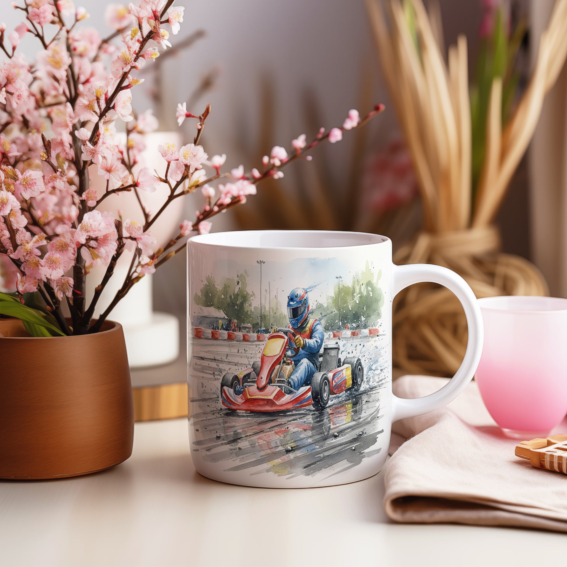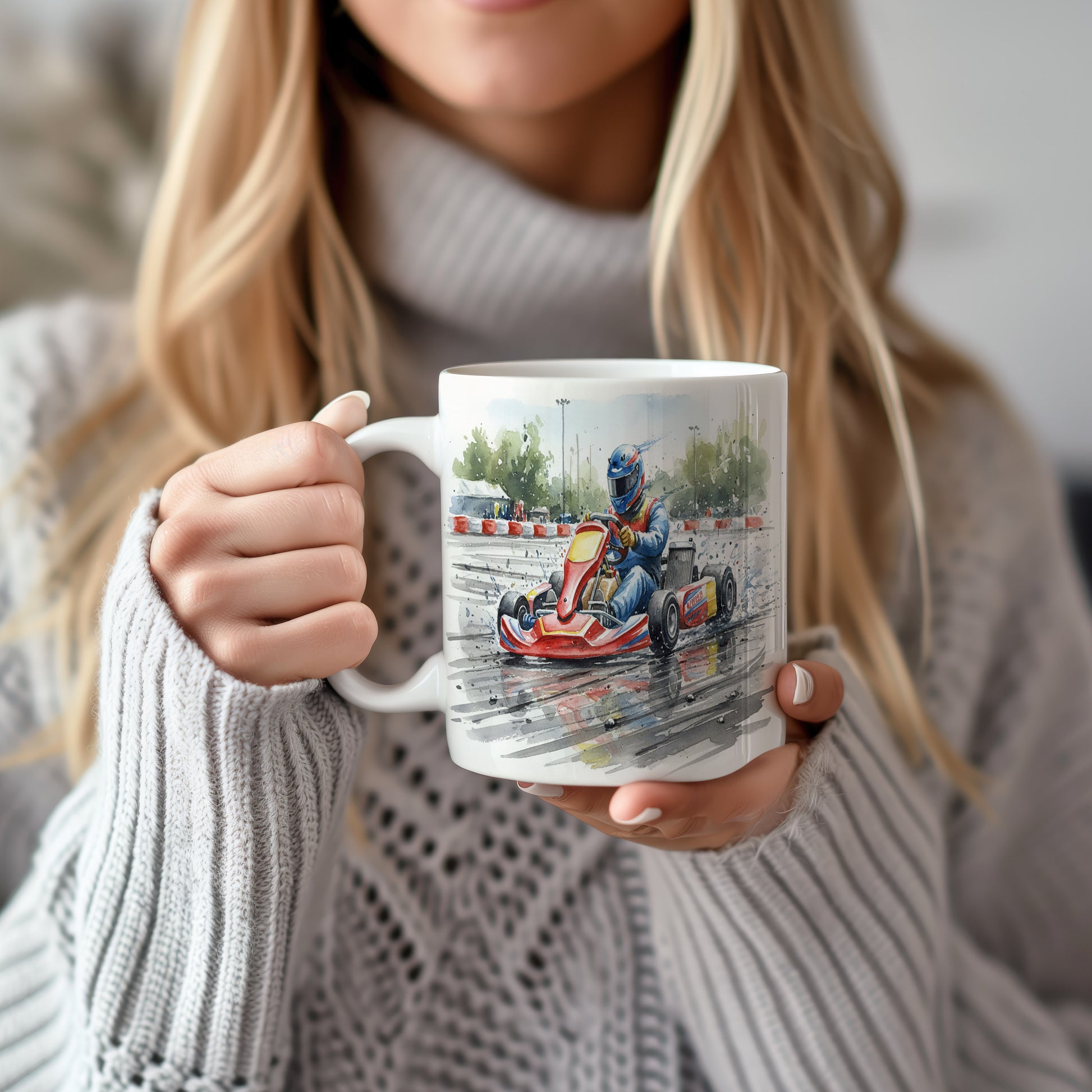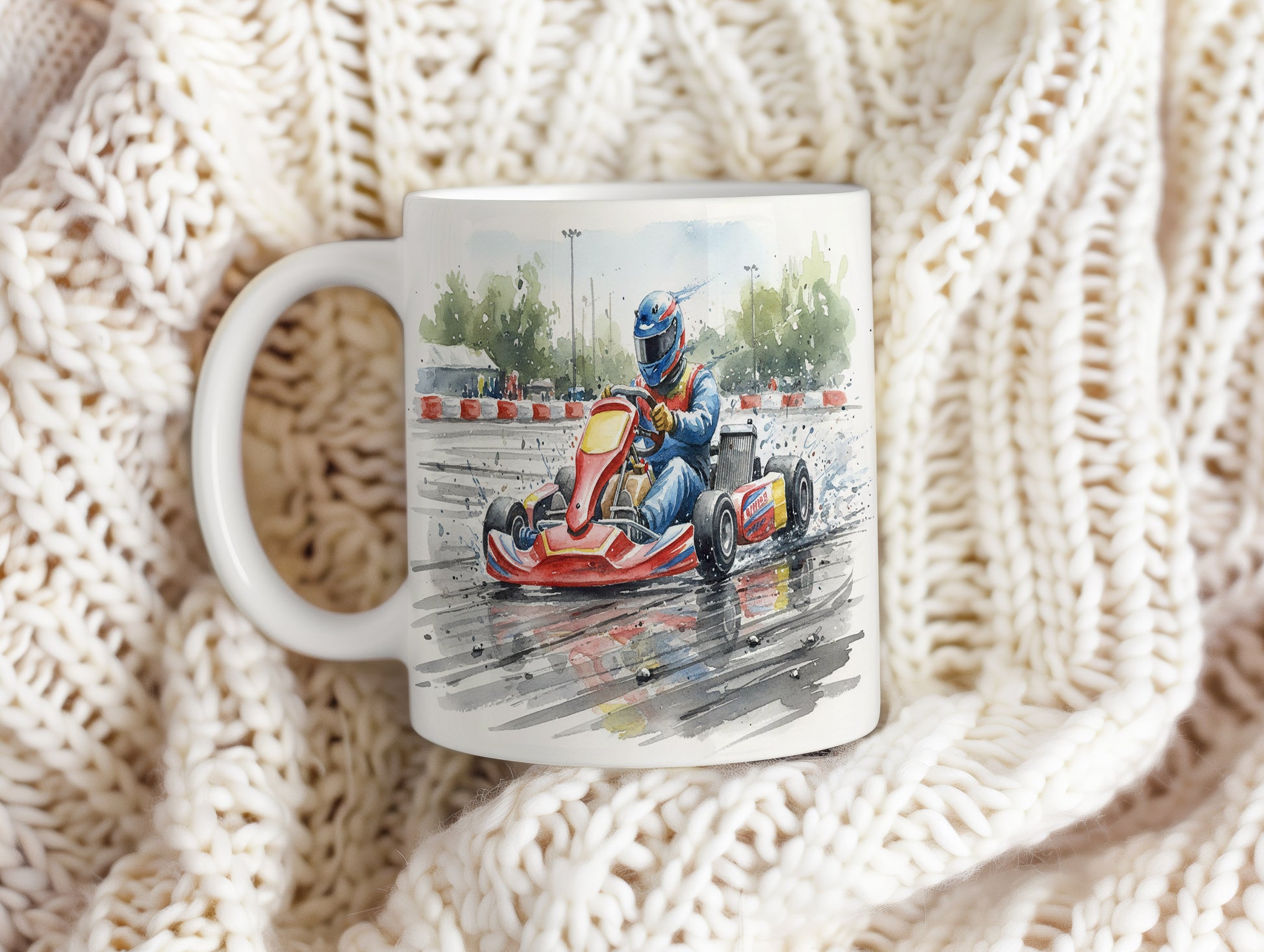 Zažijte adrenalin závodní dráhy s tímto hrnkem, na kterém je akvarelový motiv motokáry v akci. Ideální pro milovníky rychlosti a závodů. Hrnek 330 ml – vhodný do myčky i mikrovlnky.