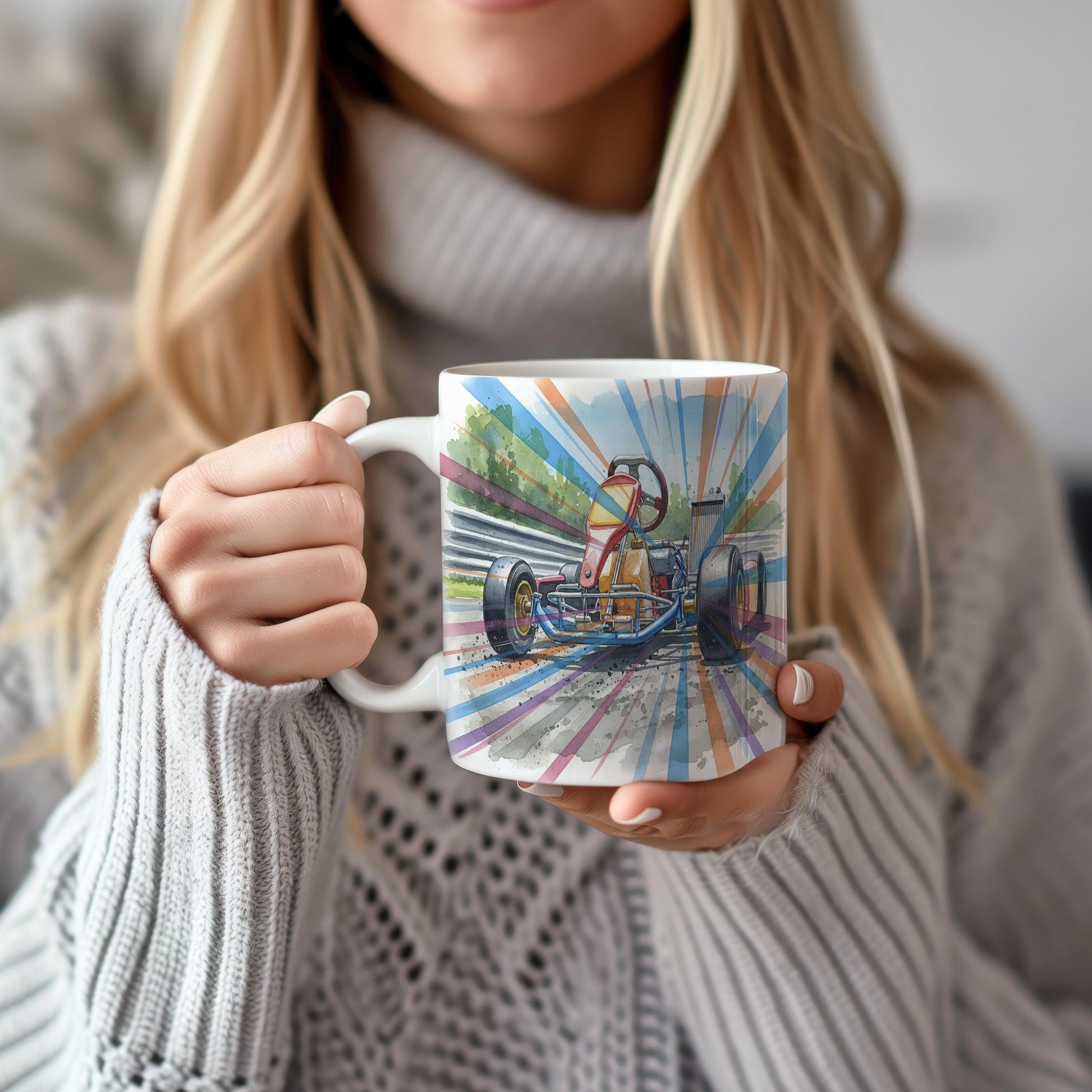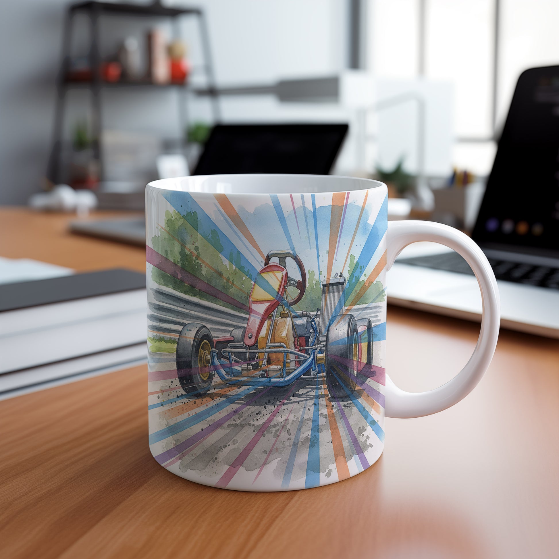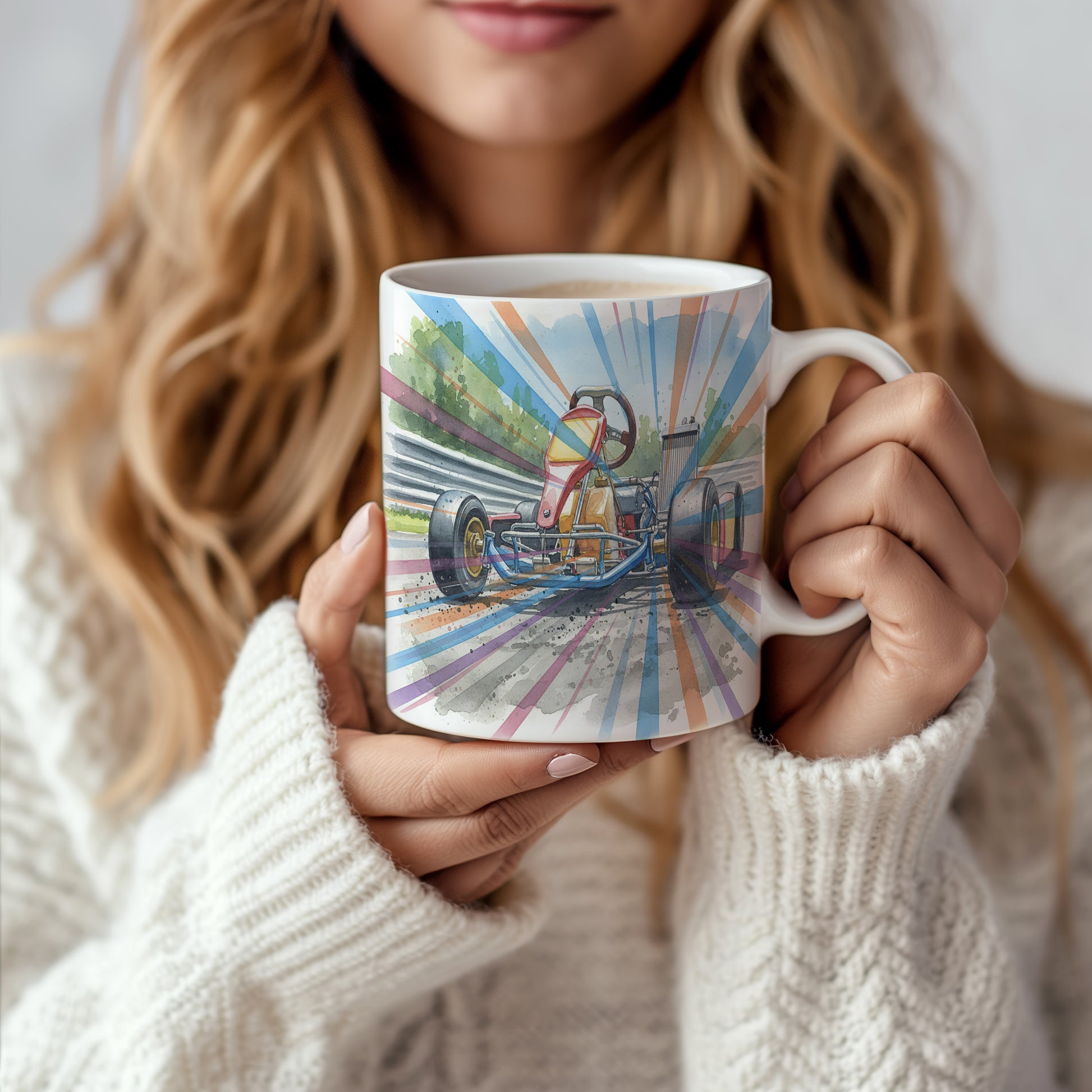 Vychutnejte si svůj oblíbený nápoj s hrnkem s motokárou na závodní dráze v akvarelovém stylu. Dynamický motiv přináší adrenalinovou jízdu přímo do vaší kuchyně. Hrnek 330 ml – vhodný do myčky i mikrovlnky.