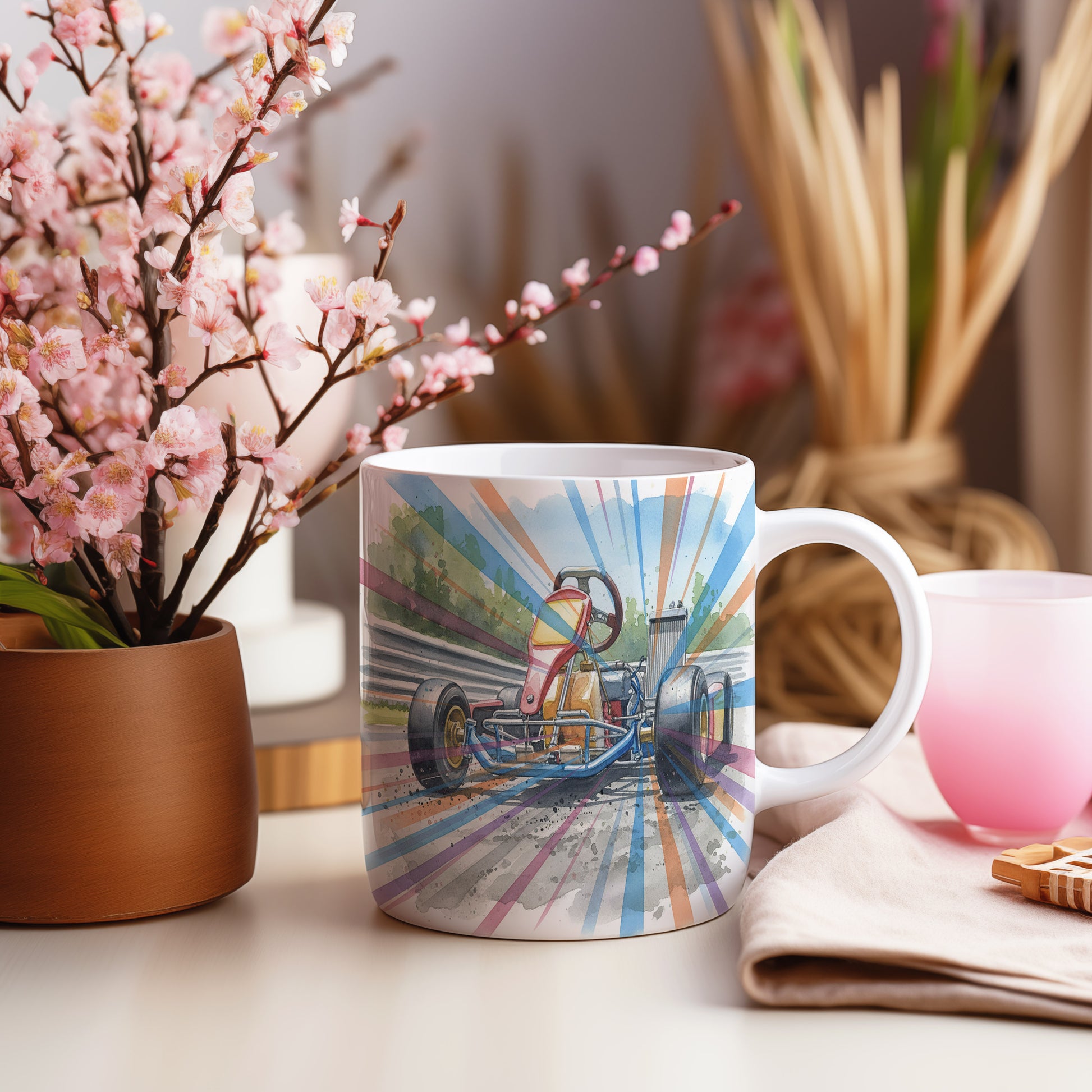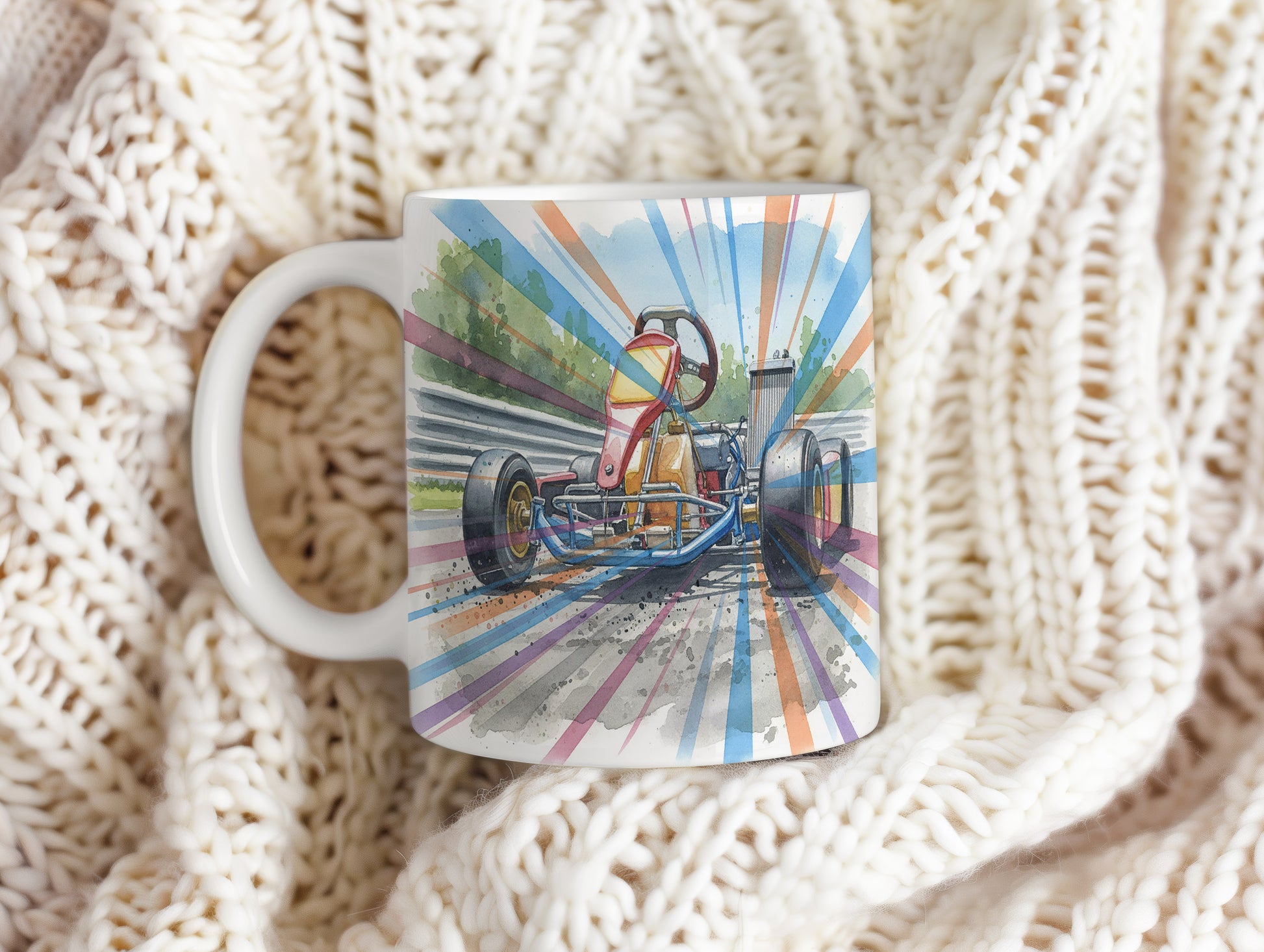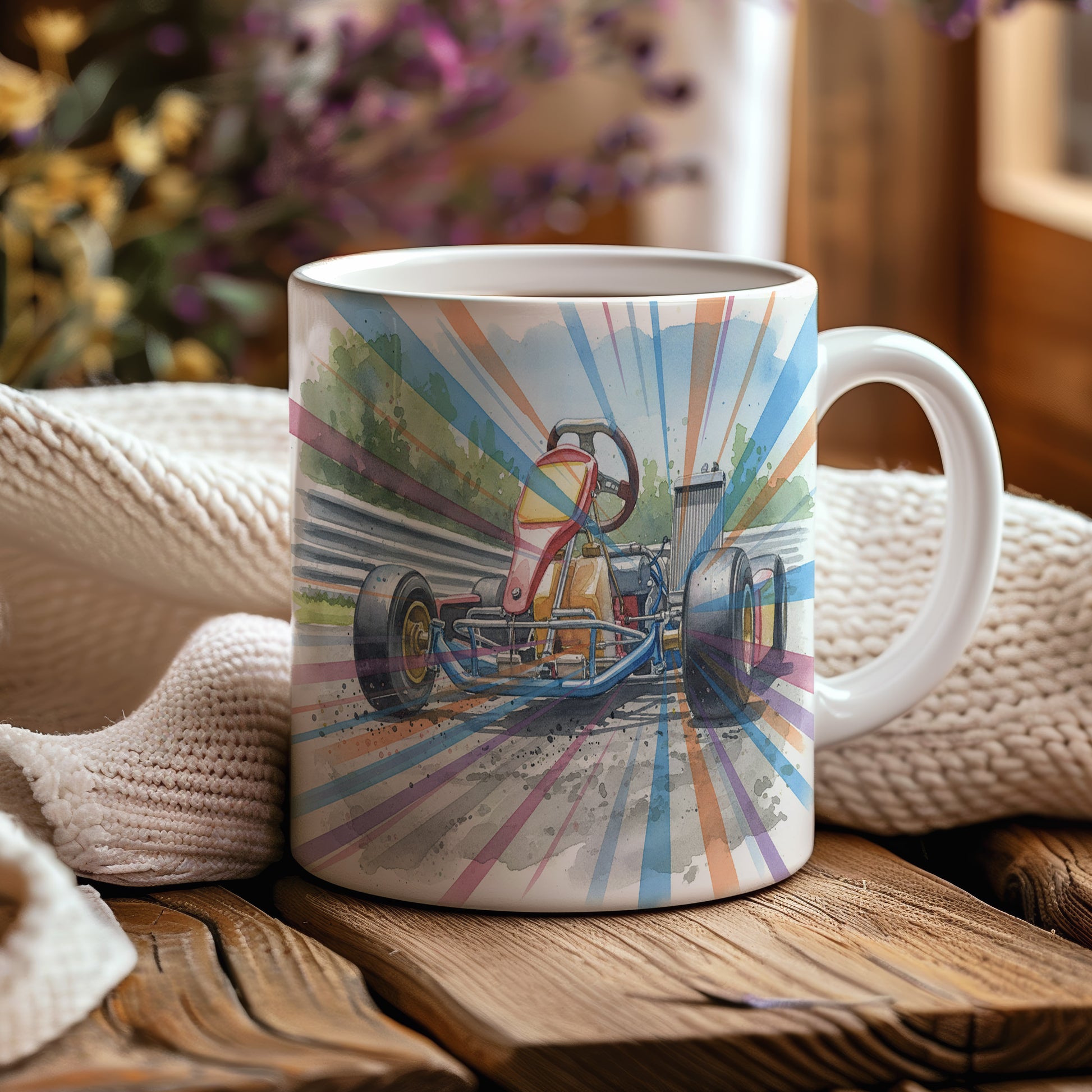 Vychutnejte si svůj oblíbený nápoj s hrnkem s motokárou na závodní dráze v akvarelovém stylu. Dynamický motiv přináší adrenalinovou jízdu přímo do vaší kuchyně. Hrnek 330 ml – vhodný do myčky i mikrovlnky.