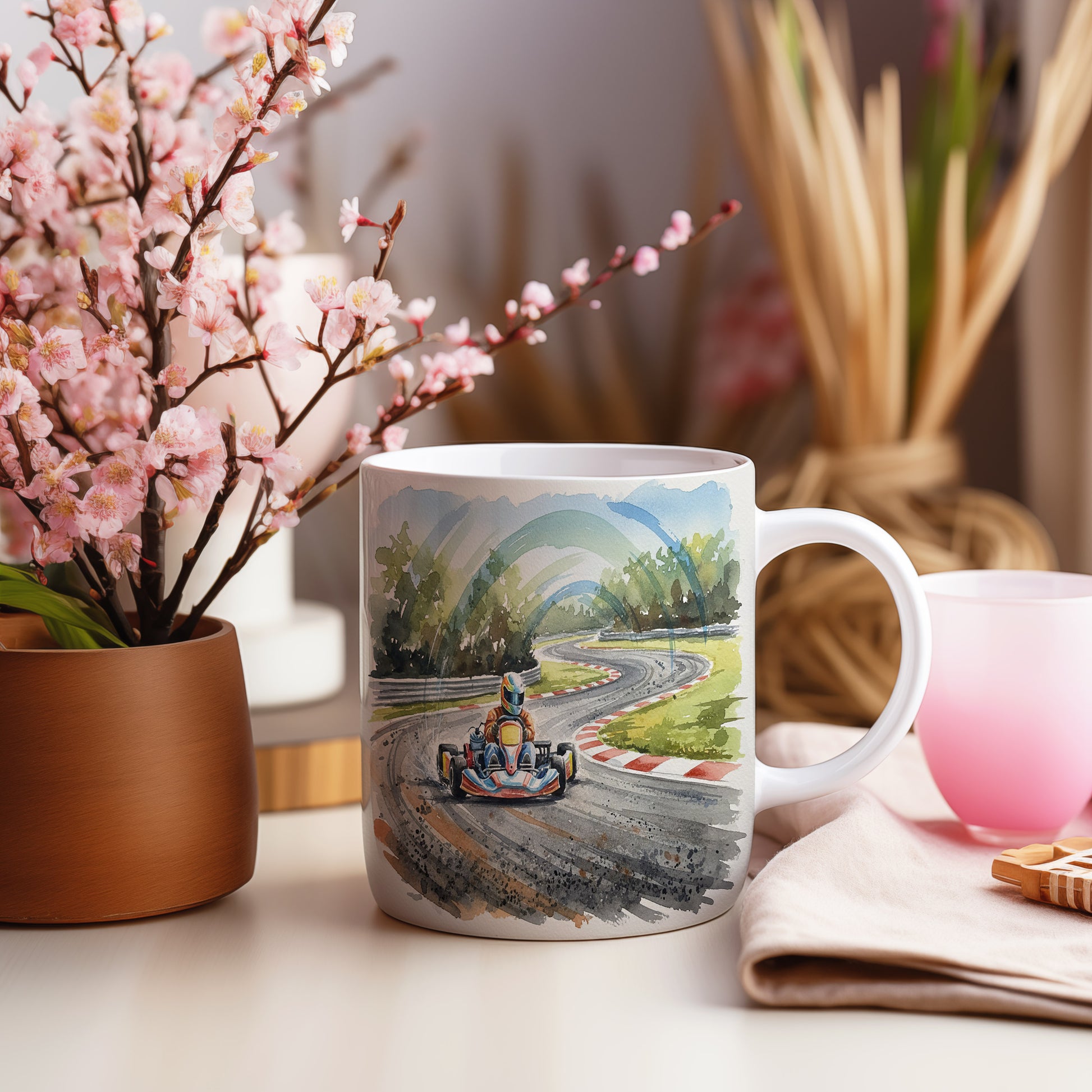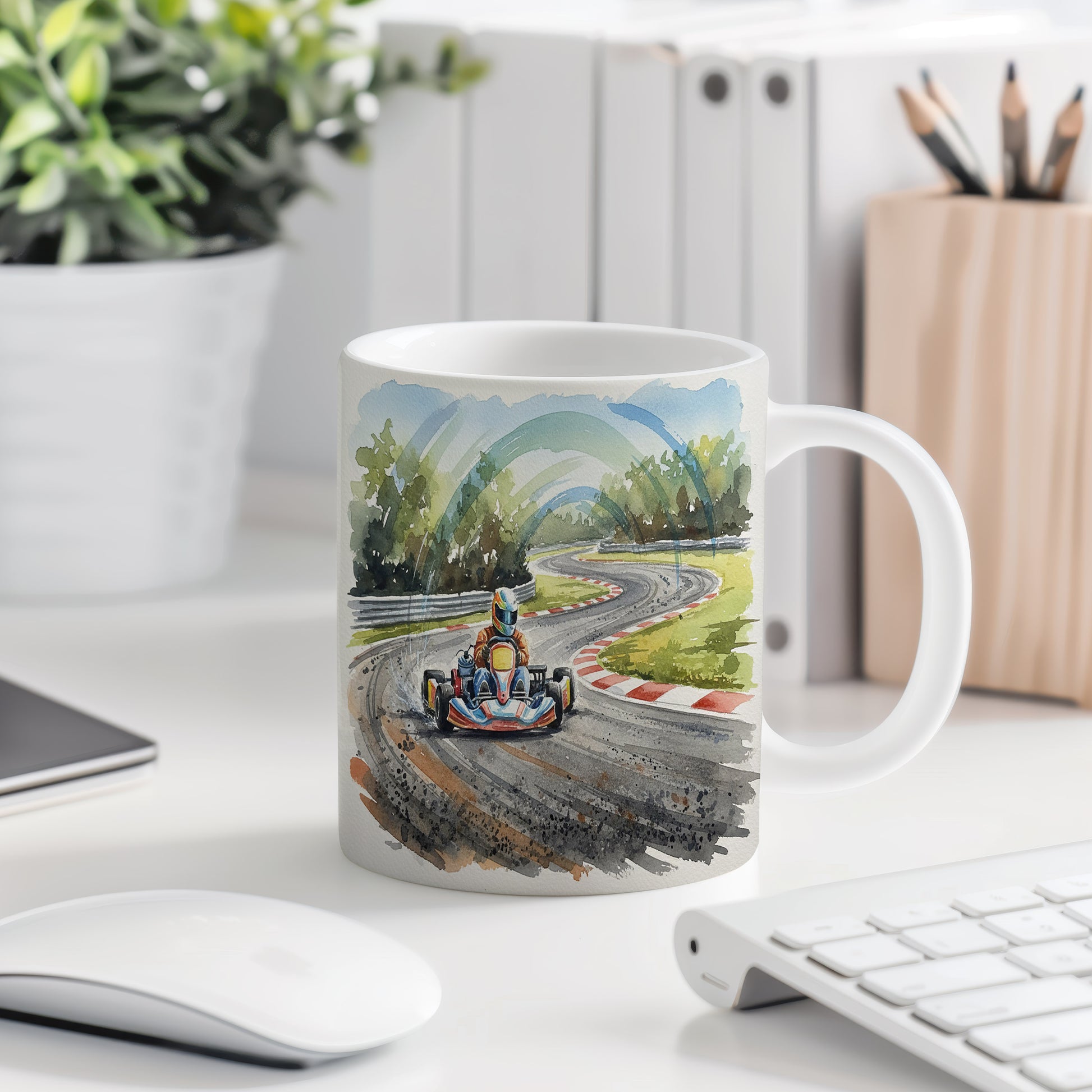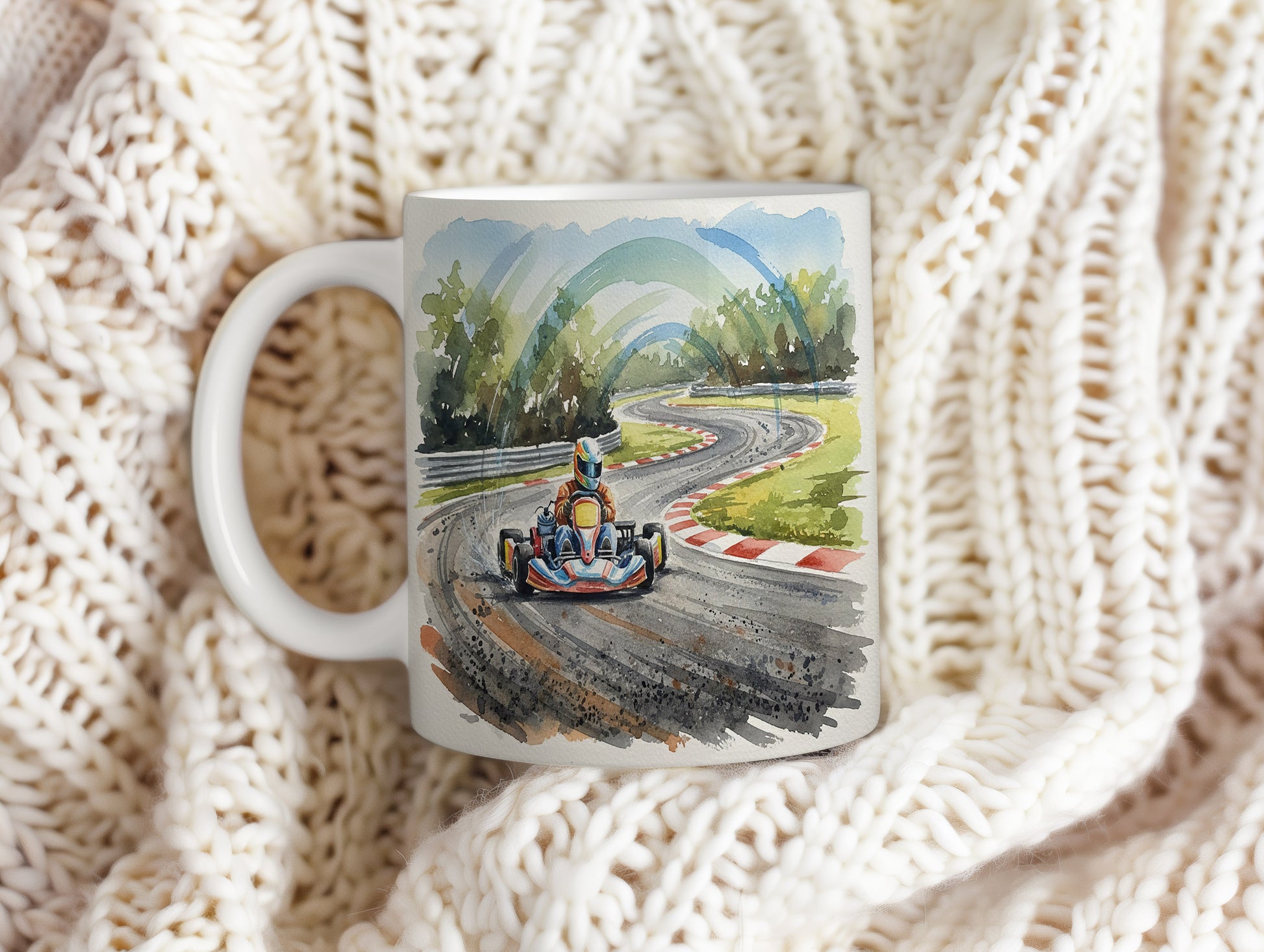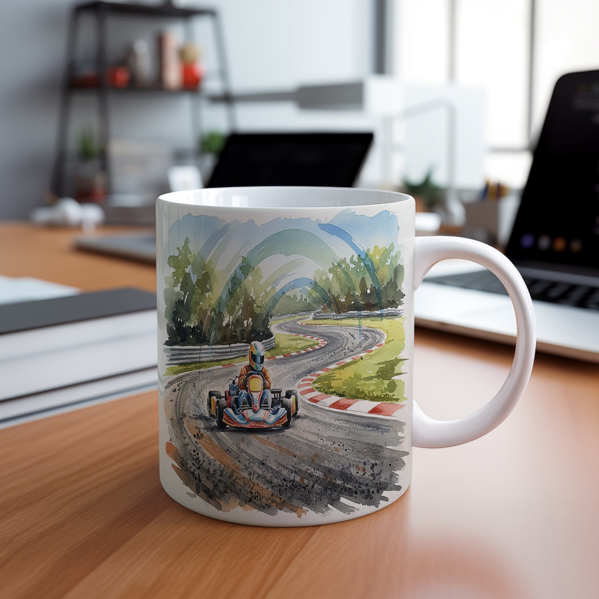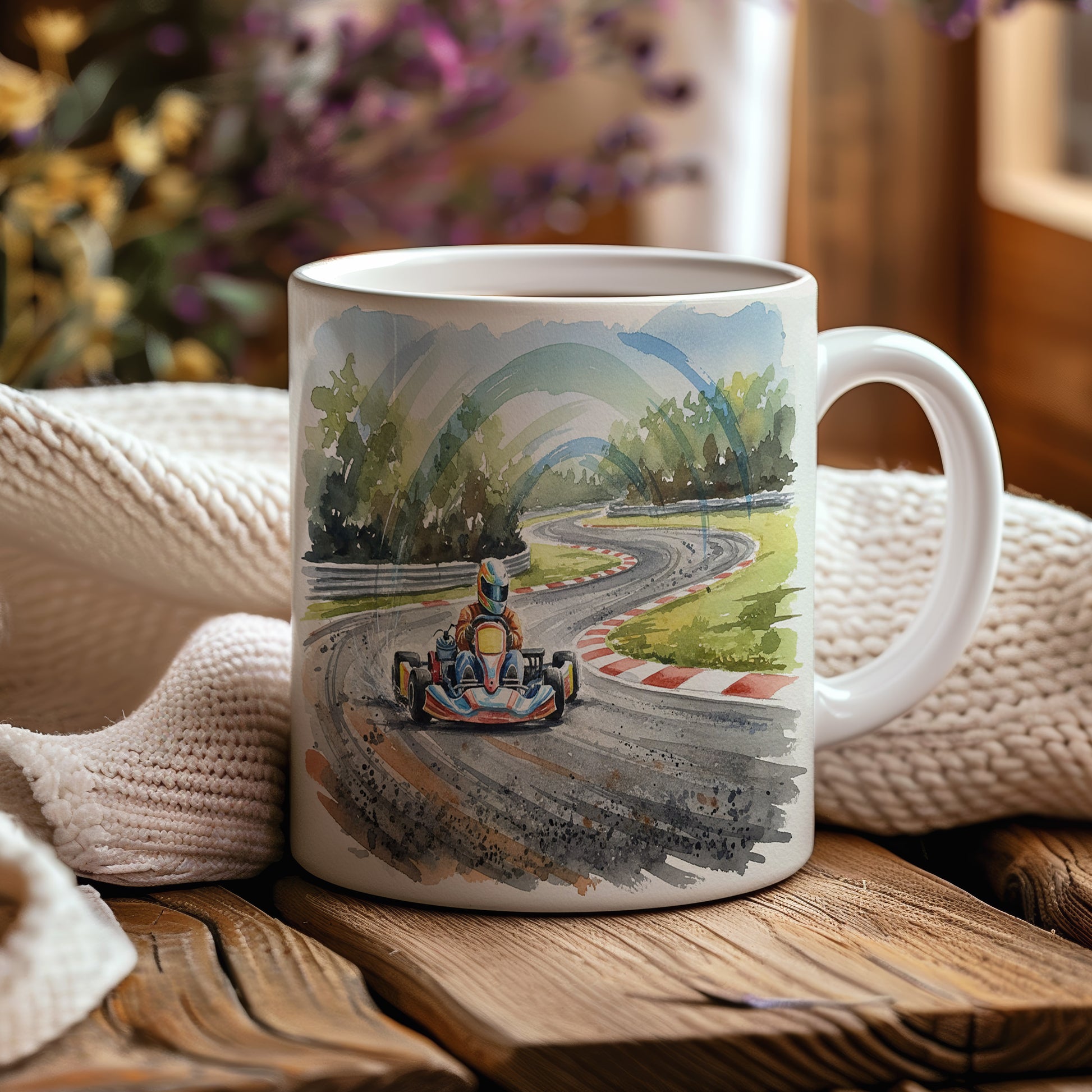 Vychutnejte si svůj oblíbený nápoj s hrnkem, který zachycuje dynamiku motokáry na závodní trati. Akvarelové provedení přináší pocit rychlosti a adrenalinu. Hrnek 330 ml – vhodný do myčky i mikrovlnky.