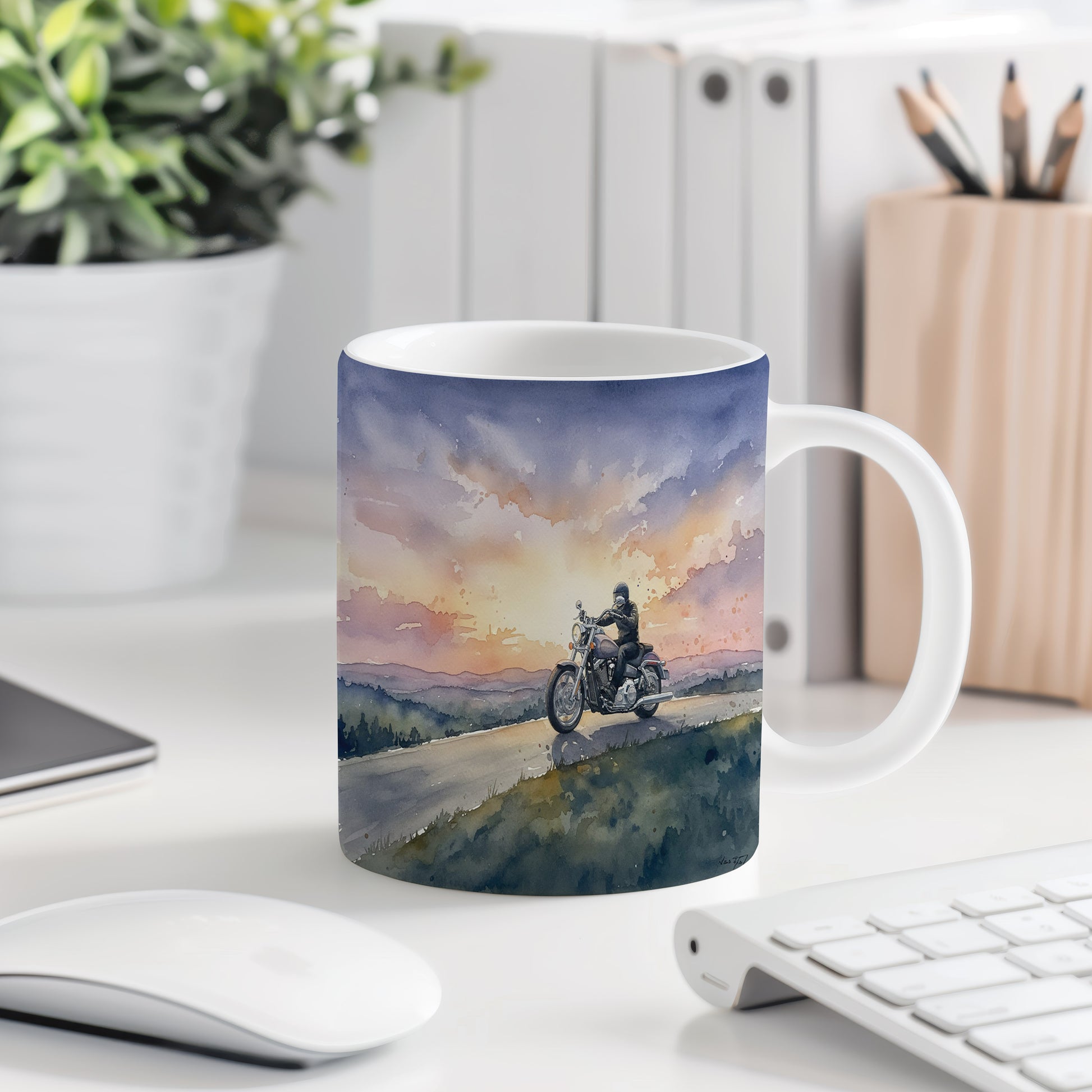 Objevte kouzlo jízdy na motocyklu s tímto hrnkem, který zachycuje motorkáře na silnici při nádherném západu slunce. Hrnek 330 ml – vhodný do myčky i mikrovlnky.