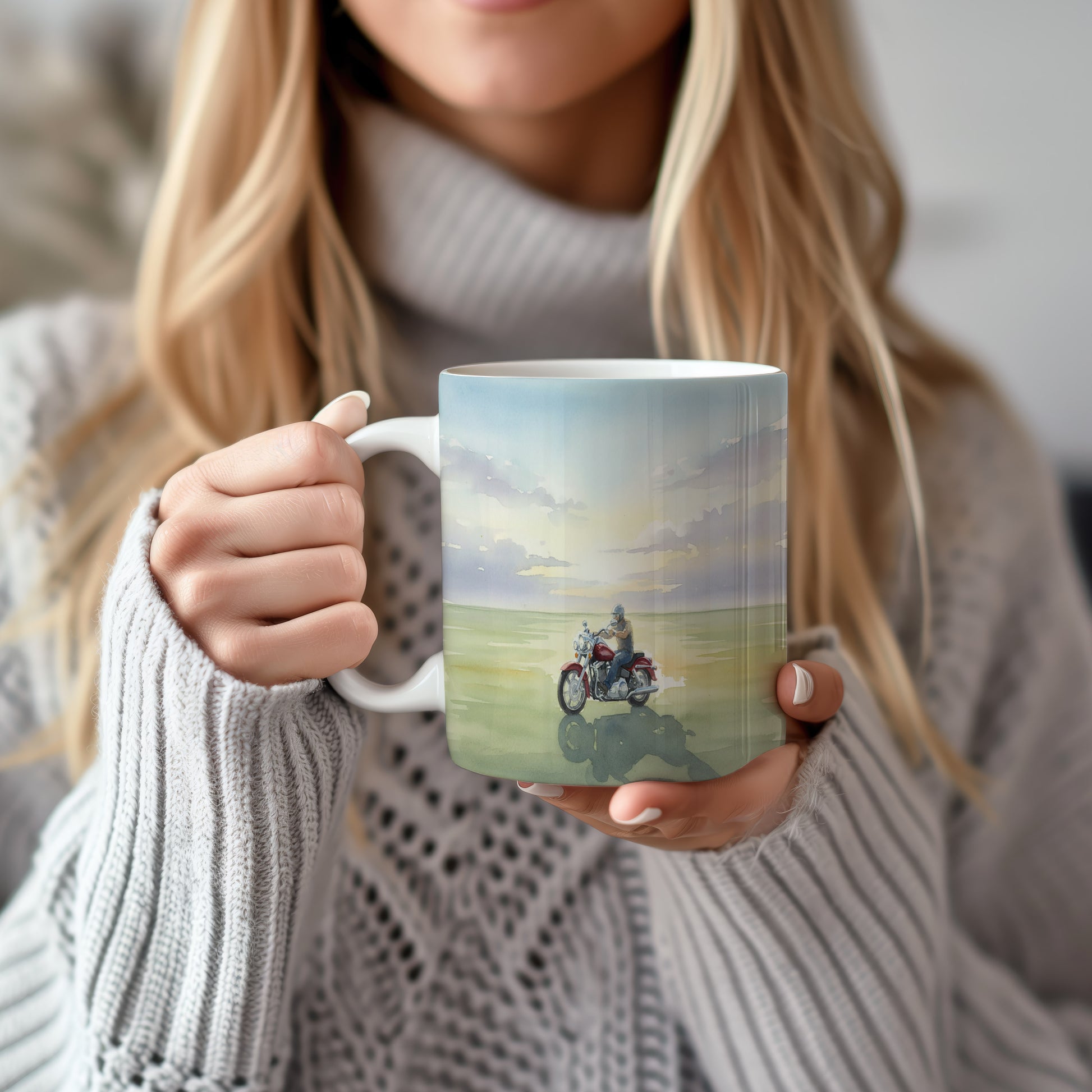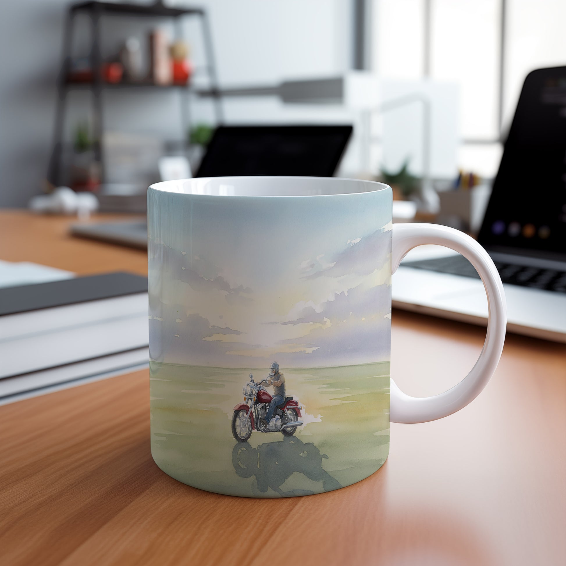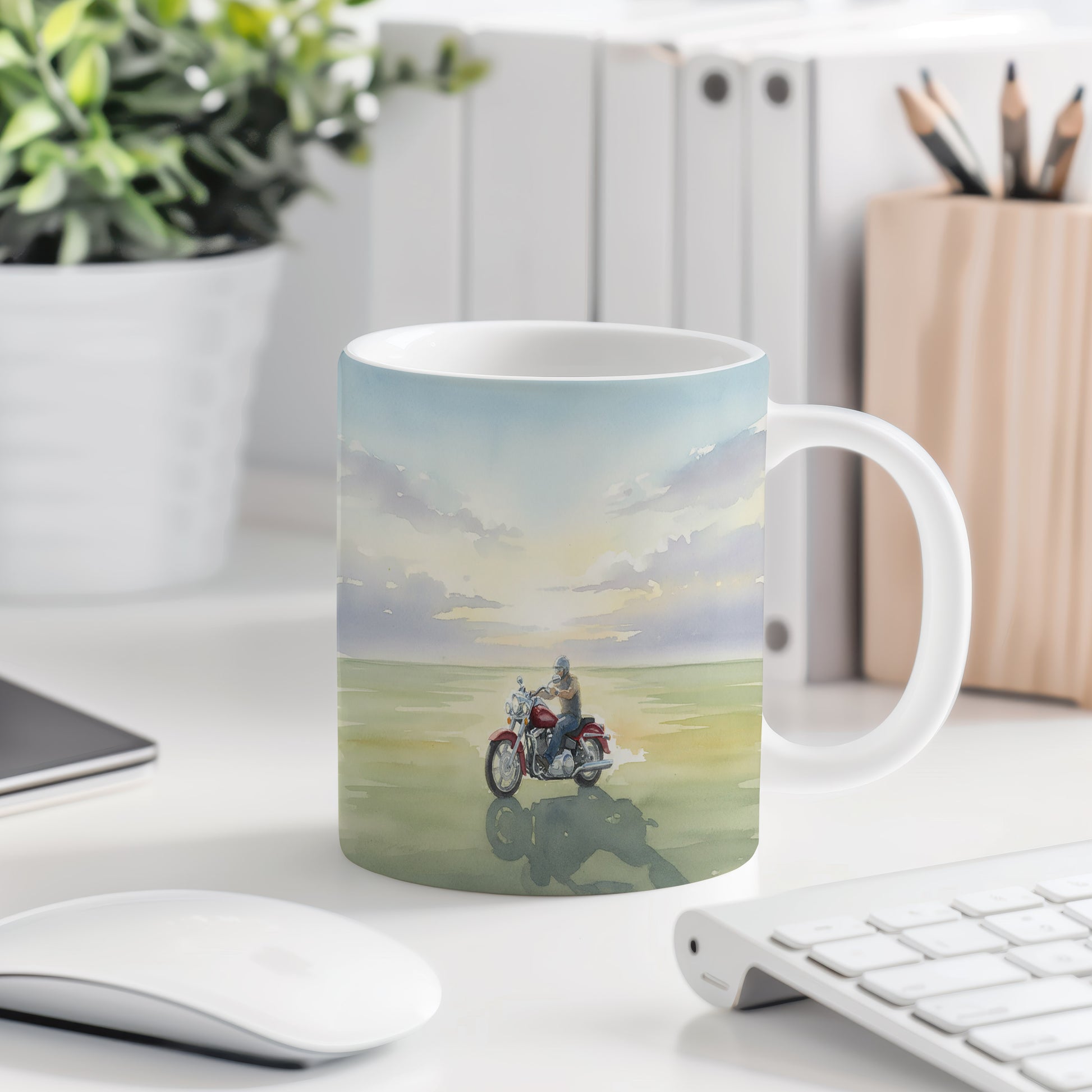 Zažijte svobodu a dobrodružství s tímto hrnkem, na kterém se motorkář vydává na cestu proti západu slunce. Jemné akvarelové barvy vytvářejí poklidnou atmosféru.