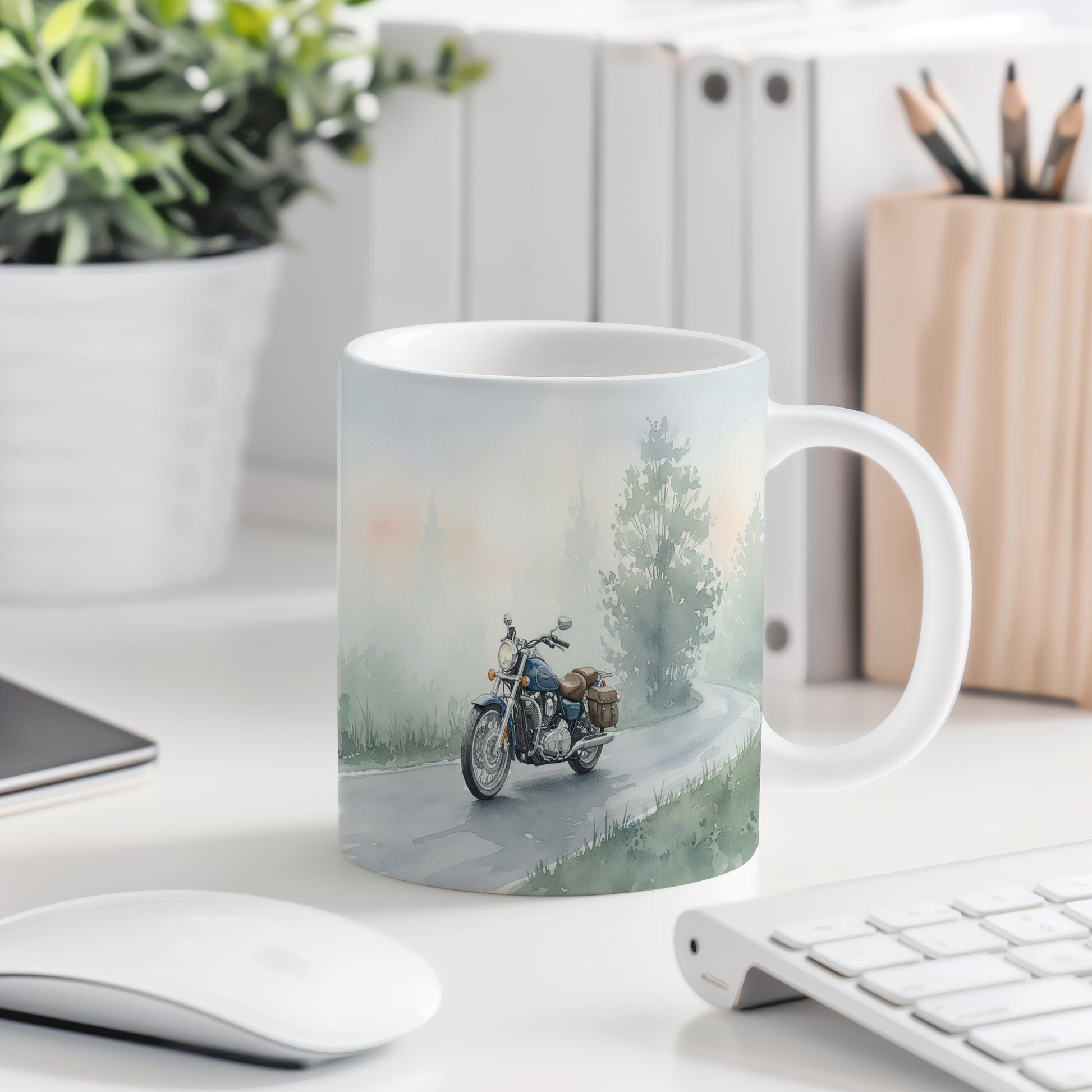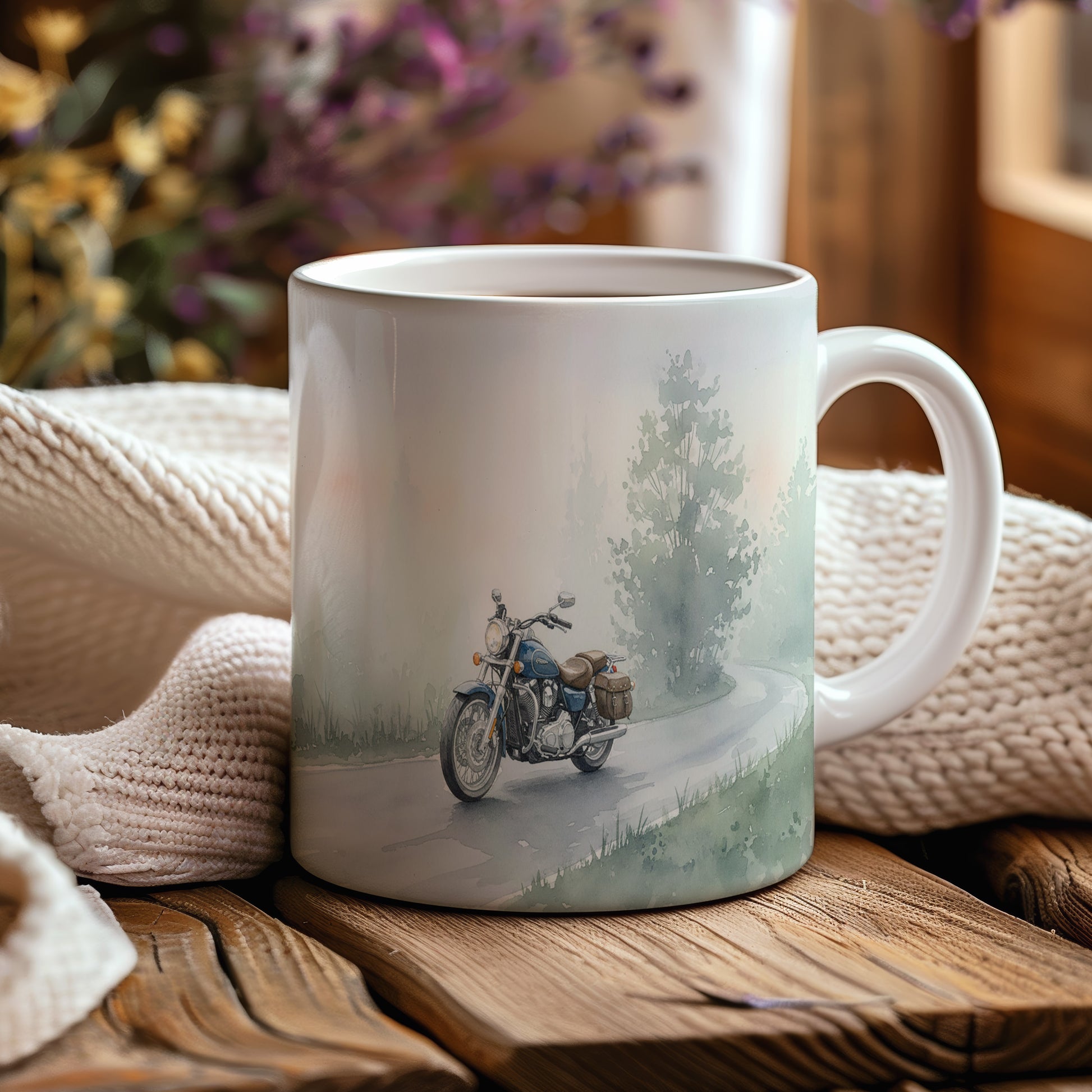 Objevte kouzlo akvarelu s motorkou na klidné lesní cestě, která dodá vašemu dni nádech dobrodružství. Hrnek 330 ml – vhodný do myčky i mikrovlnky.