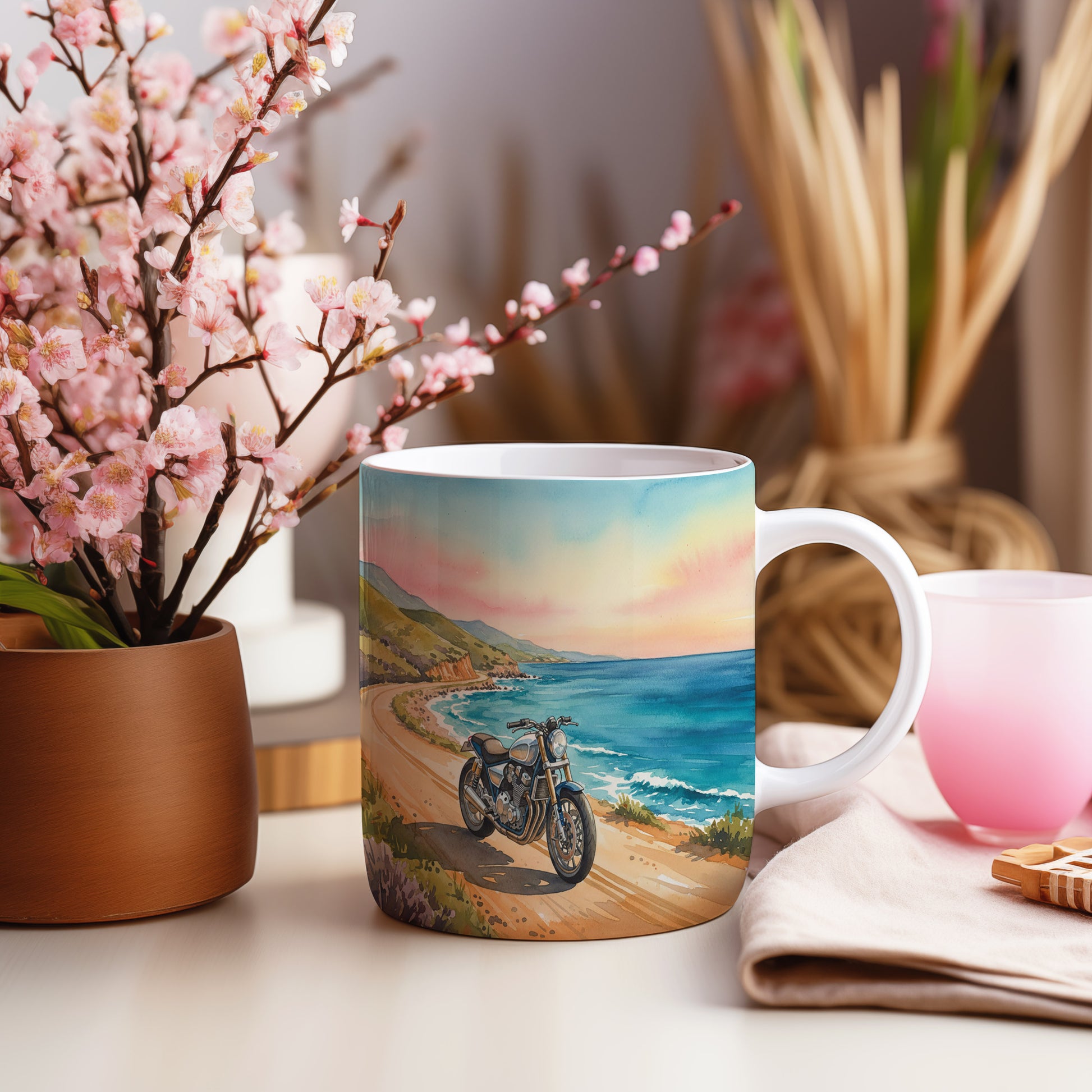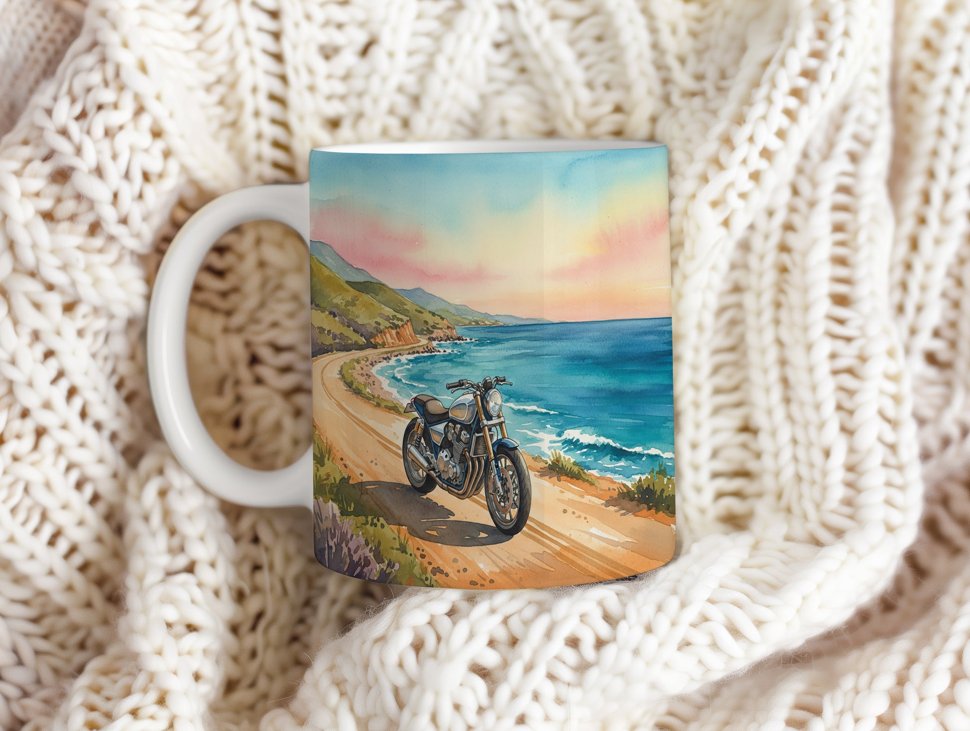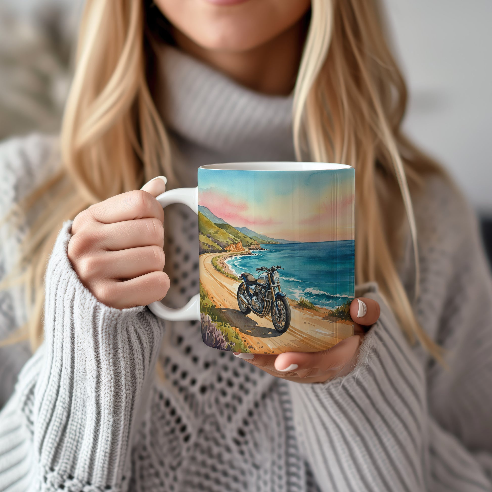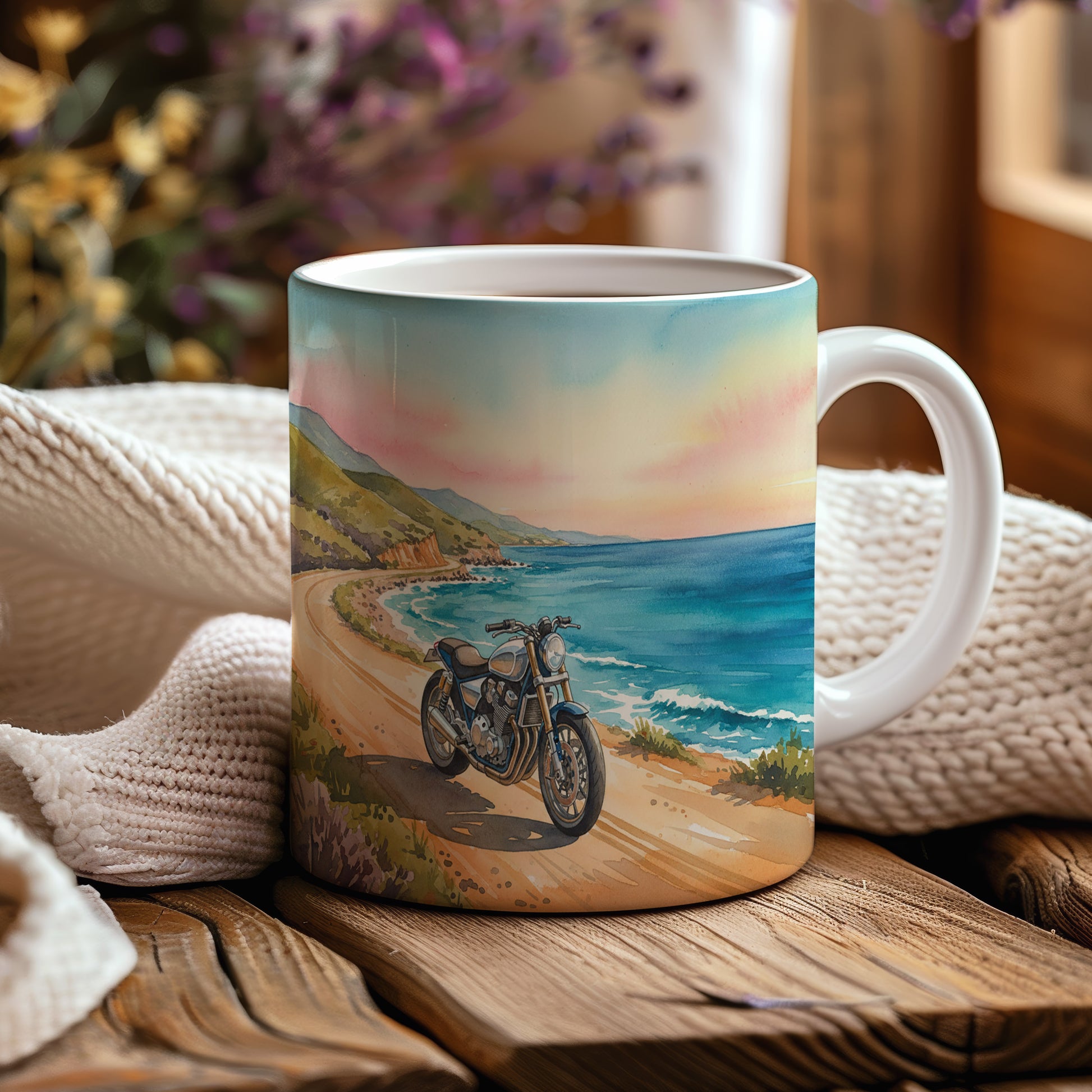 Objevte kouzlo jízdy na motocyklu podél malebného pobřeží. Akvarelový motiv zachycuje krásný západ slunce nad oceánem. Hrnek 330 ml – vhodný do myčky i mikrovlnky.