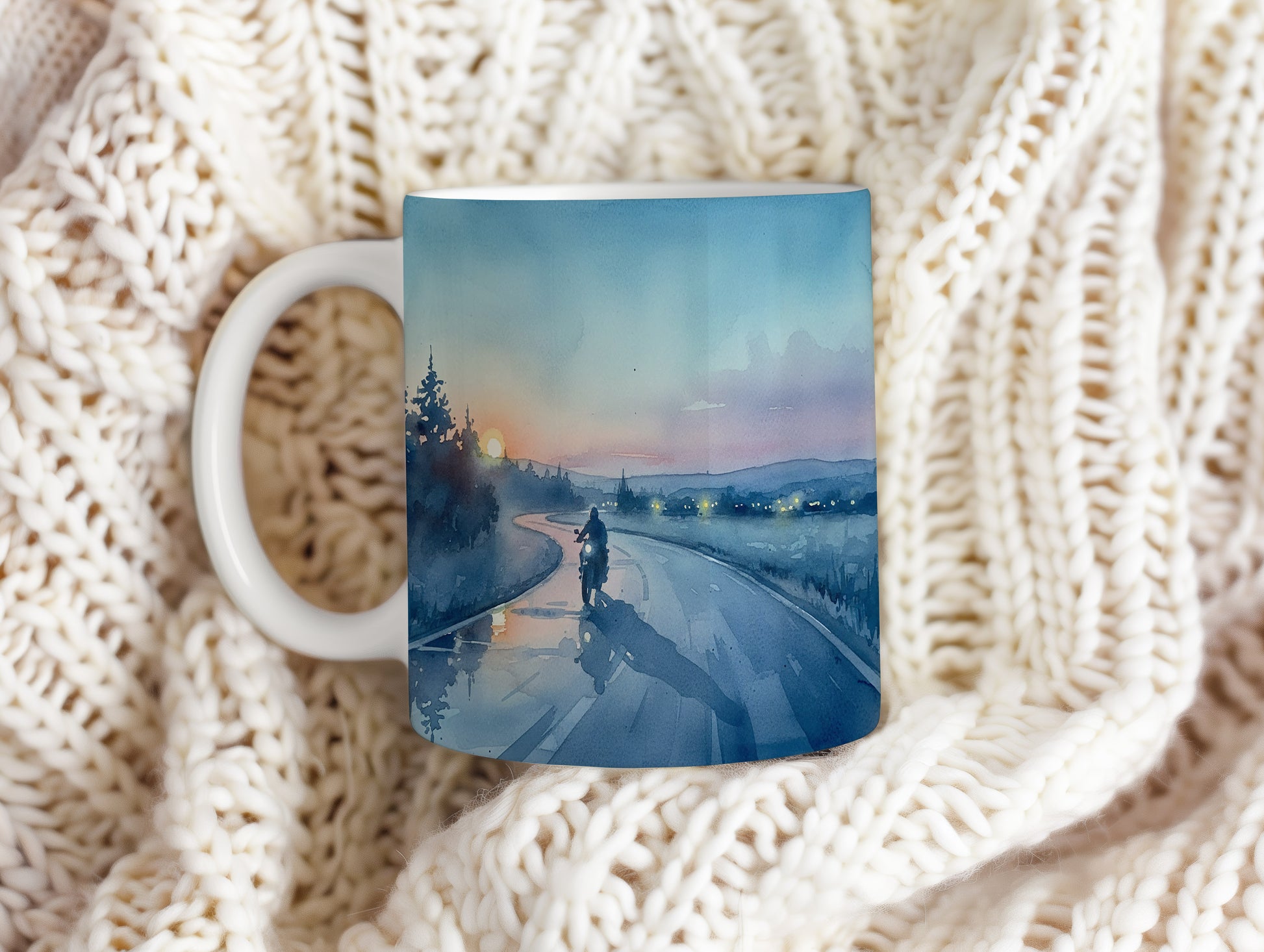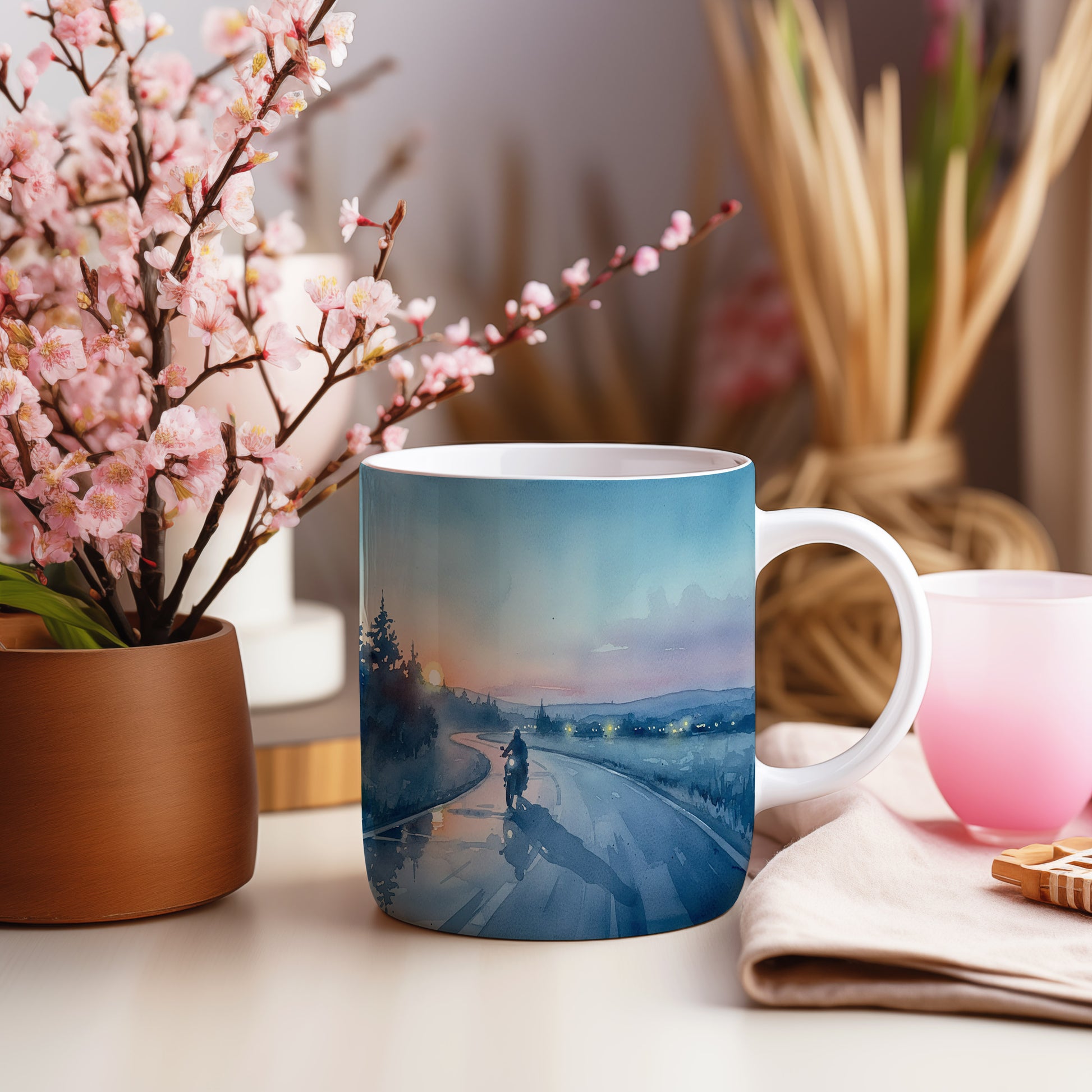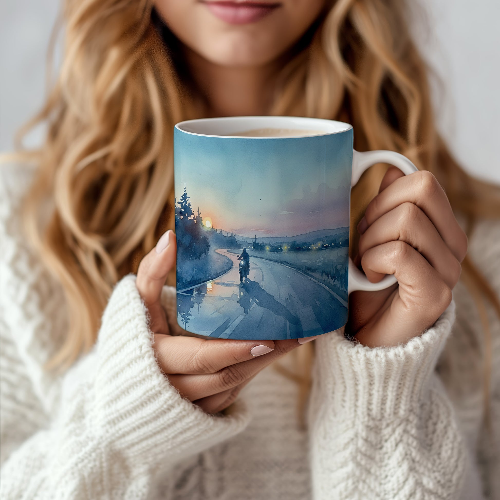 Akvarelový motiv motorky na otevřené silnici při západu slunce. Ideální pro milovníky volné jízdy a romantiky. Hrnek 330 ml – vhodný do myčky i mikrovlnky.