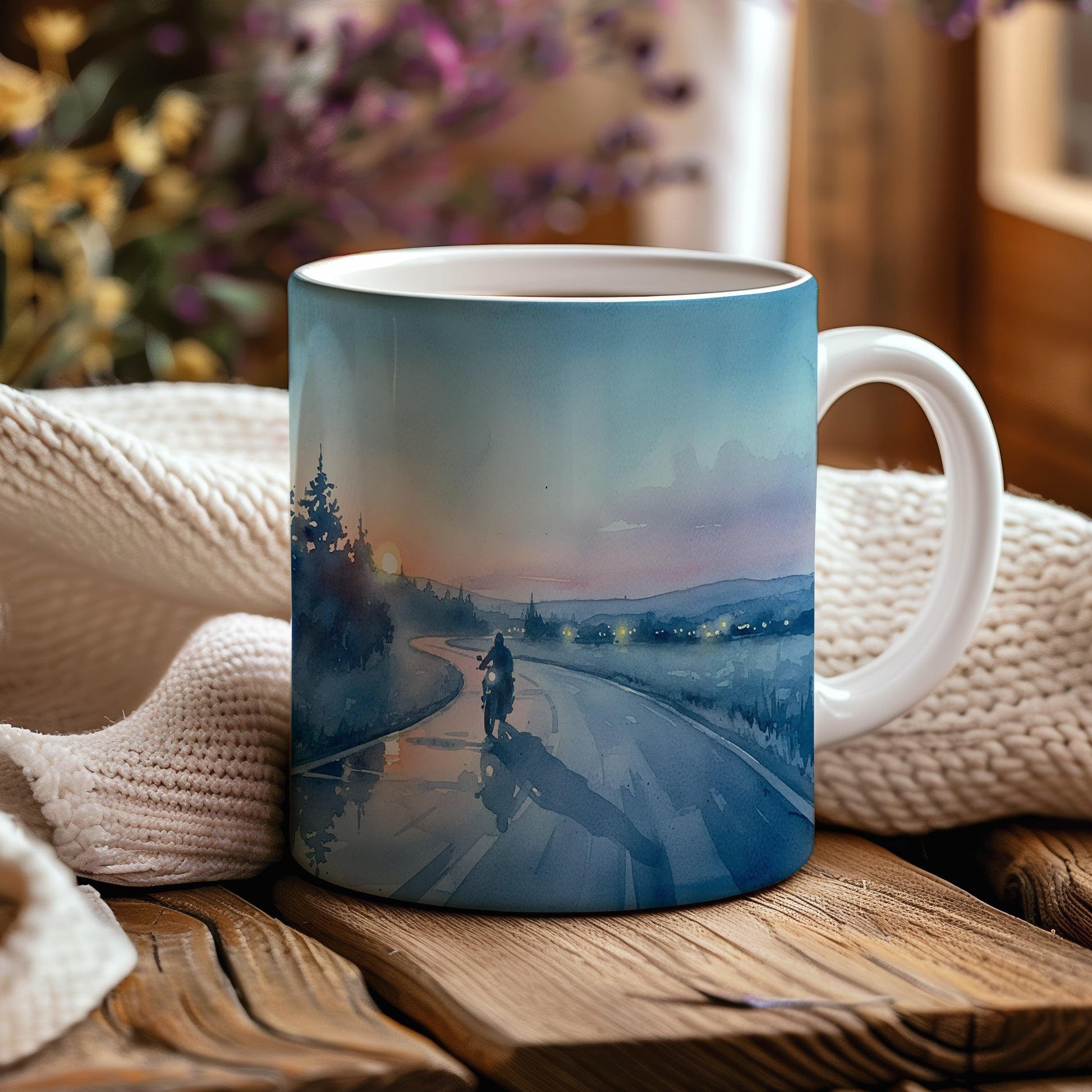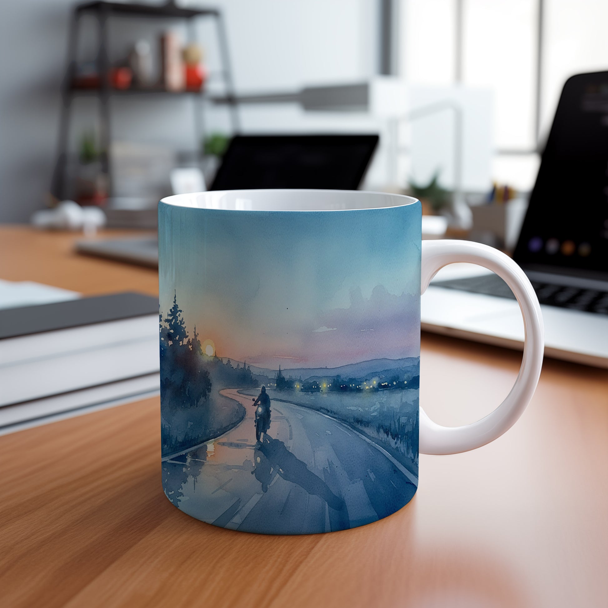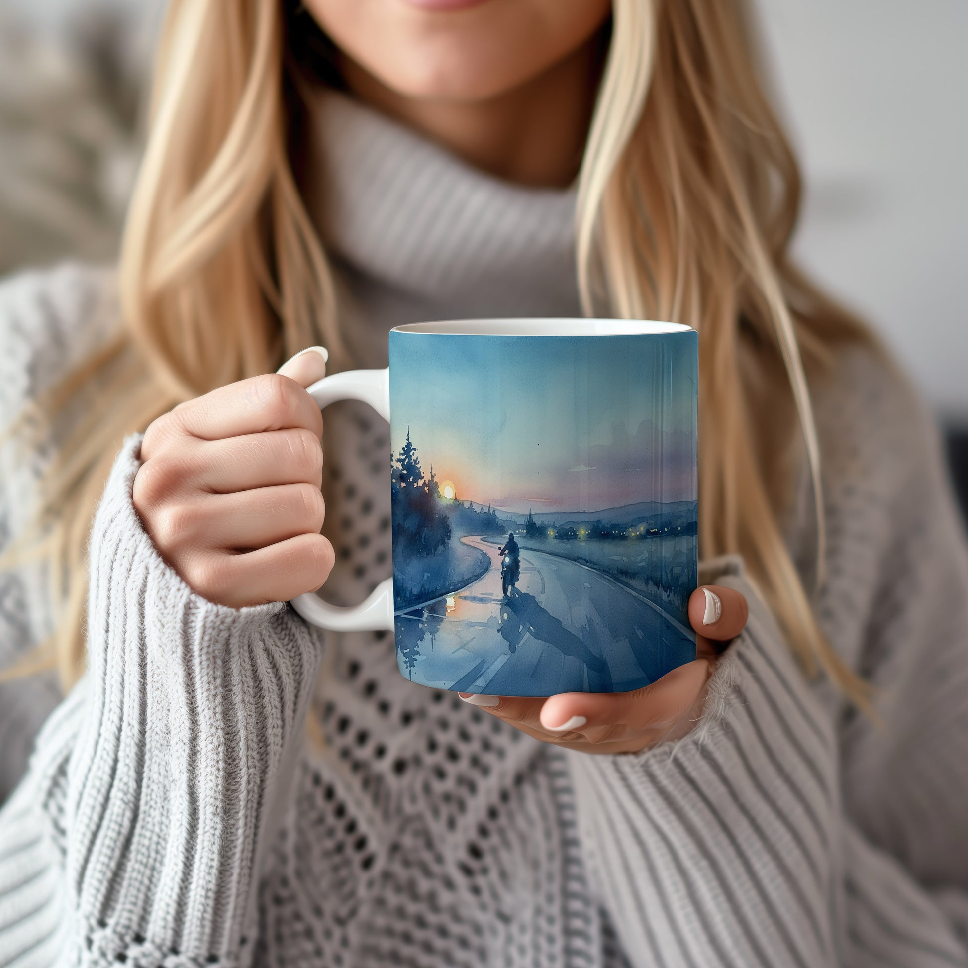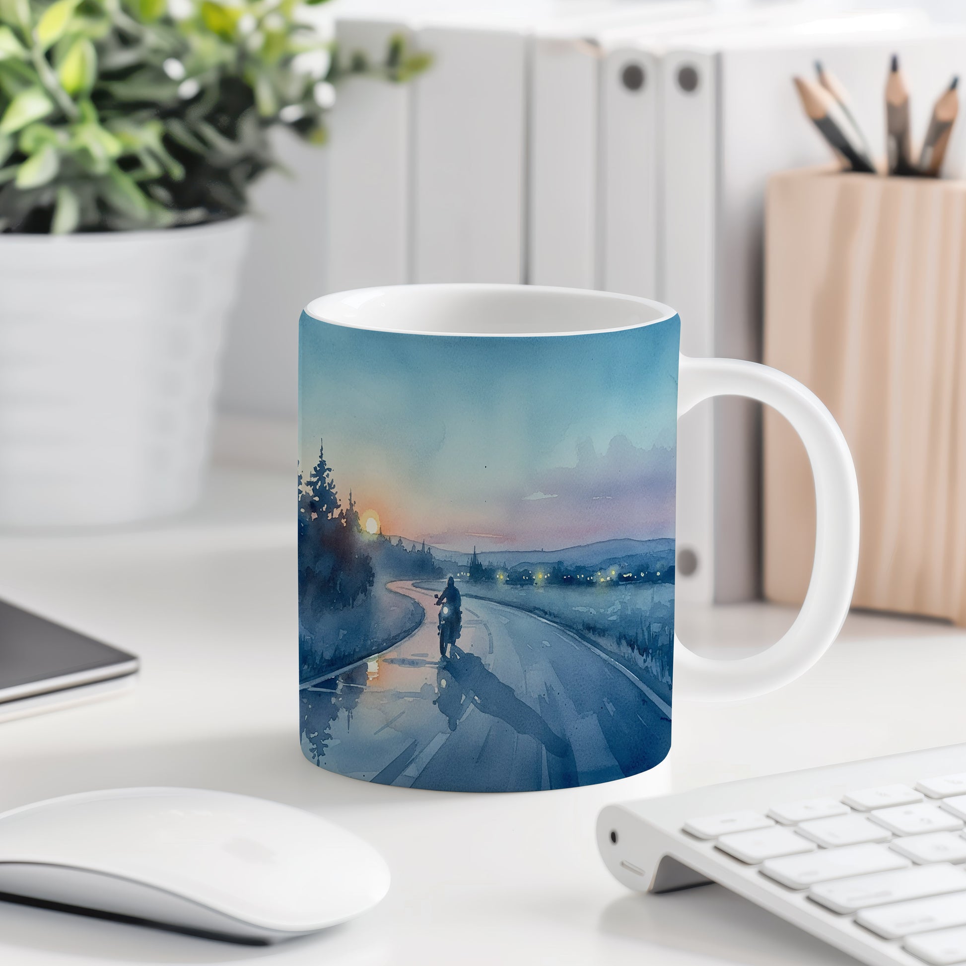 Akvarelový motiv motorky na otevřené silnici při západu slunce. Ideální pro milovníky volné jízdy a romantiky. Hrnek 330 ml – vhodný do myčky i mikrovlnky.